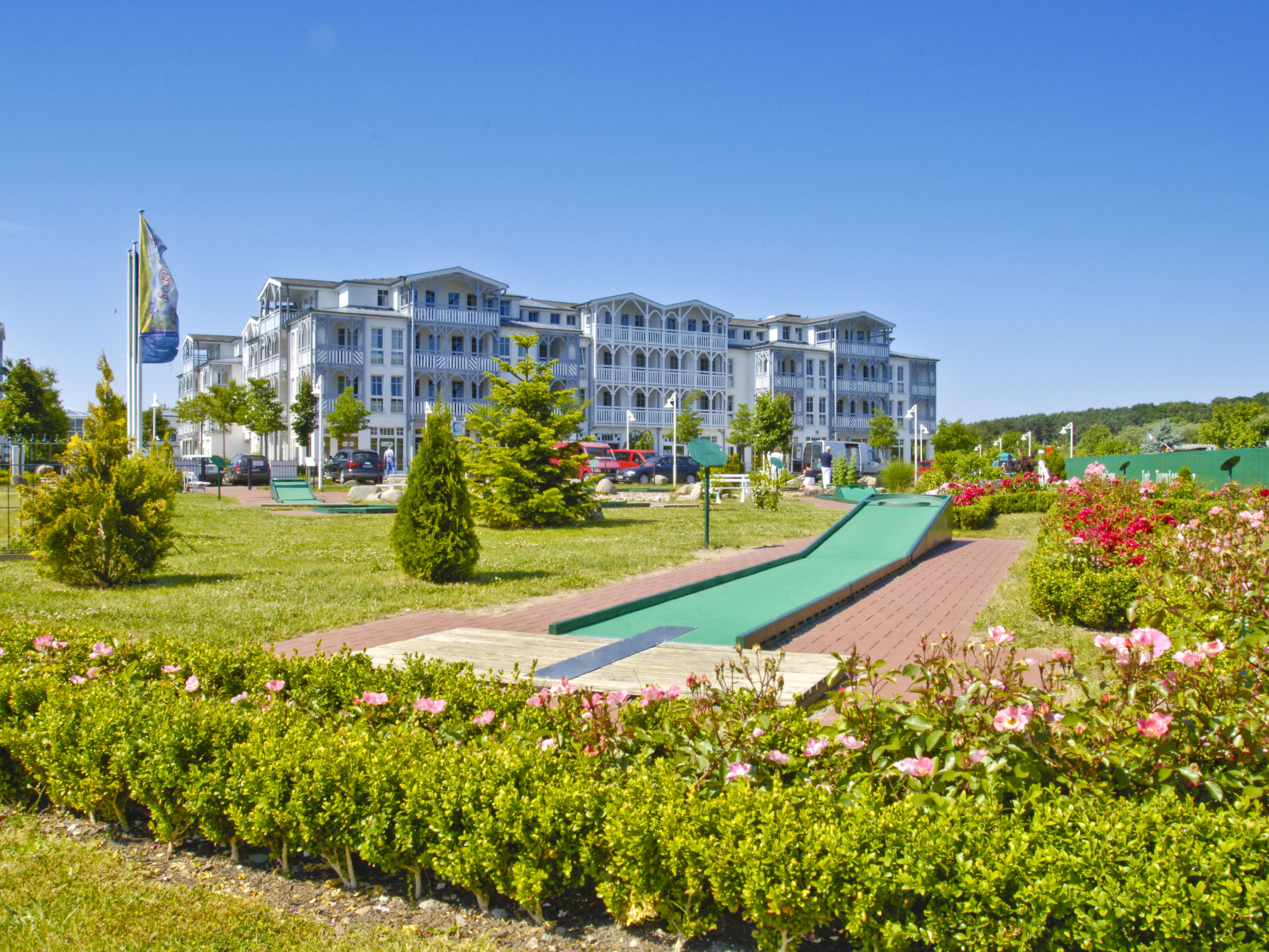 Ferienanlage "Seepark Sellin", auf 4 Stockwerken. 8 Häuser in der Residenz. 200 Wohnungen in der Residenz. 800 m vom Zentrum von Sellin, am Ortsrand, 8 km vom Zentrum von Göhren, 10 km vom Zentrum von Binz, 800 m vom Meer. Zur Mitbenutzung: Grundstück, gepflegter Garten mit Rasen. Tischtennis, Kinderspielplatz. Zur Alleinbenutzung: Kinderspielplatz. In der Anlage: Empfang, Restaurant, Fitnessraum, Tischtennis, Tischfussball, Boutique, Einstellraum für Fahrräder, Zentralheizung, Waschmaschine (extra), Wäschetrockner (zur Mitbenutzung, extra), Fahrradverleih. Brötchenservice. Gemeinschaftsgarage (extra). Supermarkt 100 m, Bushaltestelle "Sellin, Hauptstrasse" 700 m, Bahnstation "Sellin Ost" 400 m, Sandstrand 800 m, Hallenbad 100 m. Das Foto ist nur ein Wohnungsbeispiel. Alle Häuser/Wohnungen sind individuell eingerichtet. 3 kostenlose SKY-Sender inklusive. Badewelt AHOI ca. 100m, Rabatt hierfür an der Rezeption.