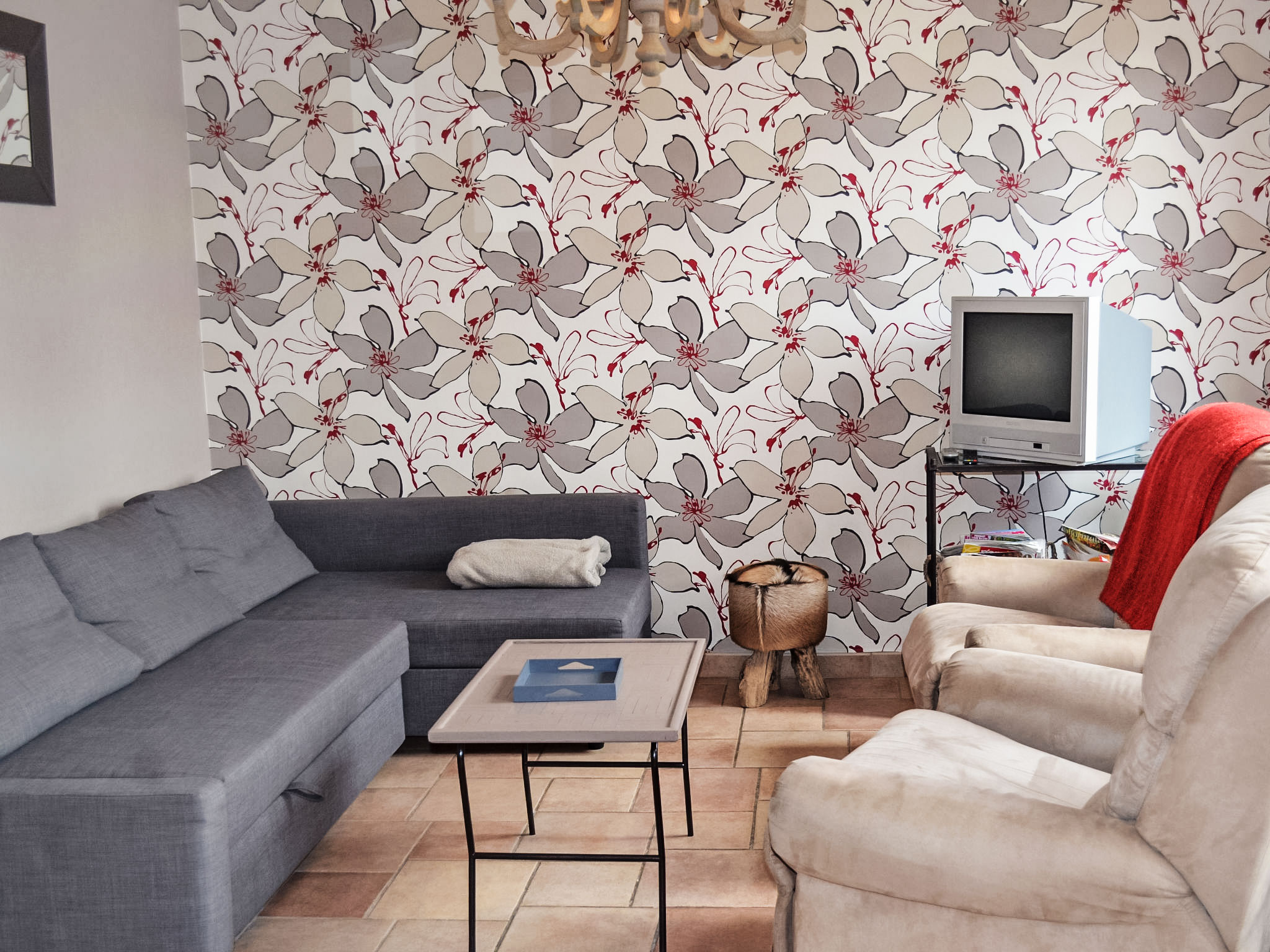 "La Ferme de Gabrielle", 3-Zimmer-Bauernhaus 120 m2 auf 2 Stockwerken. Komfortabel eingerichtet: Wohn-/Schlafzimmer mit 1 Doppeldiwanbett, offenem Kamin, TV, Radio und DVD. Ausgang zur Terrasse. 1 Zimmer mit 2 Betten und 1 Doppelbett. Küche (4 Kochplatten, Backofen, Geschirrspüler, Mikrowelle, elektrische Kaffeemaschine). Bad/Dusche/WC. Obergeschoss: Zwischenstock mit 2 Betten. Maximal 2 Haustiere/Hunde erlaubt.
