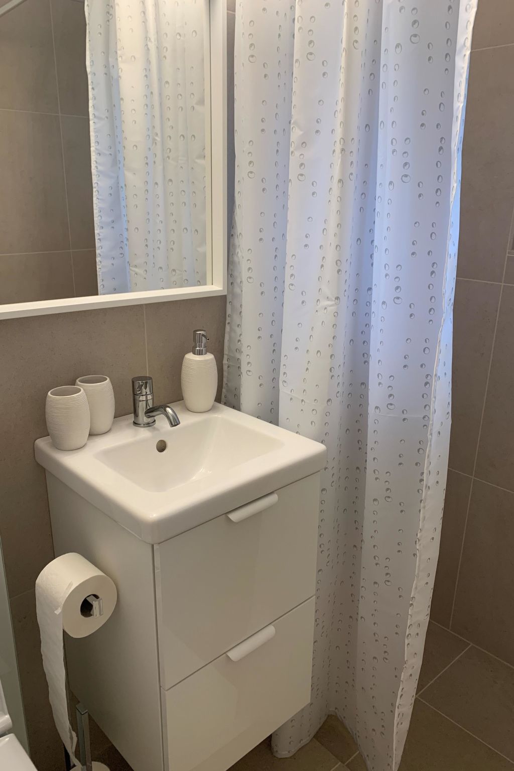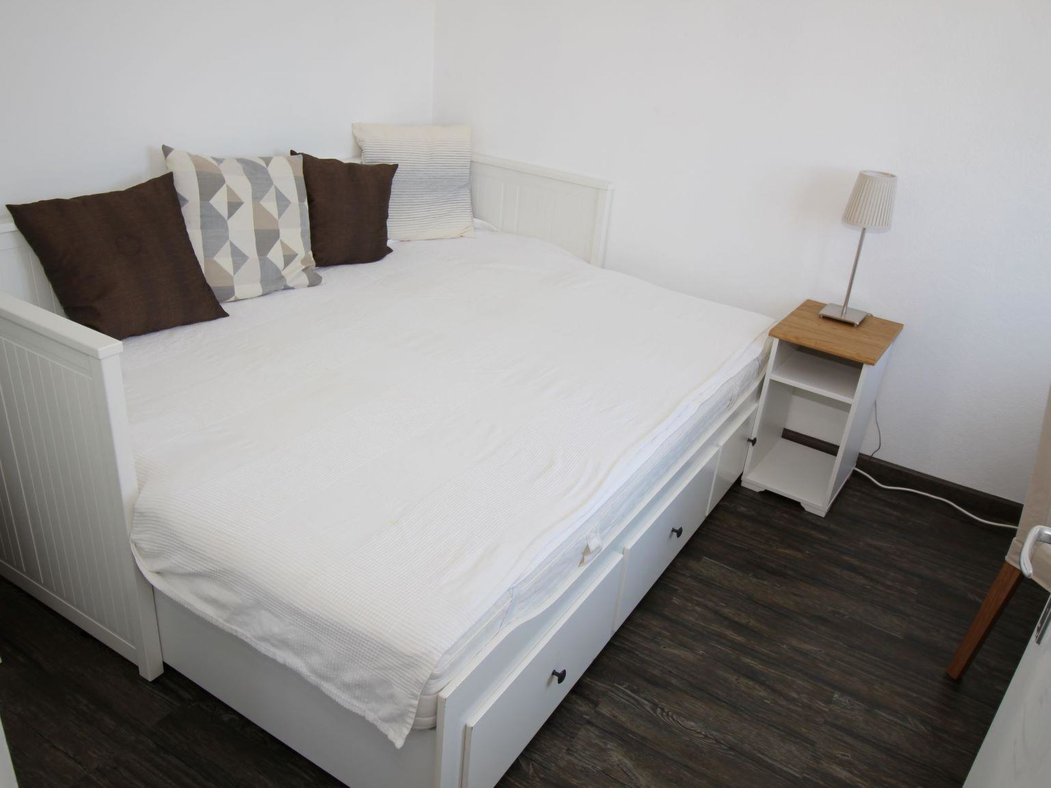 Wohn-/Esszimmer mit offener Küche, TV, Telefon und WiFi. 1 Schlafzimmer mit 1 Doppelbett (160x190cm). 1 Schlafzimmer mit 1 Etagenbett (unten 140x190cm, oben 90x190cm). 1 Badezimmer mit Badewanne und WC.