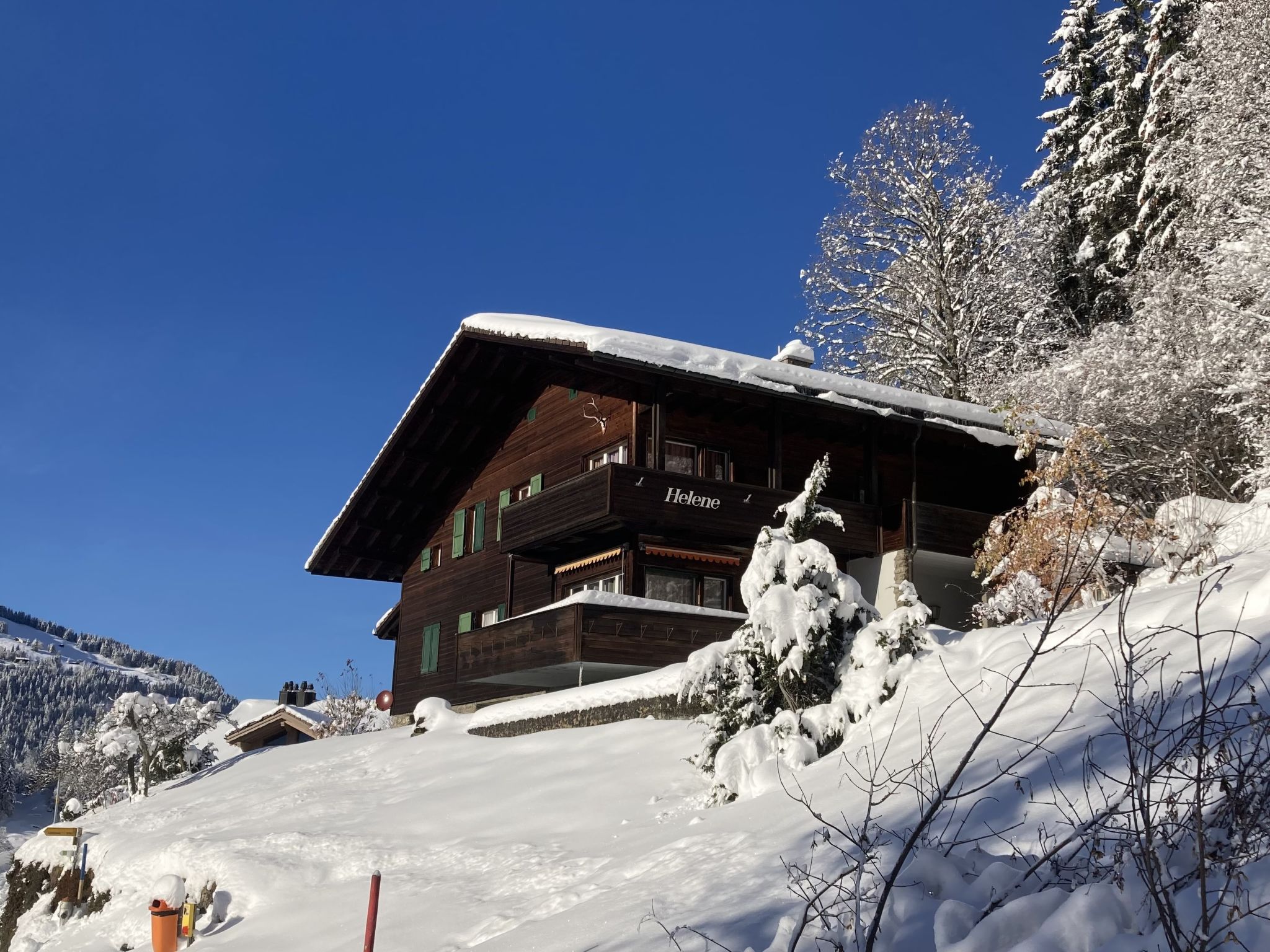 Chalet "Helene". Am Ortsrand, 600 m vom Zentrum von Wengen, ruhige, sonnige Lage am Hang, 150 m vom Waldrand. Im Hause: Zentralheizung, Waschmaschine (zur Mitbenutzung). Einkaufsservice vor Anreise möglich. Einkaufsgeschäft, Supermarkt 750 m, Restaurant, Bar 450 m, Bäckerei 700 m, Zentrum zu Fuss in 12 Minuten erreichbar, Bahnstation "Wengen" 750 m, Freibad 1 km. Luftseilbahn, Skisportanlagen 600 m. Bitte beachten: autofreie Ferienanlage. Die Anreise erfolgt mit der Bergbahn. In diesem Haus sind weitere Ferienwohnungen mietbar. Anreise ist nur mit dem Zug ab Lauterbrunnen möglich – 14 Min. Fahrzeit.