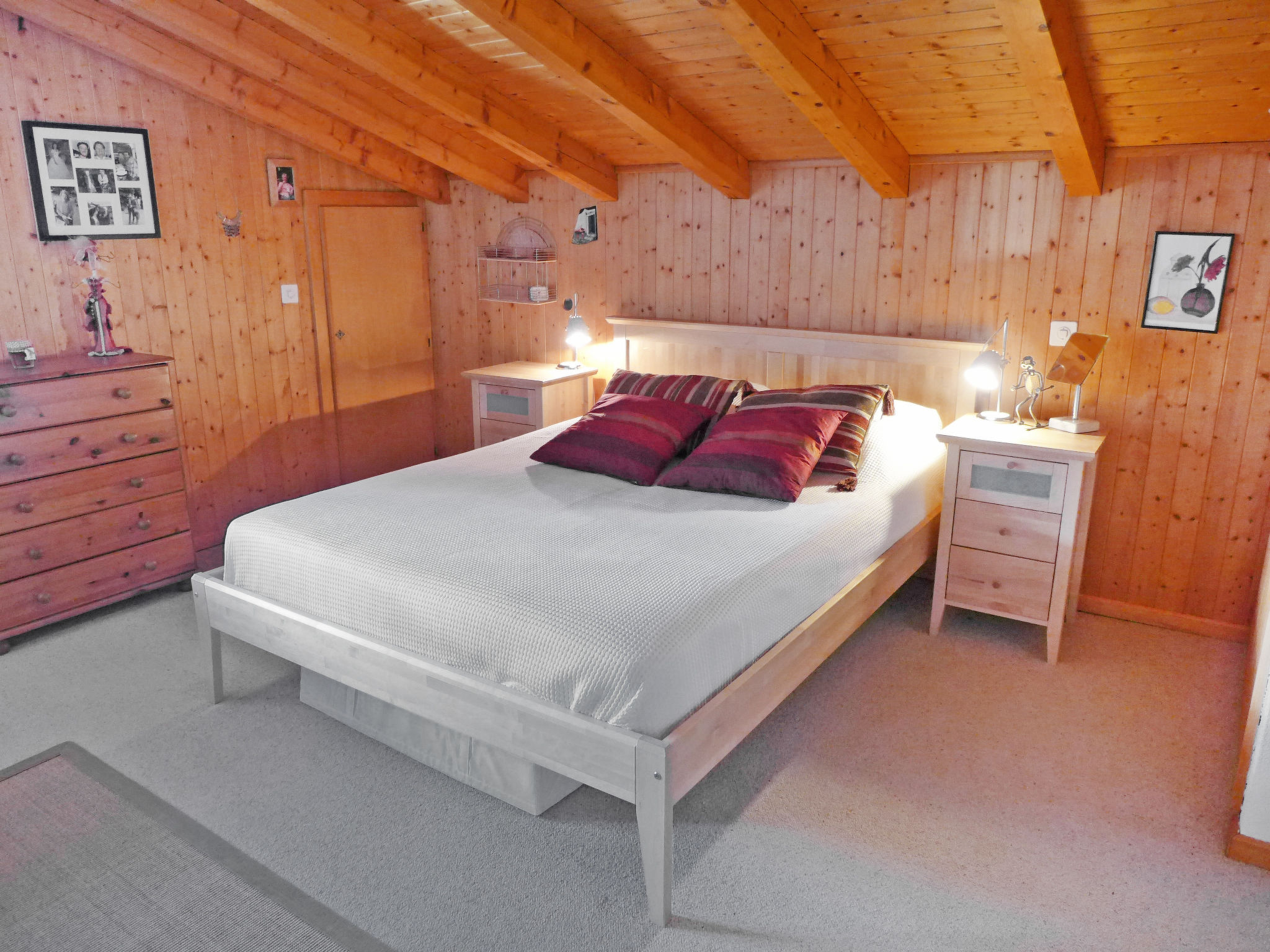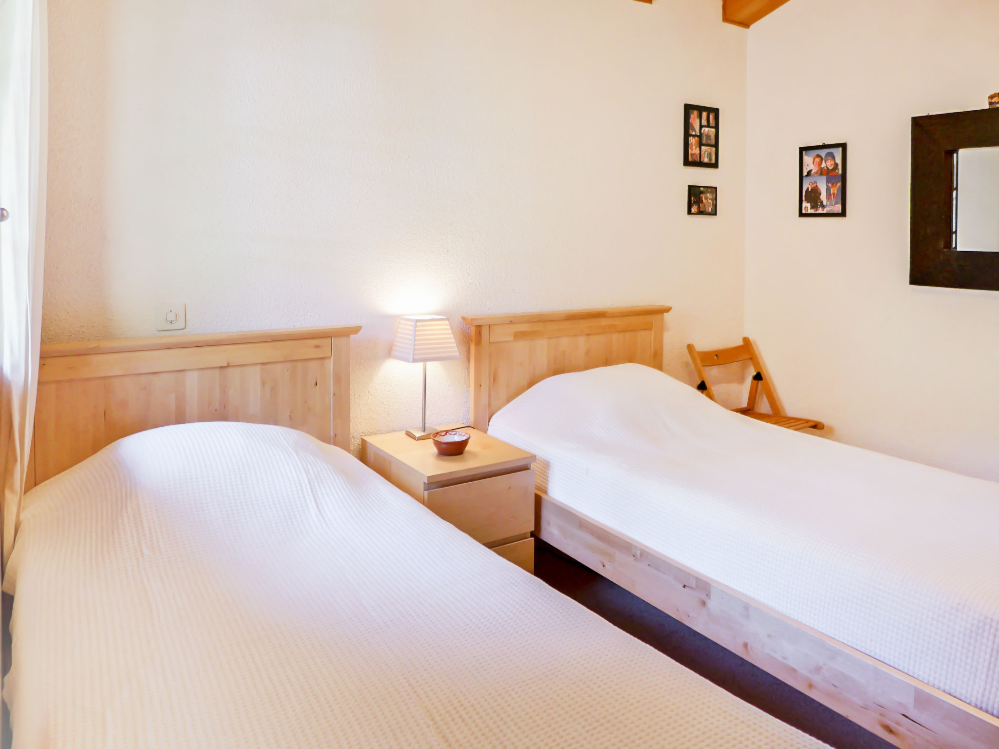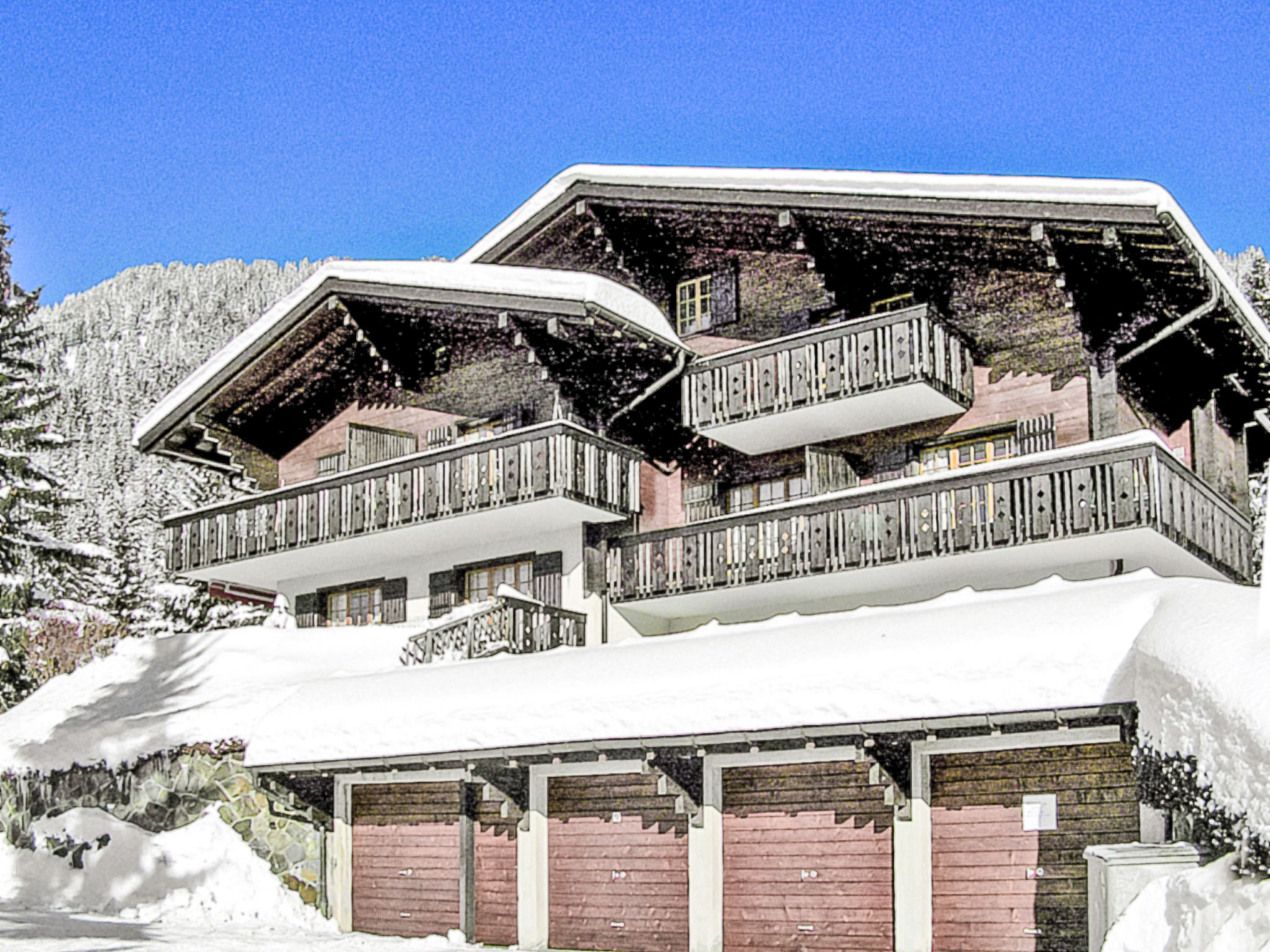 "Armorial II / apt 6", 3-Zimmer-Attikawohnung 90 m2 auf 2 Stockwerken im 3. Stock, Südlage. Komfortabel und gemütlich eingerichtet: abgeschrägtes Wohn-/Esszimmer mit offenem Kamin, Esstisch und TV (Flachbildschirm). Ausgang zum Balkon, Richtung Süden. 1 Zimmer mit 2 Betten (90 cm, Länge 200 cm). Offene Küche (4 Kochplatten, Backofen, Geschirrspüler, Tiefkühler). Dusche/WC. Obergeschoss: 1 abgeschrägtes Doppelzimmer mit 1 Doppelbett (160 cm, Länge 200 cm), Bad/WC. Balkon 8 m2, Südlage. Sehr schöne Panoramasicht auf die Berge. Garage Nr. 2.