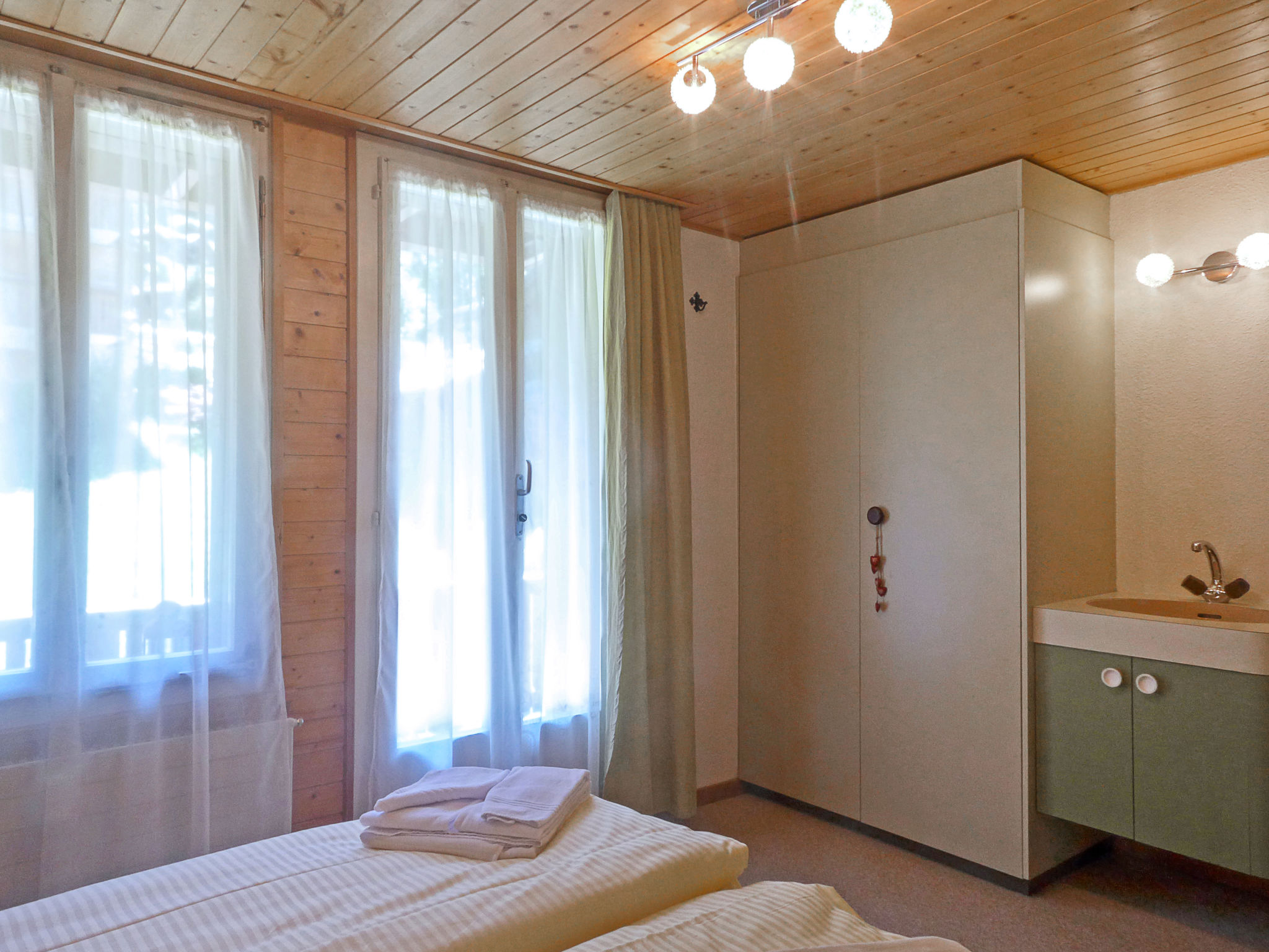 "Apt. B", 2-Zimmer-Wohnung 40 m2 im 1. Stock. Komfortabel und gemütlich eingerichtet: Wohn-/Esszimmer mit 1 Diwanbett (160 cm, Länge 190 cm), offenem Kamin, Esstisch, Kabel-TV und Radio. 1 Zimmer mit 1 Doppelbett (140 cm, Länge 200 cm). Kleine Küche (3 Kochplatten, Backofen, Geschirrspüler, Toaster, Wasserkocher, elektrische Kaffeemaschine, Kapseln für die Kaffeemaschine (Nespresso) extra, Fondue Set (Käse)). Bad/WC. Balkon. Schöne Sicht auf die Berge. Zur Verfügung: Bügeleisen, Holz (extra). Internet (Wireless LAN, gratis). Bitte beachten: Nichtraucher-Unterkunft.
