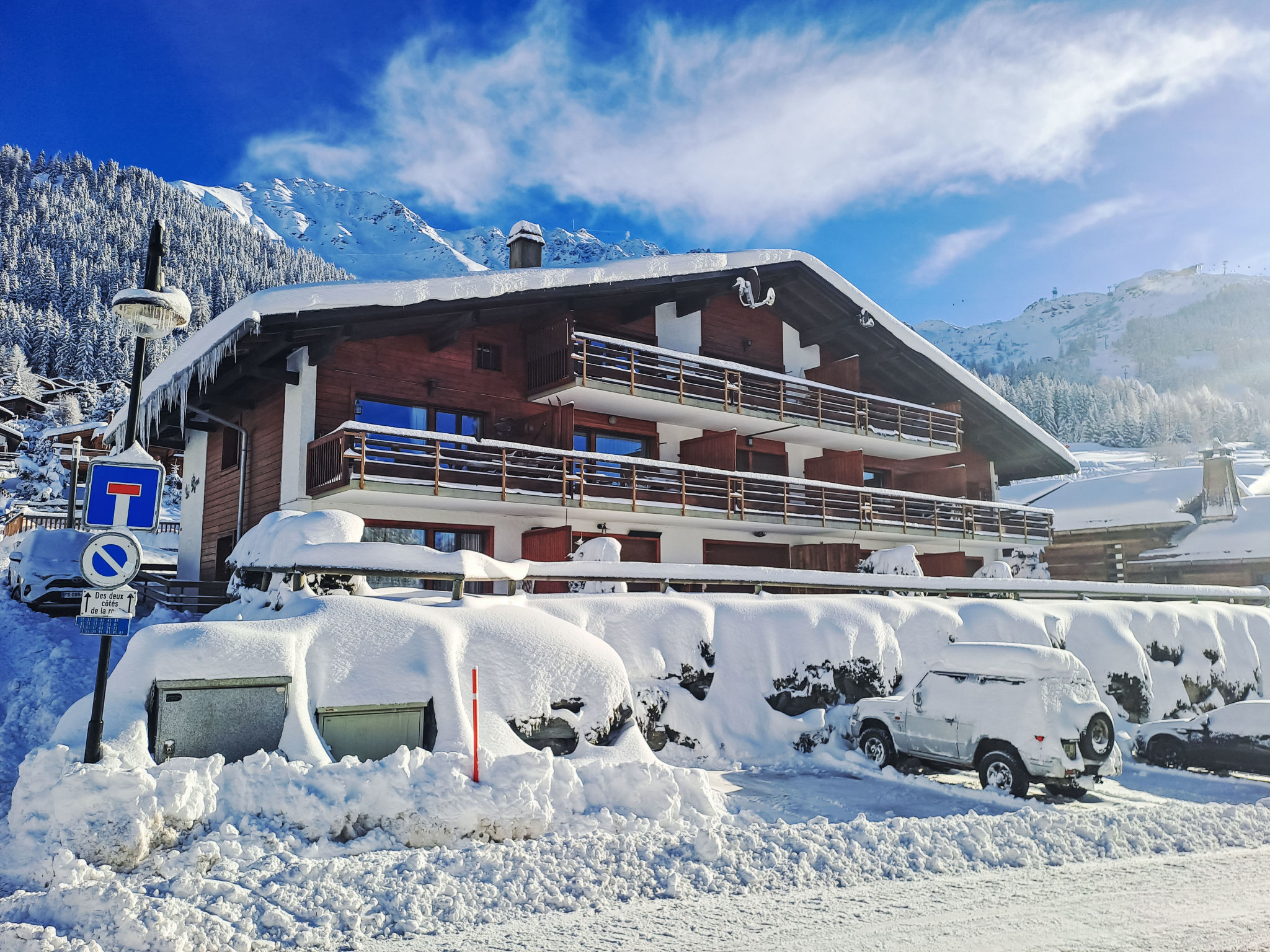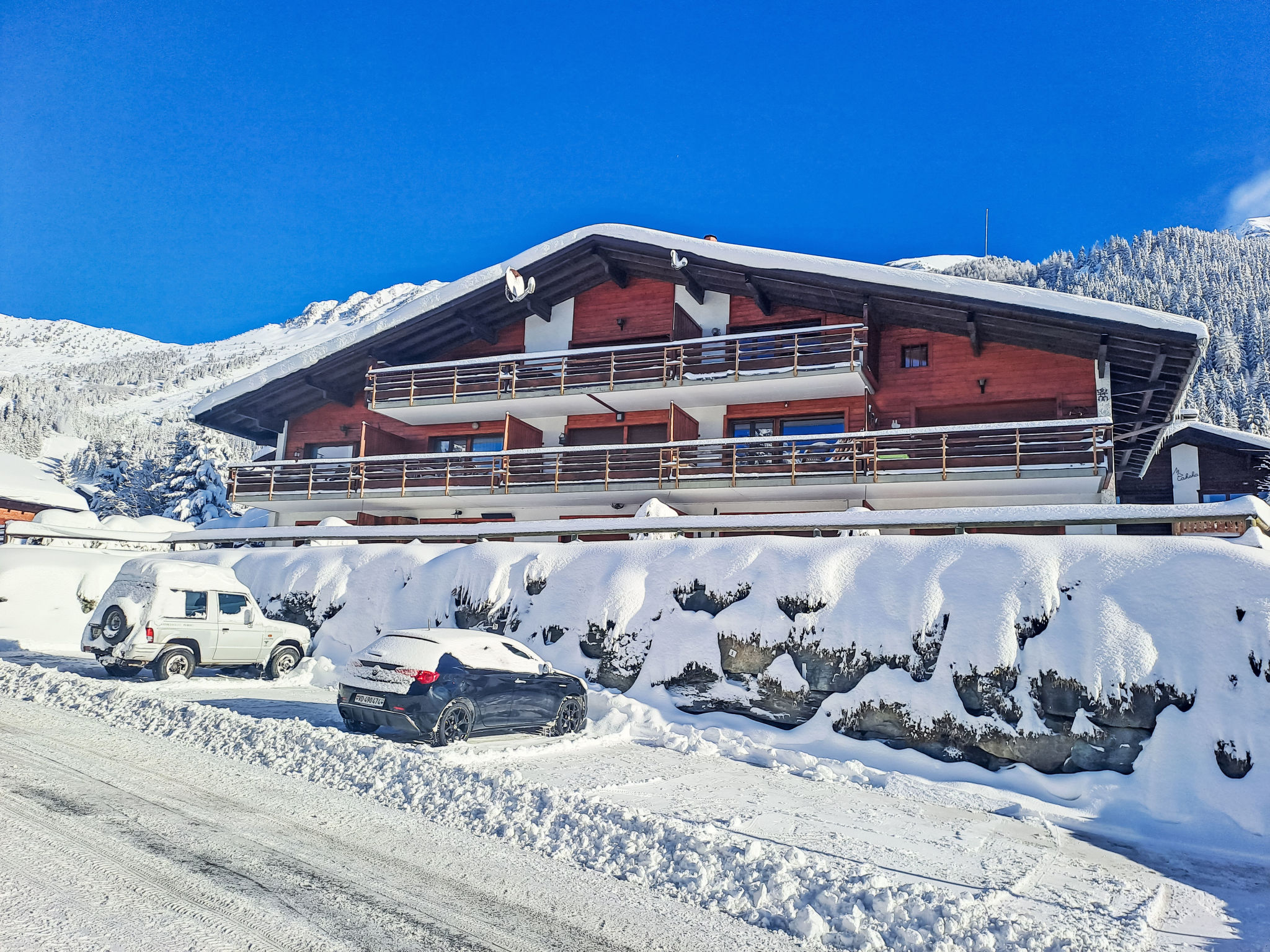 Kleines Mehrfamilienhaus "Le Pigne". Im Ortsteil des Esserts, 1.9 km vom Zentrum von de la Station, ruhige, sonnige Lage, 30 m vom Skigebiet, Richtung Süden. Zufahrt bis zum Haus. Einkaufsgeschäft 1.9 km, Lebensmittelgeschäft 1.4 km, Supermarkt 1.9 km, Restaurant 400 m, Bar 1.9 km, Bäckerei 1 km, Café 400 m, Bushaltestelle 20 m, Hallenbad 2.8 km. Golfplatz (18 Loch) 150 m, Tennis 2.8 km, Reitstall 2.8 km, Sportzentrum 2.8 km, Sessellift 2.7 km, Gondelbahn 1 km, Skisportanlagen 2.4 km, Skibushaltestelle 20 m, Skischule 2.5 km, Ski-Kindergarten 2.5 km, Eisfeld 2.8 km, Kinderspielplatz 1.9 km. Bitte beachten: Bei guter Schneelage Zufahrt mit den Skiern bis zum Haus. Skilift Le Rouge 80 m.