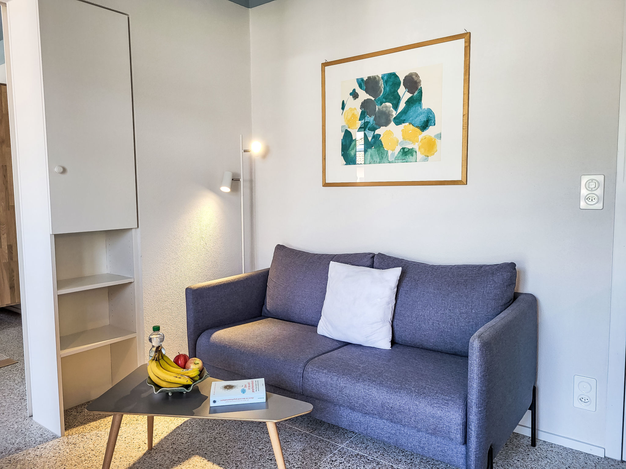 "Appartamento 201 B", 2-Zimmer-Wohnung 38 m2 im 2. Stock. Komfortabel und gemütlich eingerichtet: offenes kleines Wohn-/Esszimmer mit Esstisch und Kabel-TV (Flachbildschirm), Radio. Ausgang zum Balkon. 1 Doppelzimmer mit 2 Betten (90 cm, Länge 200 cm). Küche (4 Kochplatten, Backofen, Toaster, Wasserkocher, elektrische Kaffeemaschine). Dusche/WC. Heizung. Balkon. Balkonmöbel. Sicht auf die Ortschaft. Bitte beachten: Nichtraucher-Unterkunft. Eine Kaffeemaschine von Tassimo kann an der Reception zu einem Mietpreis von CHF 10.- (exclusiv Kapseln) gemietet werden.
