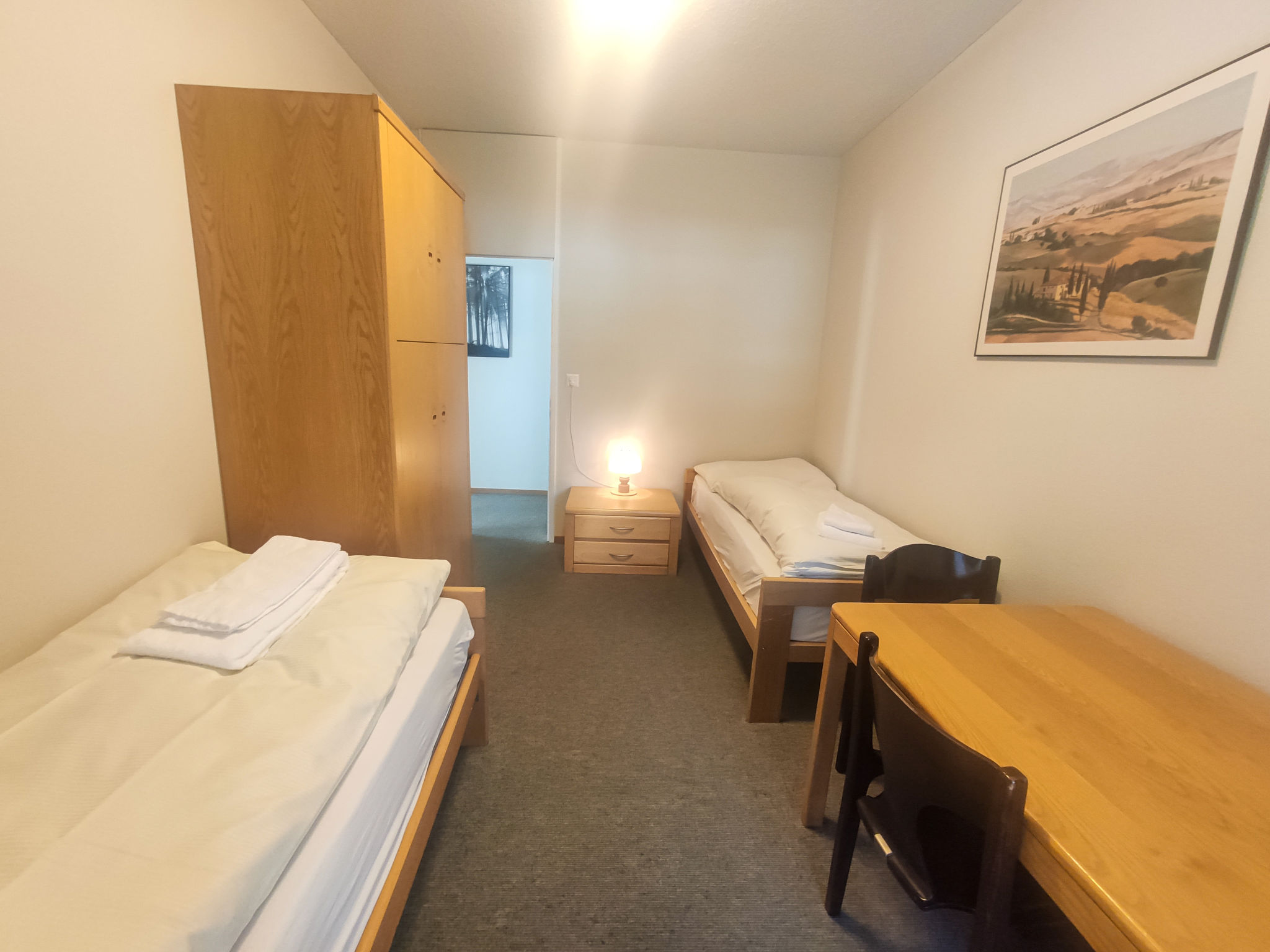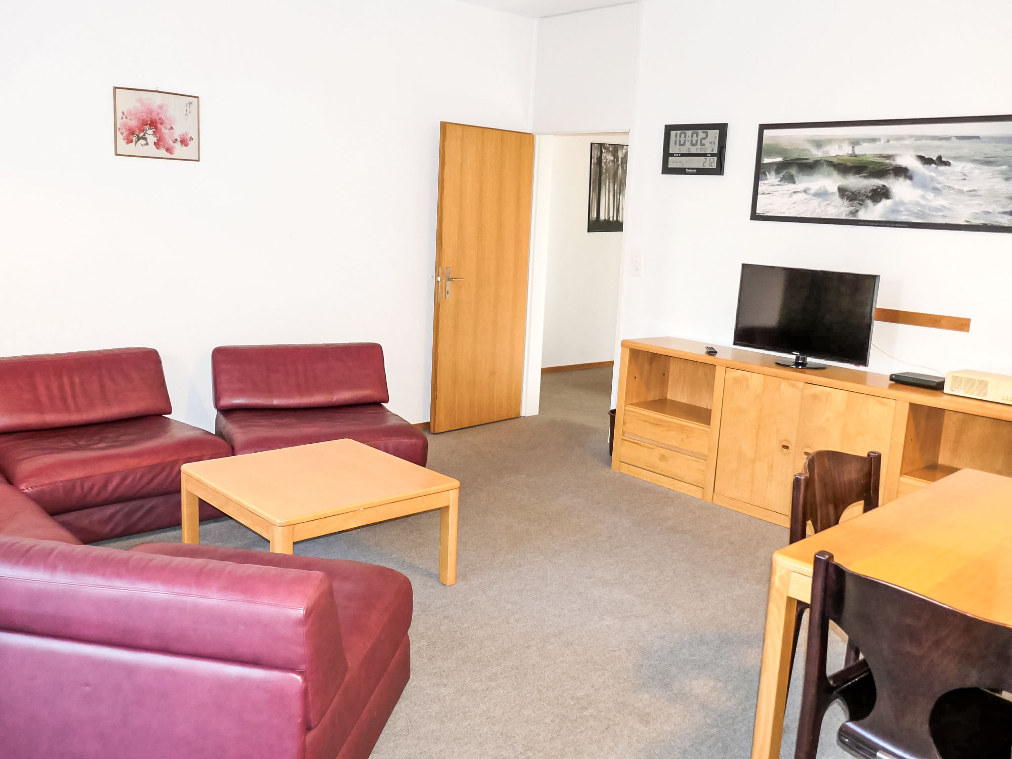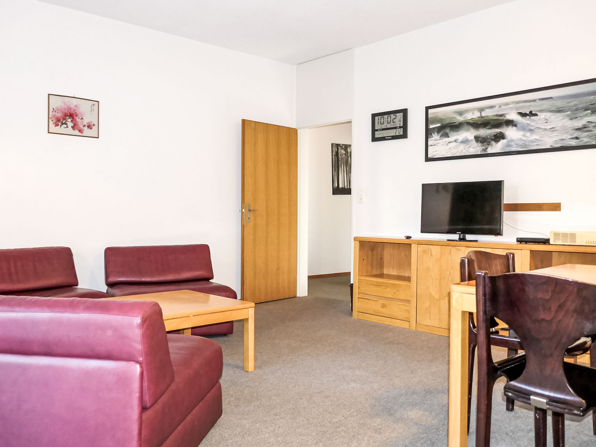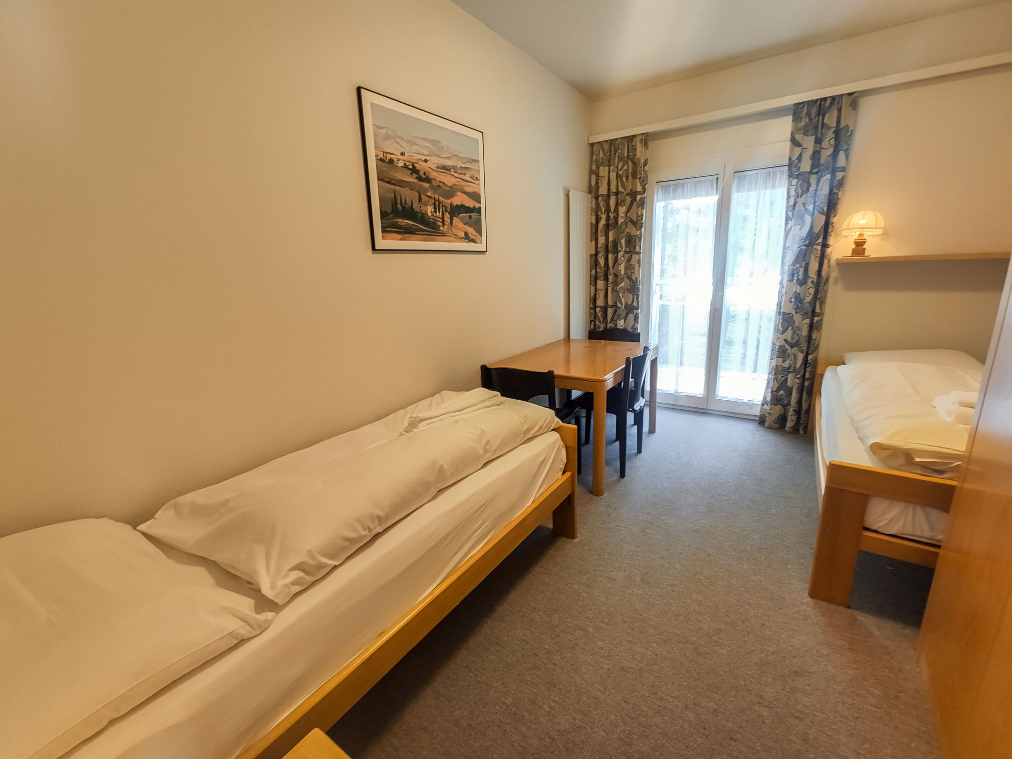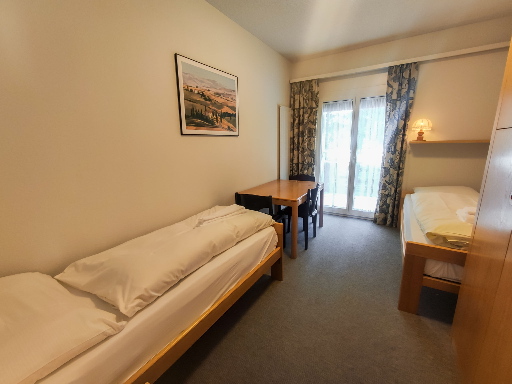 3-Zimmer-Wohnung 80 m2, im erhöhten Erdgeschoss, Südostlage. Wohn-/Esszimmer mit 1 Diwanbett, Kabel-TV und Flachbildschirm. Ausgang zum Balkon, Richtung Osten und Richtung Süden. 1 Zimmer mit 1 Doppelbett (2 x 90 cm). 1 Zimmer mit 2 Betten (90 cm). Küche (4 Kochplatten, Backofen, Geschirrspüler). Bad oder Dusche/WC, Doppelwaschbecken. Zur Verfügung: Internet (Wireless LAN, gratis). Bitte beachten: Nichtraucher-Unterkunft. 1 Haustier/Hund erlaubt. Apt Mit Rollstuhl max 70cm erreichbar. Badezimmer Türe 75cm.