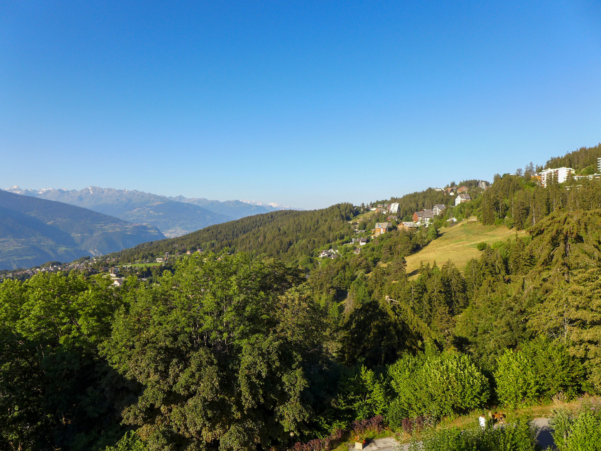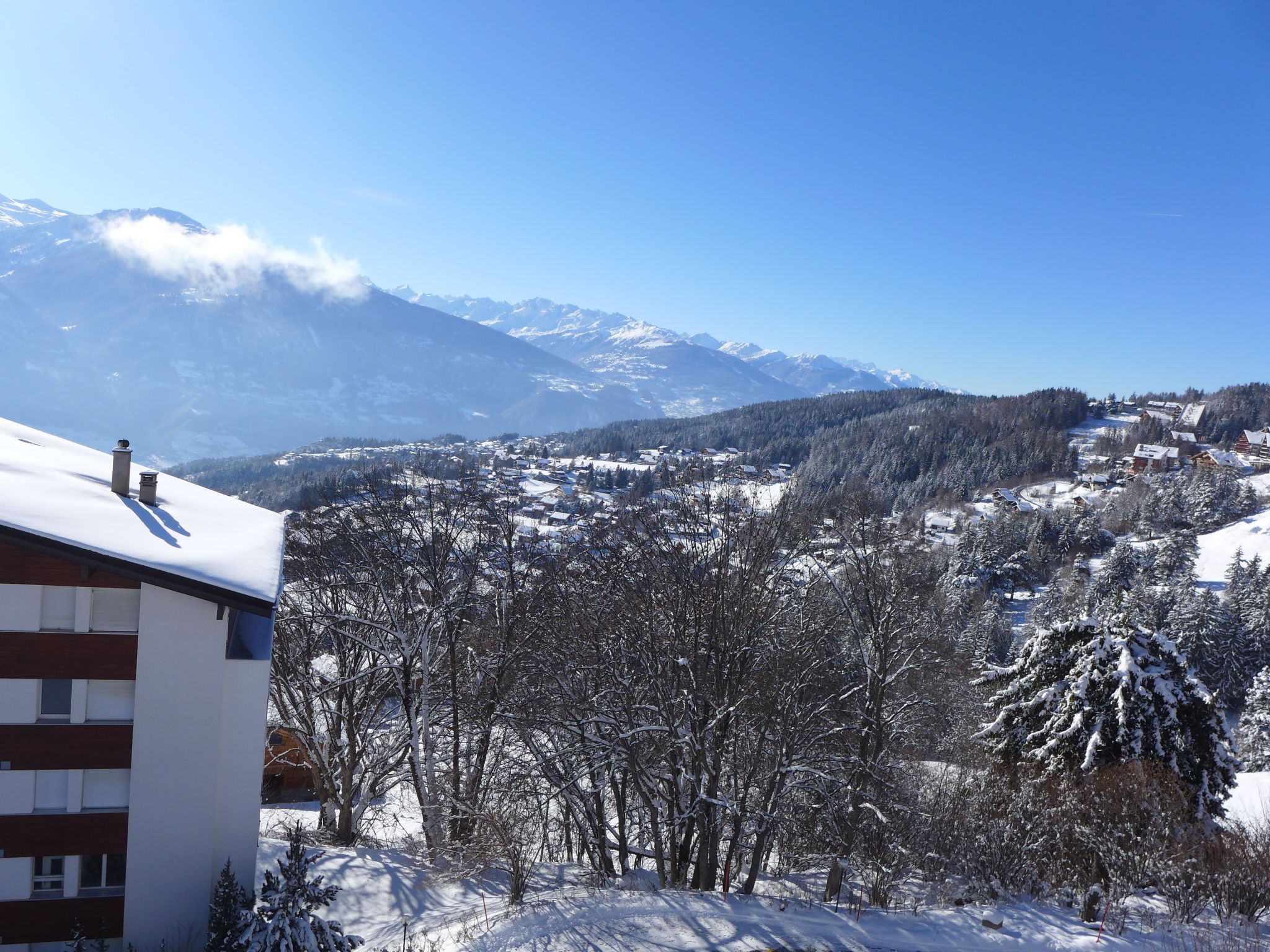 2-Zimmer-Wohnung 60 m2 im 4. Stock. Hell, schön eingerichtet: grosses Wohn-/Esszimmer mit 1 Doppeldiwanbett (160 cm, Länge 200 cm), Kabel-TV, Flachbildschirm, Radio, CD und DVD. 1 Zimmer mit 1 franz. Bett (160 cm, Länge 200 cm). Offene Küche (3 Kochplatten, Backofen, Geschirrspüler, Toaster, Wasserkocher, elektrische Kaffeemaschine, Racletteofen). Bad, Bidet, sep. WC. Balkon 12 m2, Südlage. Terrassenmöbel. Sehr schöne Sicht auf die Berge und das Tal. Zur Verfügung: Haartrockner. Internet (Wireless LAN, gratis). Bitte beachten: Nichtraucher-Unterkunft. 1 Haustier/Hund erlaubt.