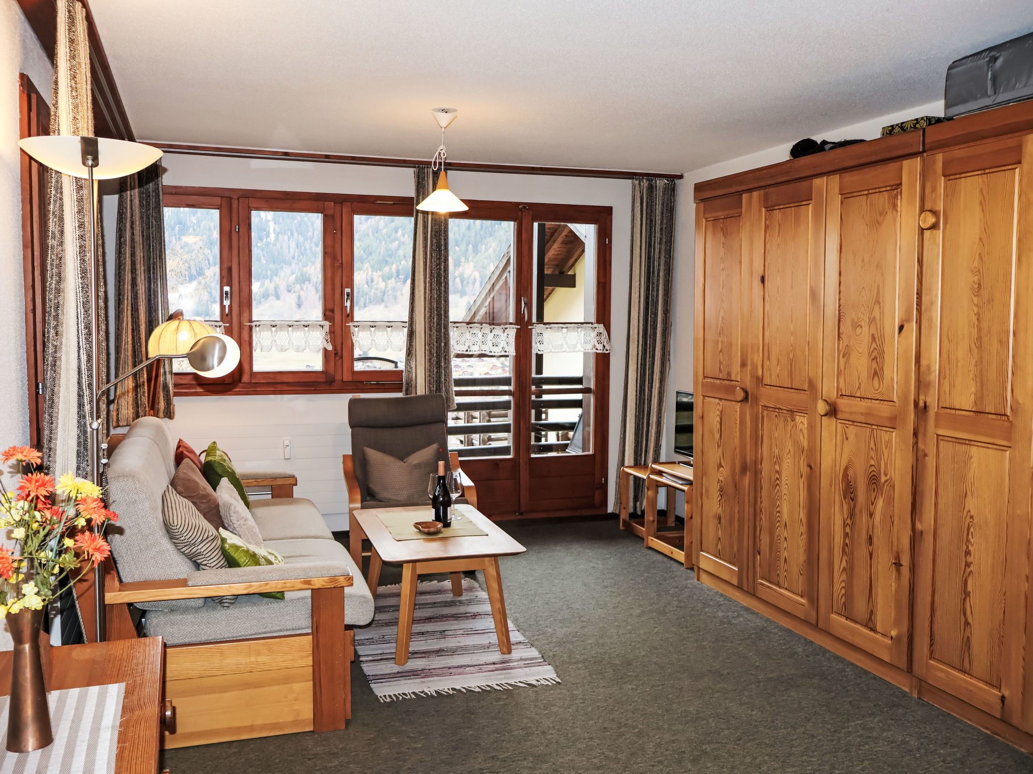 1-Zimmer-Wohnung 38 m2. Gemütlich eingerichtet: Wohn-/Schlafzimmer mit 1 Diwanbett, 2 Wandschrankbetten und Kabel-TV (Flachbildschirm), Radio. Offene Küche (Backofen). Bad/WC. Balkon. Terrassenmöbel. Sehr schöne Sicht auf die Berge. Zur Verfügung: Internet (Wireless LAN). Bitte beachten: Nichtraucher-Unterkunft.