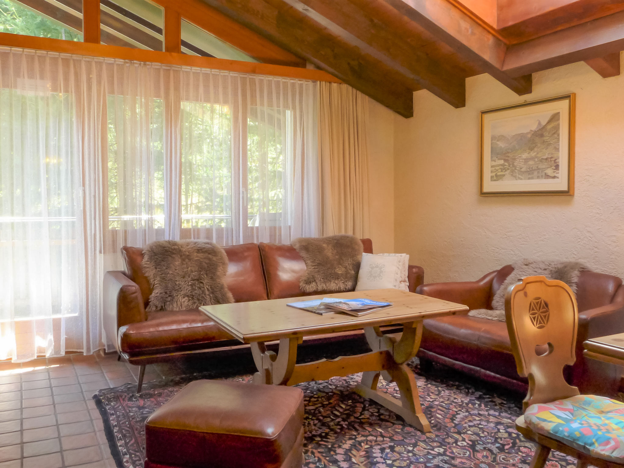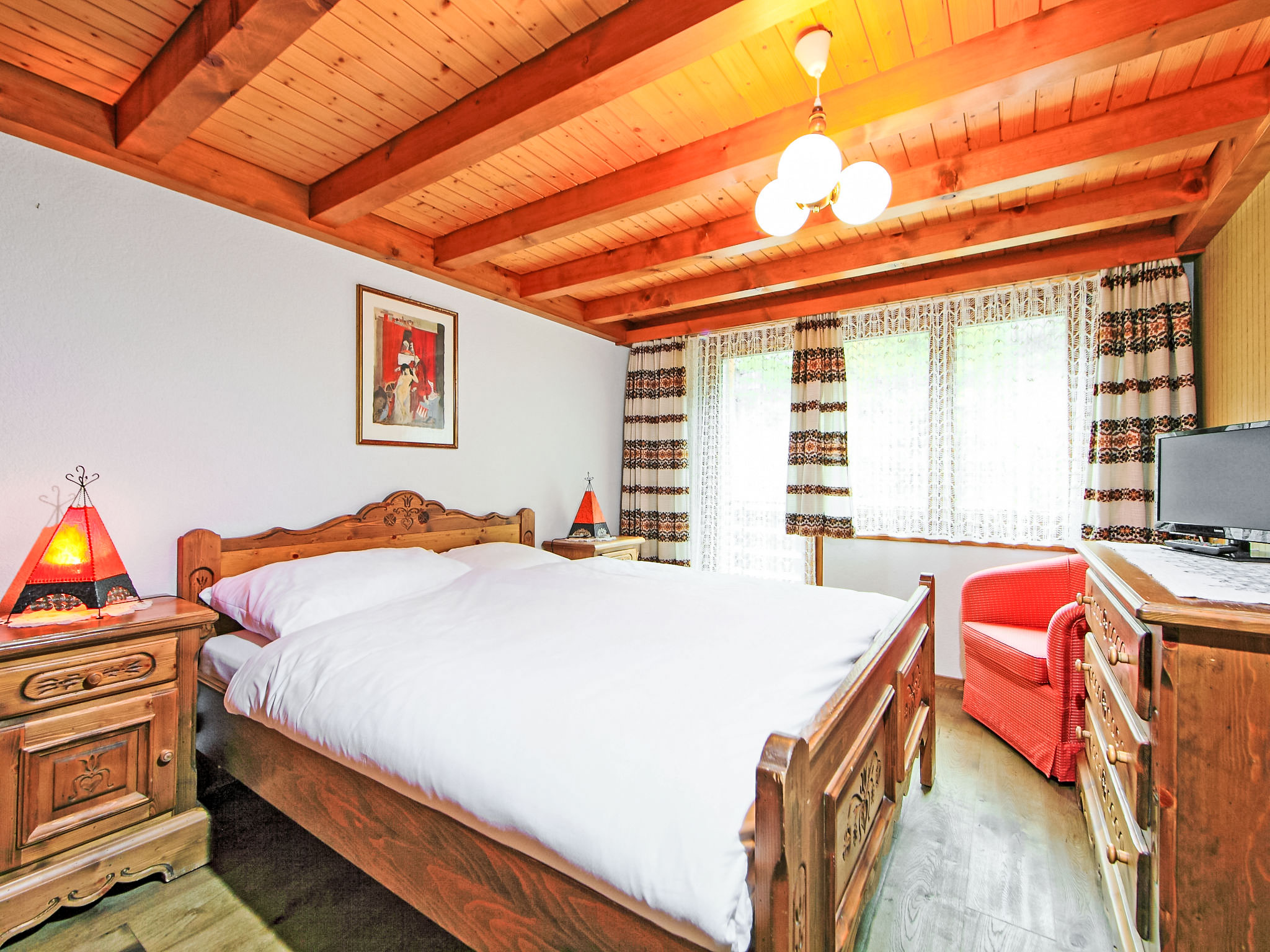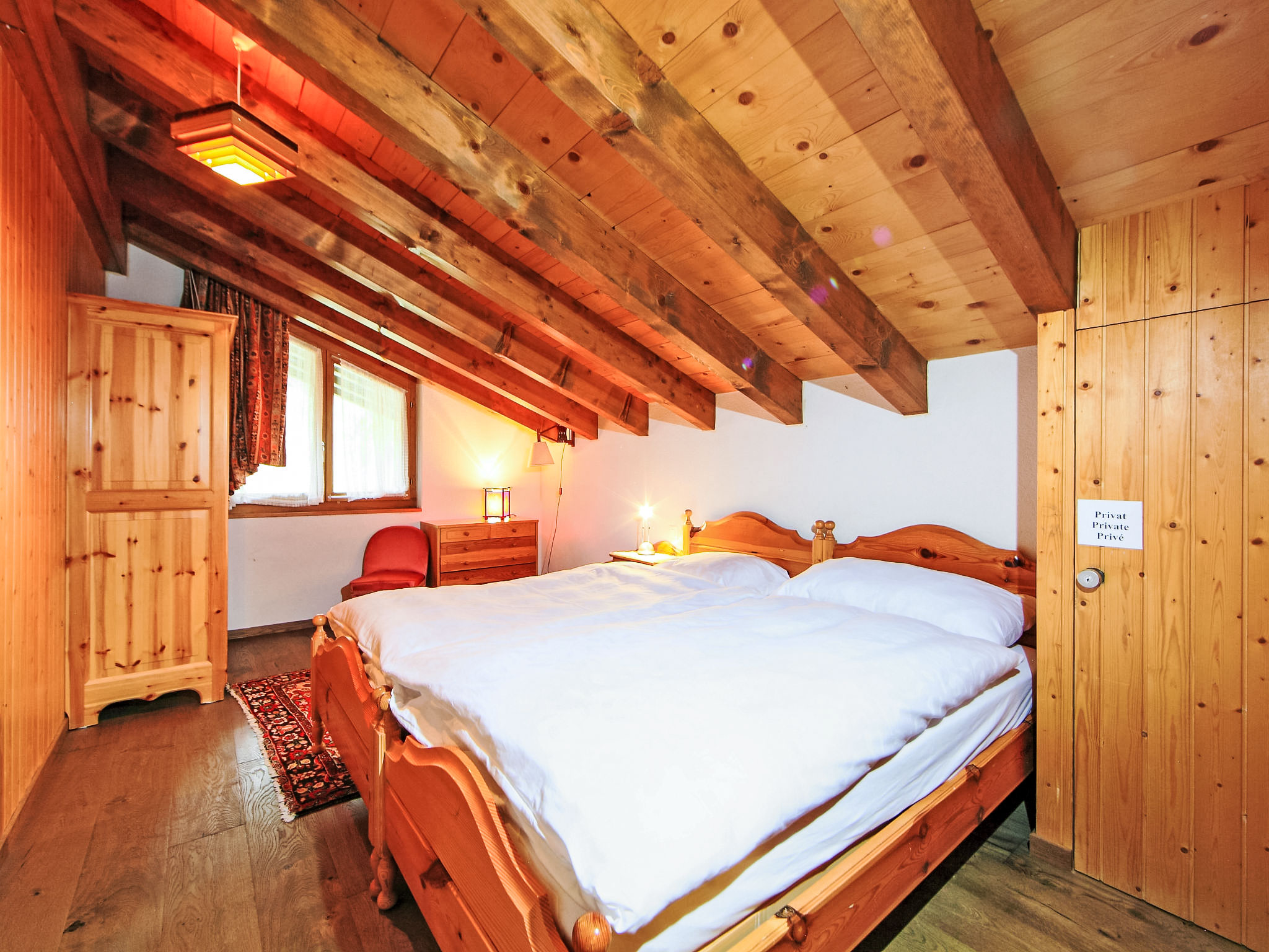3-Zimmer-Wohnung 80 m2 auf 2 Stockwerken, im Dachgeschoss. Gemütlich eingerichtet: Wohn-/Esszimmer mit offenem Kamin, Esstisch, TV und DVD. Ausgang zum Balkon. 1 Zimmer mit 1 Doppelbett (1 x 160 cm, Länge 200 cm), TV. Offene Küche (Backofen, Geschirrspüler, 4 Glaskeramikherd Platten, Toaster, Wasserkocher, Mikrowelle, Tiefkühler, elektrische Kaffeemaschine, Racletteofen, Fondue Set (Chinoise, Käse)). Bad/WC, Dusche/WC. Obergeschoss: 1 Zimmer mit 2 Betten (90 cm, Länge 200 cm). Balkon, Südlage und Ostlage. Balkonmöbel. Sicht auf die Berge. Zur Verfügung: Haartrockner. Internet (Wireless LAN, gratis). Bitte beachten: Nichtraucher-Unterkunft.