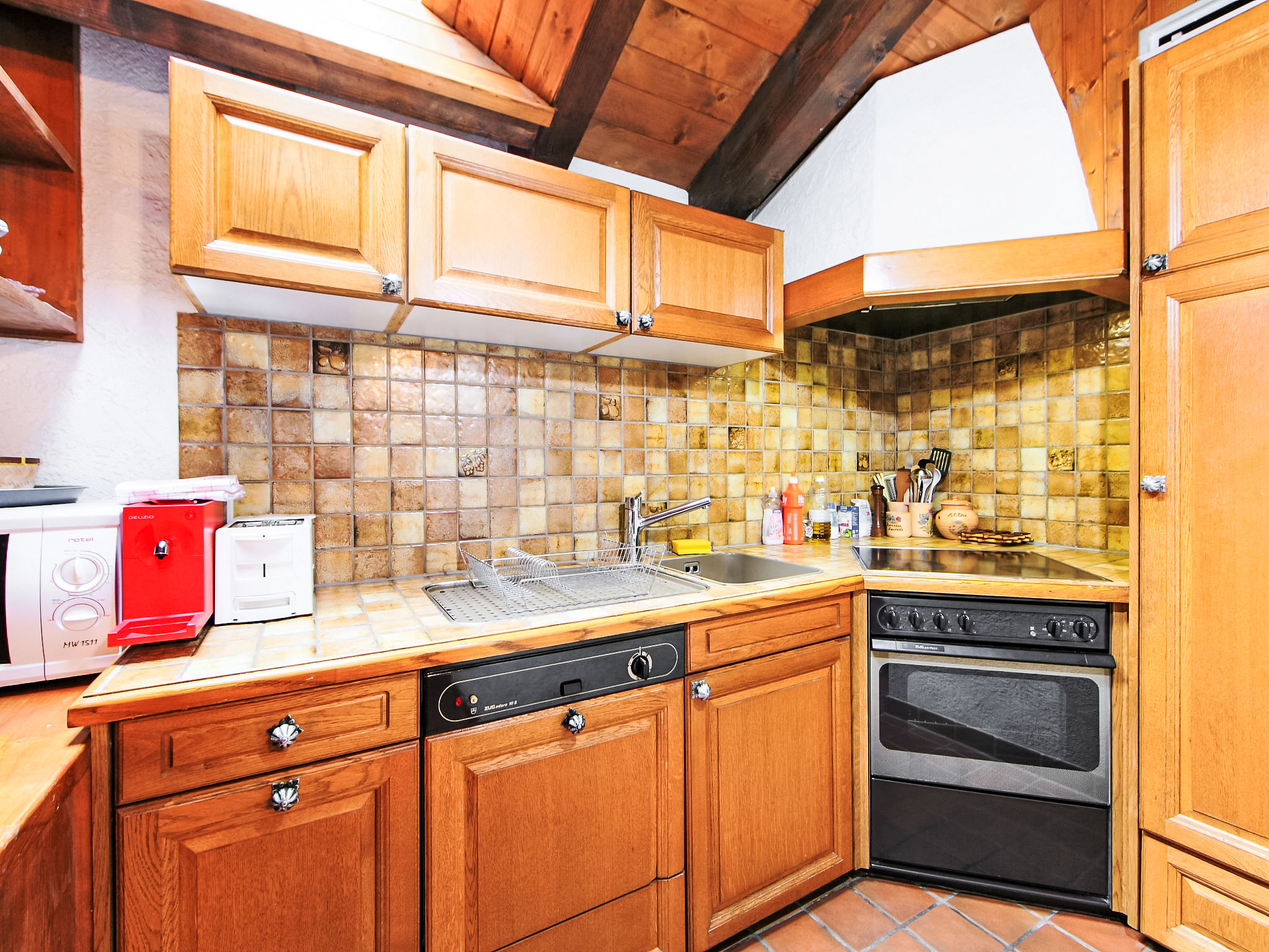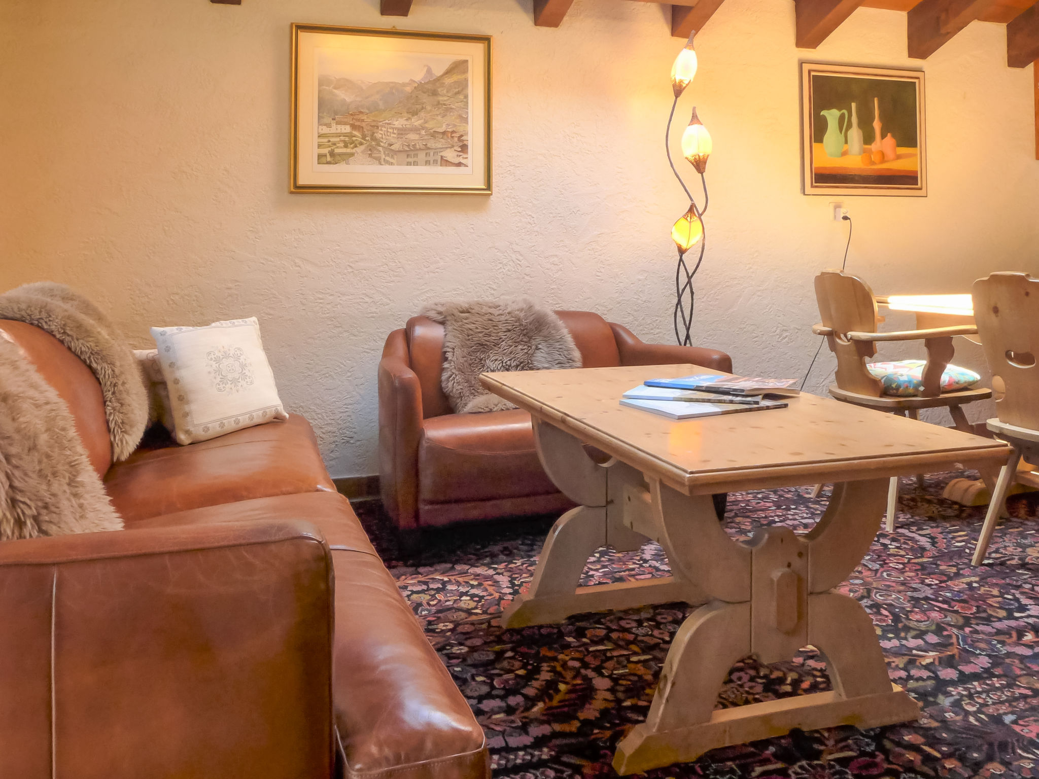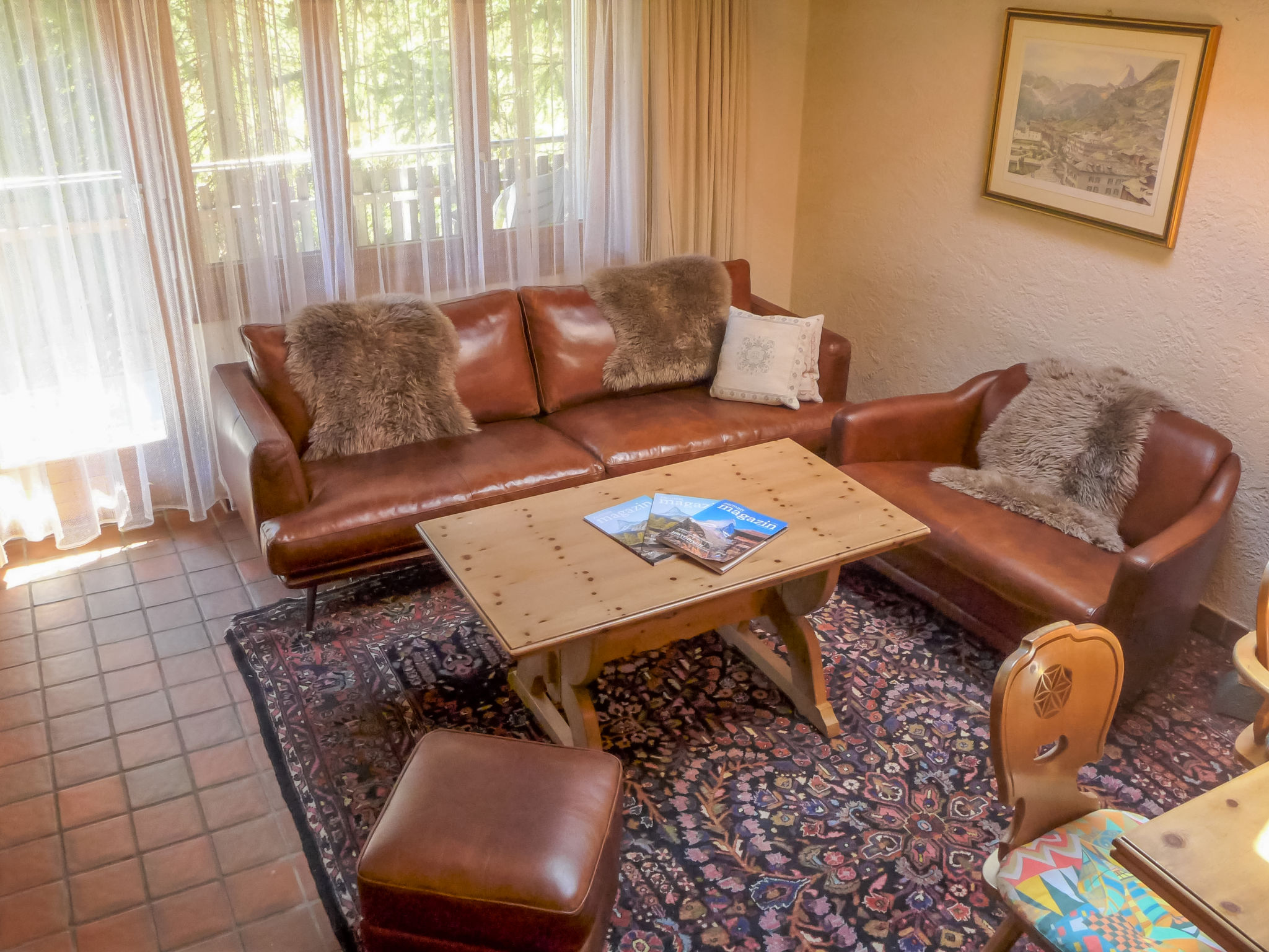 3-Zimmer-Wohnung 80 m2 auf 2 Stockwerken, im Dachgeschoss. Gemütlich eingerichtet: Wohn-/Esszimmer mit offenem Kamin, Esstisch, TV und DVD. Ausgang zum Balkon. 1 Zimmer mit 1 Doppelbett (1 x 160 cm, Länge 200 cm), TV. Offene Küche (Backofen, Geschirrspüler, 4 Glaskeramikherd Platten, Toaster, Wasserkocher, Mikrowelle, Tiefkühler, elektrische Kaffeemaschine, Racletteofen, Fondue Set (Chinoise, Käse)). Bad/WC, Dusche/WC. Obergeschoss: 1 Zimmer mit 2 Betten (90 cm, Länge 200 cm). Balkon, Südlage und Ostlage. Balkonmöbel. Sicht auf die Berge. Zur Verfügung: Haartrockner. Internet (Wireless LAN, gratis). Bitte beachten: Nichtraucher-Unterkunft.