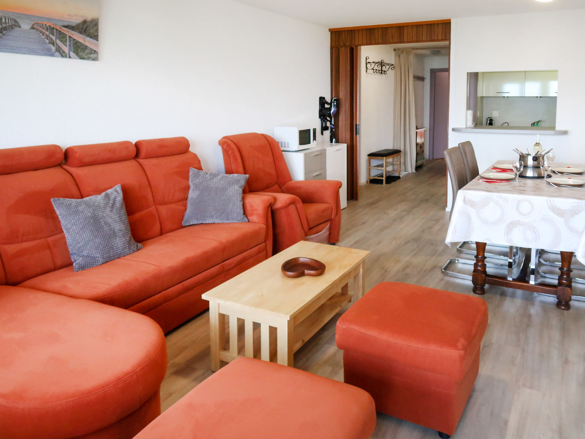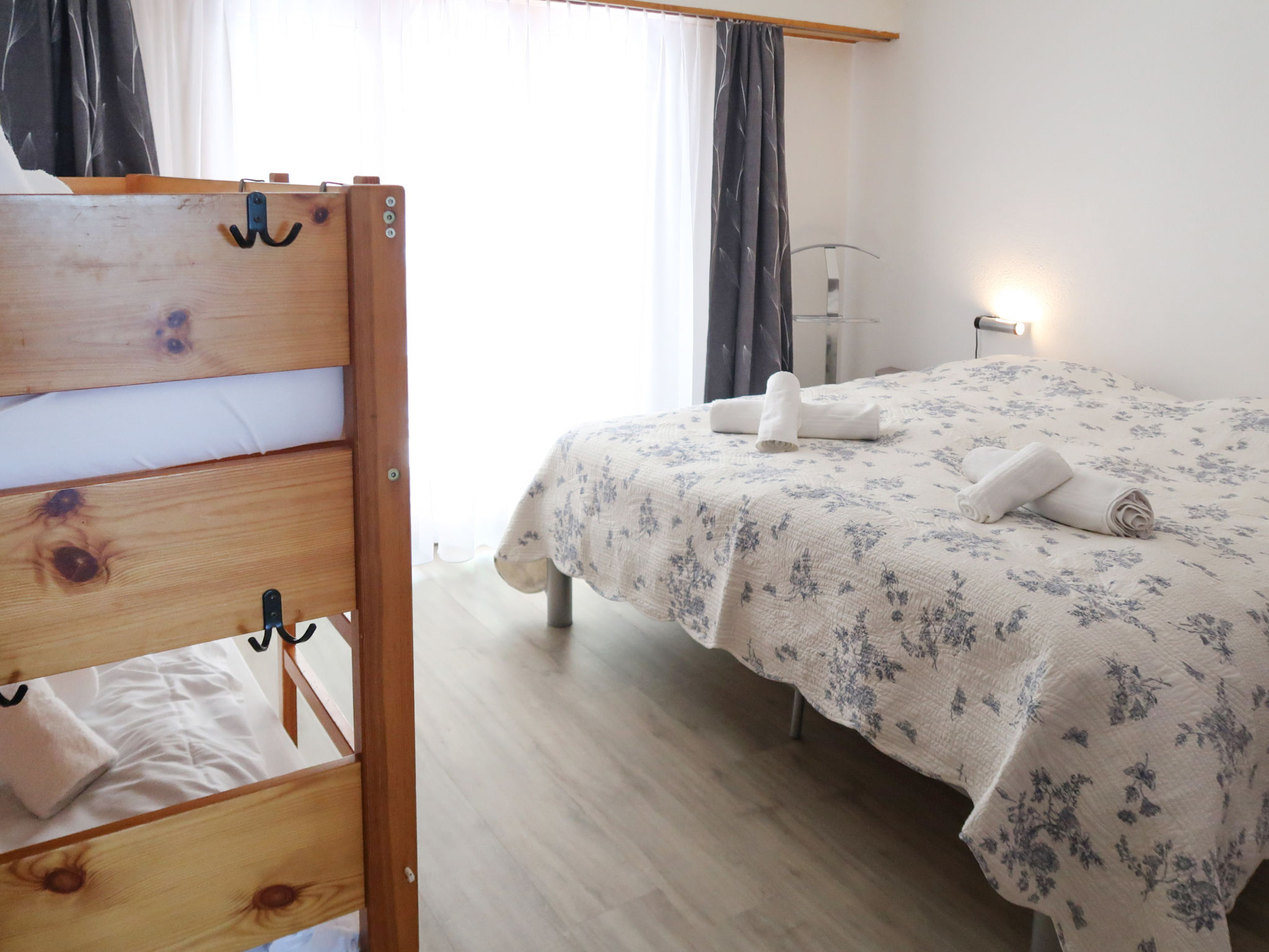 "Derborence 28", 2-Zimmer-Wohnung 56 m2, im Erdgeschoss. Objekt geeignet für 2 Erwachsene + 2 Kinder. Hell, renoviert, zweckmässig und schön eingerichtet: Wohn-/Esszimmer mit Kabel-TV. Ausgang zum Balkon, Richtung Norden. 1 Zimmer mit 1 x 2 Etagenbetten (90 cm, Länge 190 cm), 1 Doppelbett (2 x 90 cm, Länge 190 cm). Ausgang zum Balkon, Richtung Süden. Offene Küche (Backofen, Geschirrspüler, 2 Glaskeramikherd Platten, Mikrowelle, elektrische Kaffeemaschine, Kapseln für die Kaffeemaschine (nespresso) extra, Racletteofen, Fondue Set (Chinoise, Käse)). Bad/Dusche/WC. Balkon, Nordlage Balkon, Südlage. Balkonmöbel. Zur Verfügung: Haartrockner. Internet (Wireless LAN, gratis). Parkplatz Nr. 1 (überdacht), Höhe 190 cm. Bitte beachten: Nichtraucher-Unterkunft. 1 Haustier/Hund erlaubt.