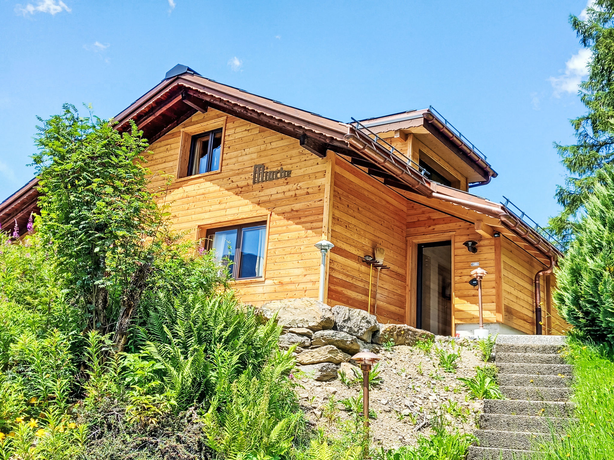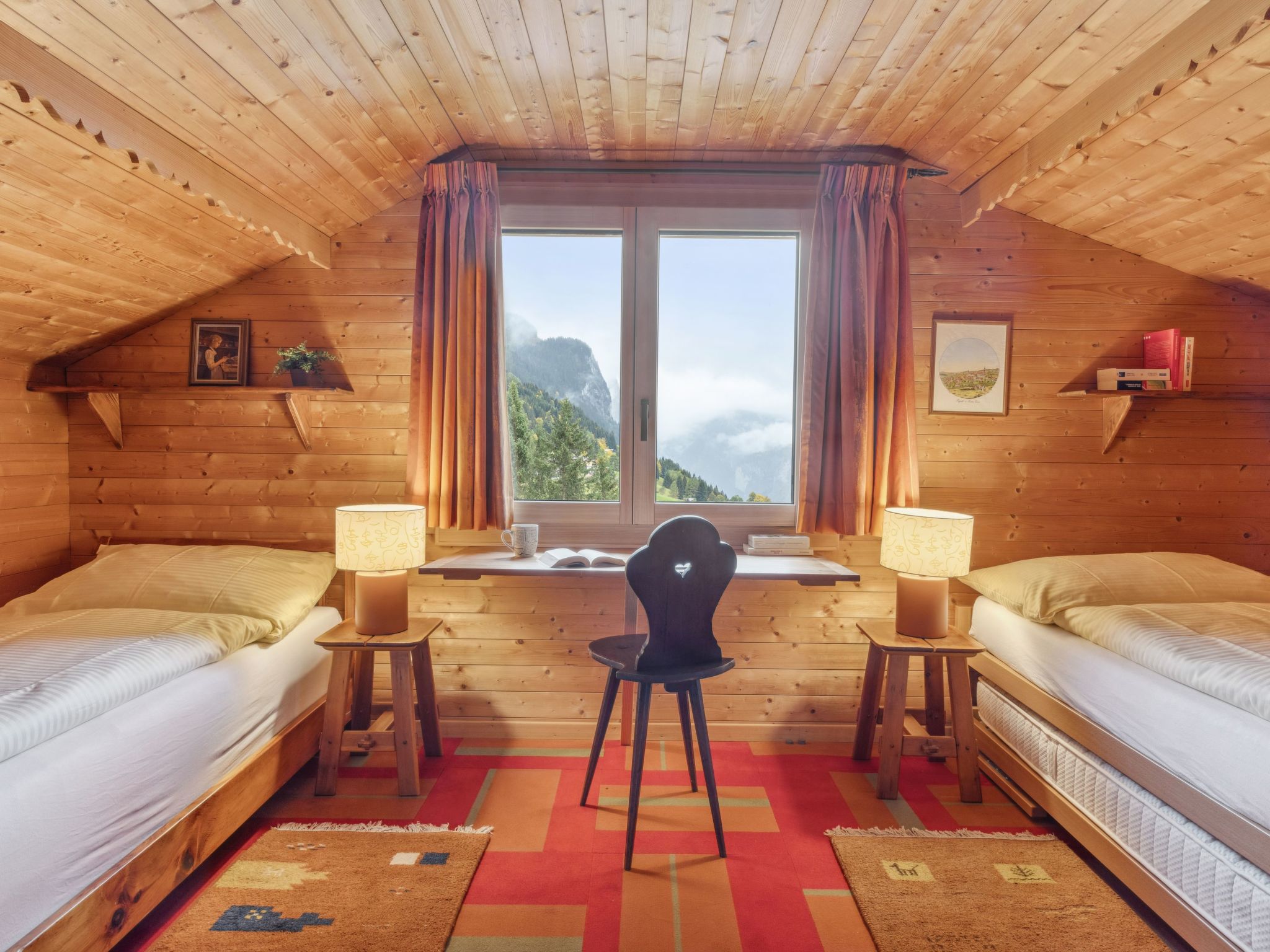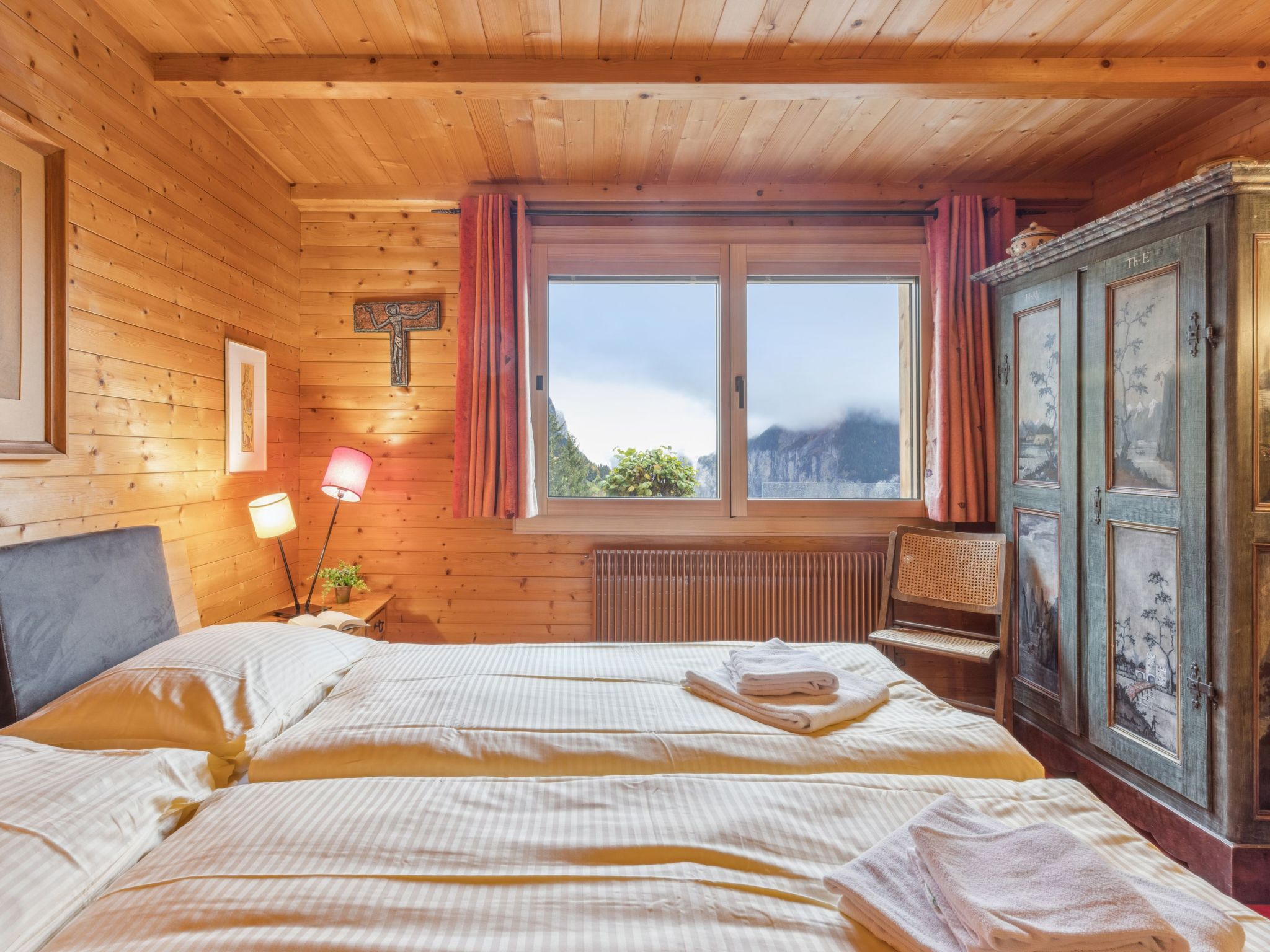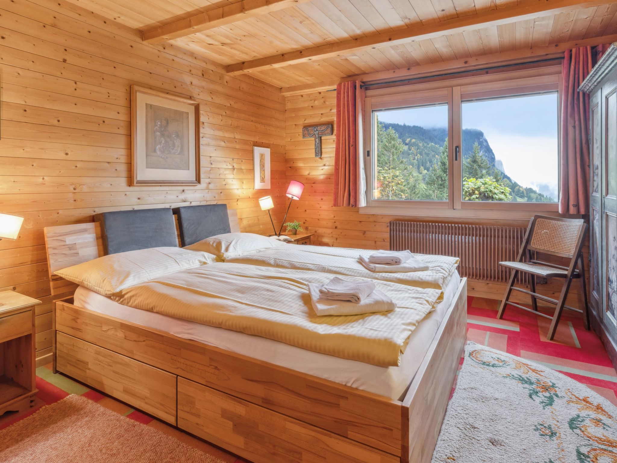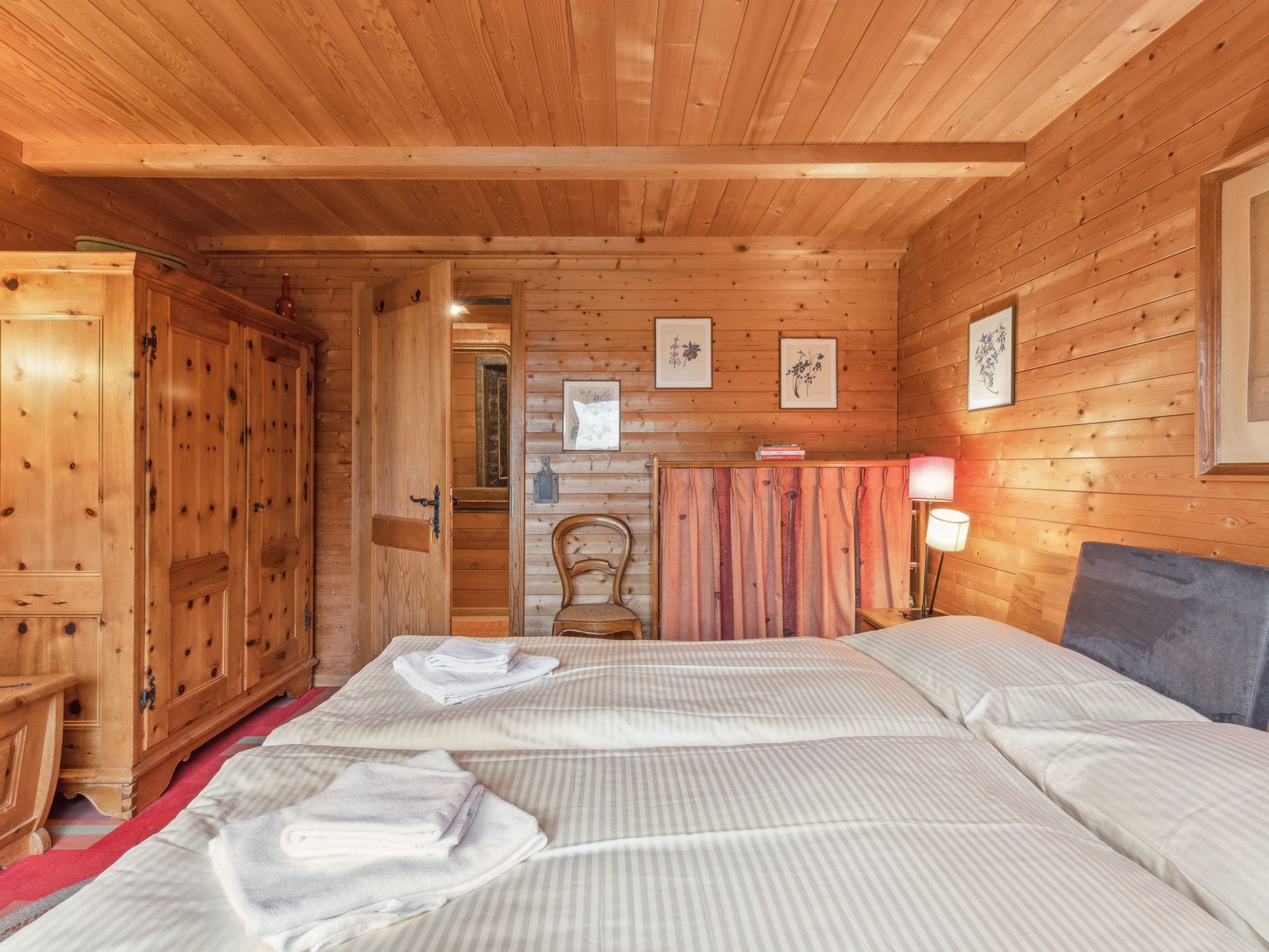 4-Zimmer-Chalet 120 m2 auf 2 Stockwerken. Geräumig, rustikal und gemütlich eingerichtet: Wohn-/Esszimmer mit offenem Kamin, Sat-TV, Radio, CD und DVD. 1 Zimmer mit 1 Doppelbett (2 x 90 cm, Länge 200 cm). Küche (Backofen, Geschirrspüler, 4 Glaskeramikherd Platten, Toaster, Wasserkocher, Mikrowelle, elektrische Kaffeemaschine, Kapseln für die Kaffeemaschine (Dolce Gusto) extra, Racletteofen, Fondue Set (Käse)). Sep. WC, Bad/Dusche/WC. Obergeschoss: abgeschrägt 2 Zimmer, jedes Zimmer mit 2 Betten (90 cm, Länge 200 cm). Grosse Terrasse. Terrassenmöbel. Herrliche Panoramasicht auf die Berge. Zur Verfügung: Bügeleisen, Haartrockner, Holz (extra). Internet (Wireless LAN, gratis). Bitte beachten: geeignet für Familien. Nichtraucher-Unterkunft.