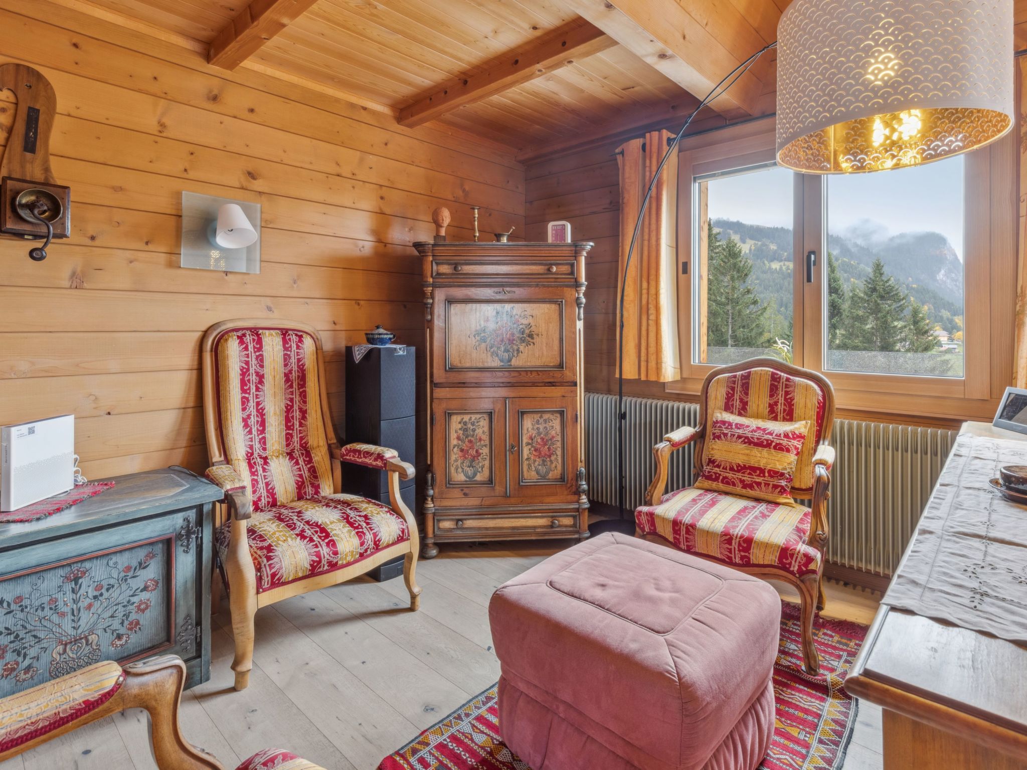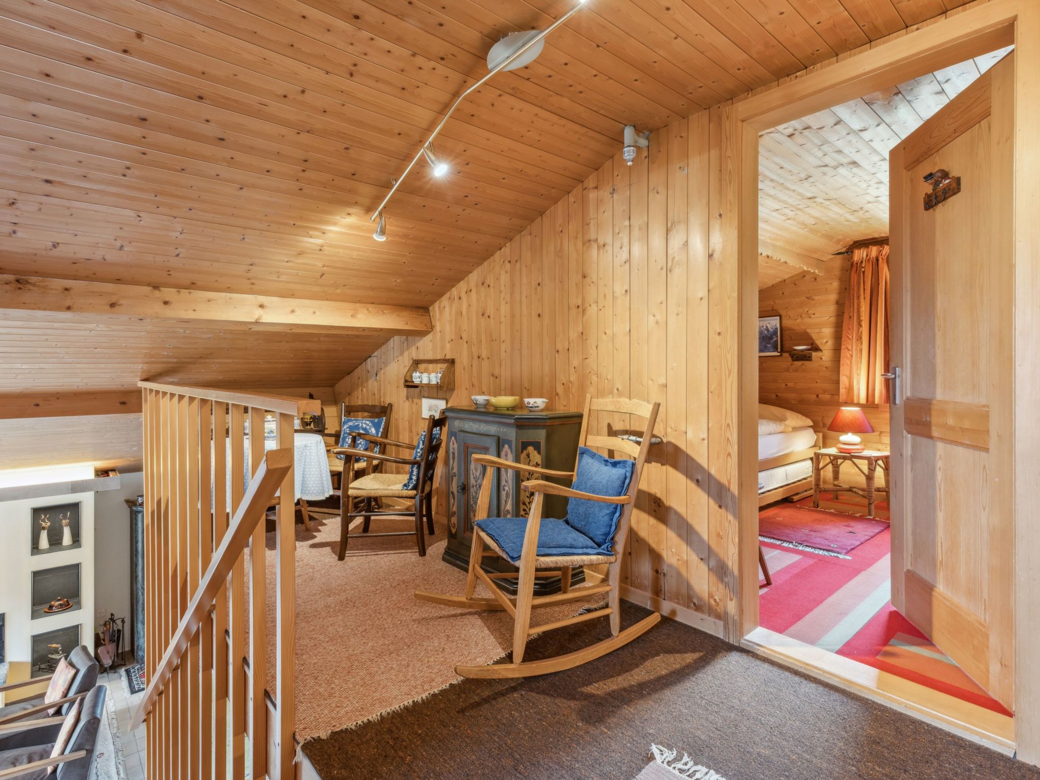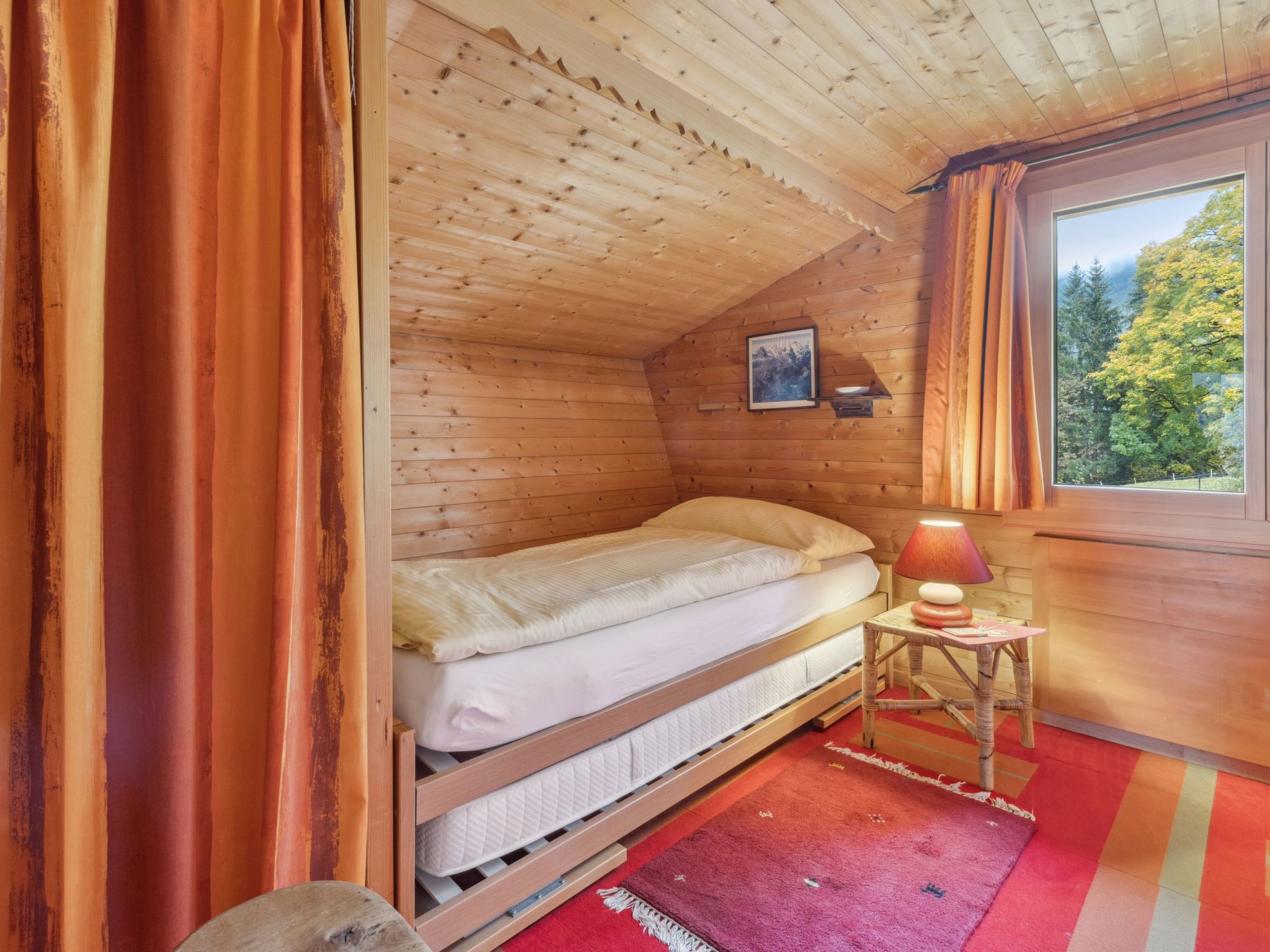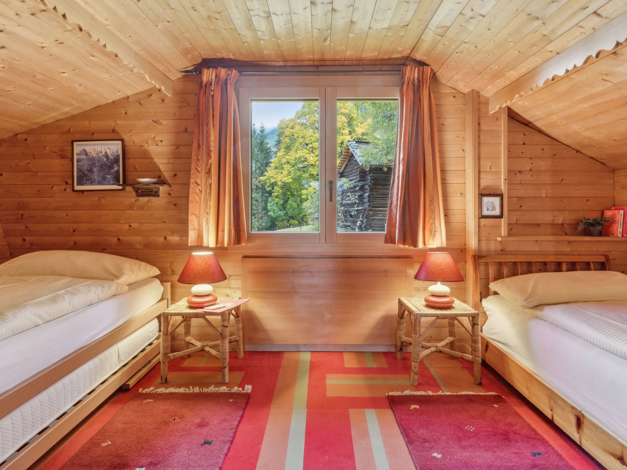4-Zimmer-Chalet 120 m2 auf 2 Stockwerken. Geräumig, rustikal und gemütlich eingerichtet: Wohn-/Esszimmer mit offenem Kamin, Sat-TV, Radio, CD und DVD. 1 Zimmer mit 1 Doppelbett (2 x 90 cm, Länge 200 cm). Küche (Backofen, Geschirrspüler, 4 Glaskeramikherd Platten, Toaster, Wasserkocher, Mikrowelle, elektrische Kaffeemaschine, Kapseln für die Kaffeemaschine (Dolce Gusto) extra, Racletteofen, Fondue Set (Käse)). Sep. WC, Bad/Dusche/WC. Obergeschoss: abgeschrägt 2 Zimmer, jedes Zimmer mit 2 Betten (90 cm, Länge 200 cm). Grosse Terrasse. Terrassenmöbel. Herrliche Panoramasicht auf die Berge. Zur Verfügung: Bügeleisen, Haartrockner, Holz (extra). Internet (Wireless LAN, gratis). Bitte beachten: geeignet für Familien. Nichtraucher-Unterkunft.
