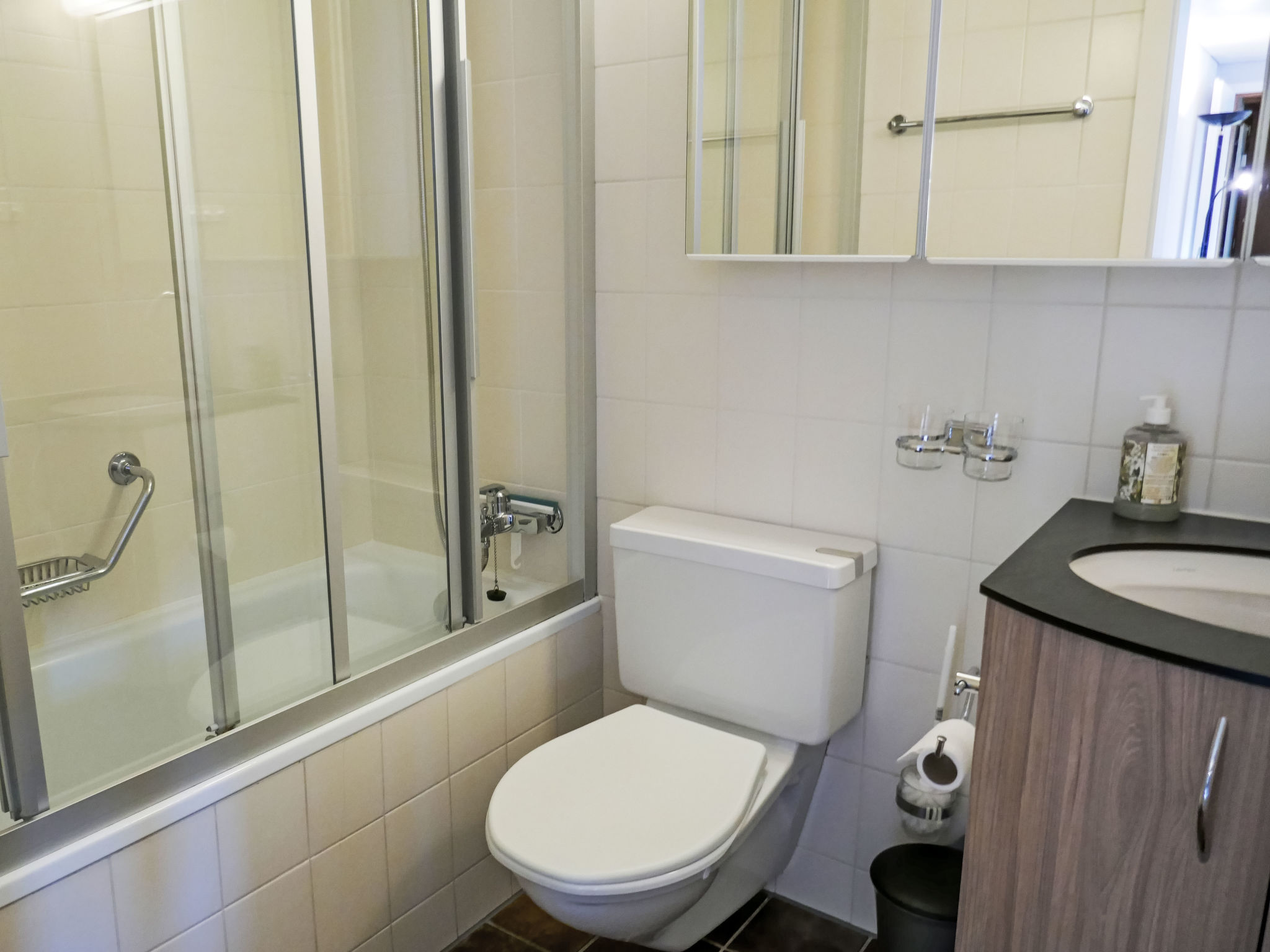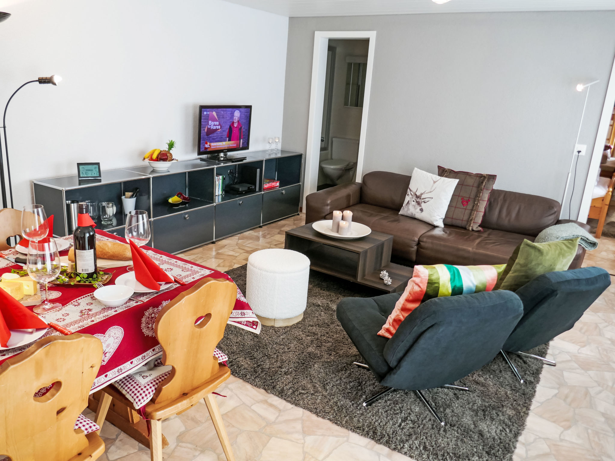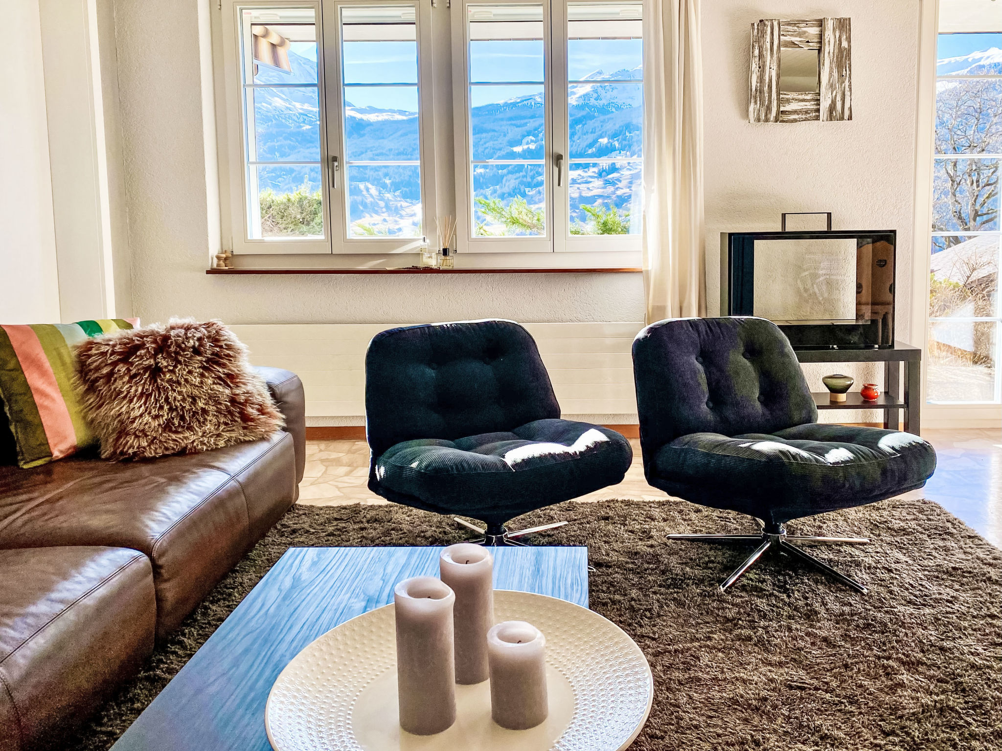 2-Zimmer-Wohnung 53 m2, im Erdgeschoss, Südlage. Hell, gemütlich eingerichtet: Wohn-/Esszimmer mit Kabel-TV, Flachbildschirm und DVD Sammlung vorhanden. Ausgang zur Terrasse, Richtung Süden. 1 Zimmer mit 1 Bett (160 cm, Länge 200 cm), 1 x 2 Etagenbetten (90 cm, Länge 190 cm). (3 Kochplatten, Backofen, Geschirrspüler, Mikrowelle, elektrische Kaffeemaschine, Kapseln für die Kaffeemaschine (Nespresso) extra, Racletteofen, Fondue Set (Käse)). Bad/WC. Parkettböden. Terrasse 15 m2, Südlage. Terrassenmöbel. Herrliche Sicht auf die Berge und Eigernordwand. Zur Verfügung: Waschmaschine, Wäschetrockner, Haartrockner. Internet (Wireless LAN, gratis). Parkplatz Nr. 42D, Garage Nr. 42D. Bitte beachten: geeignet für Familien. Nichtraucher-Unterkunft. Feuerlöscher.