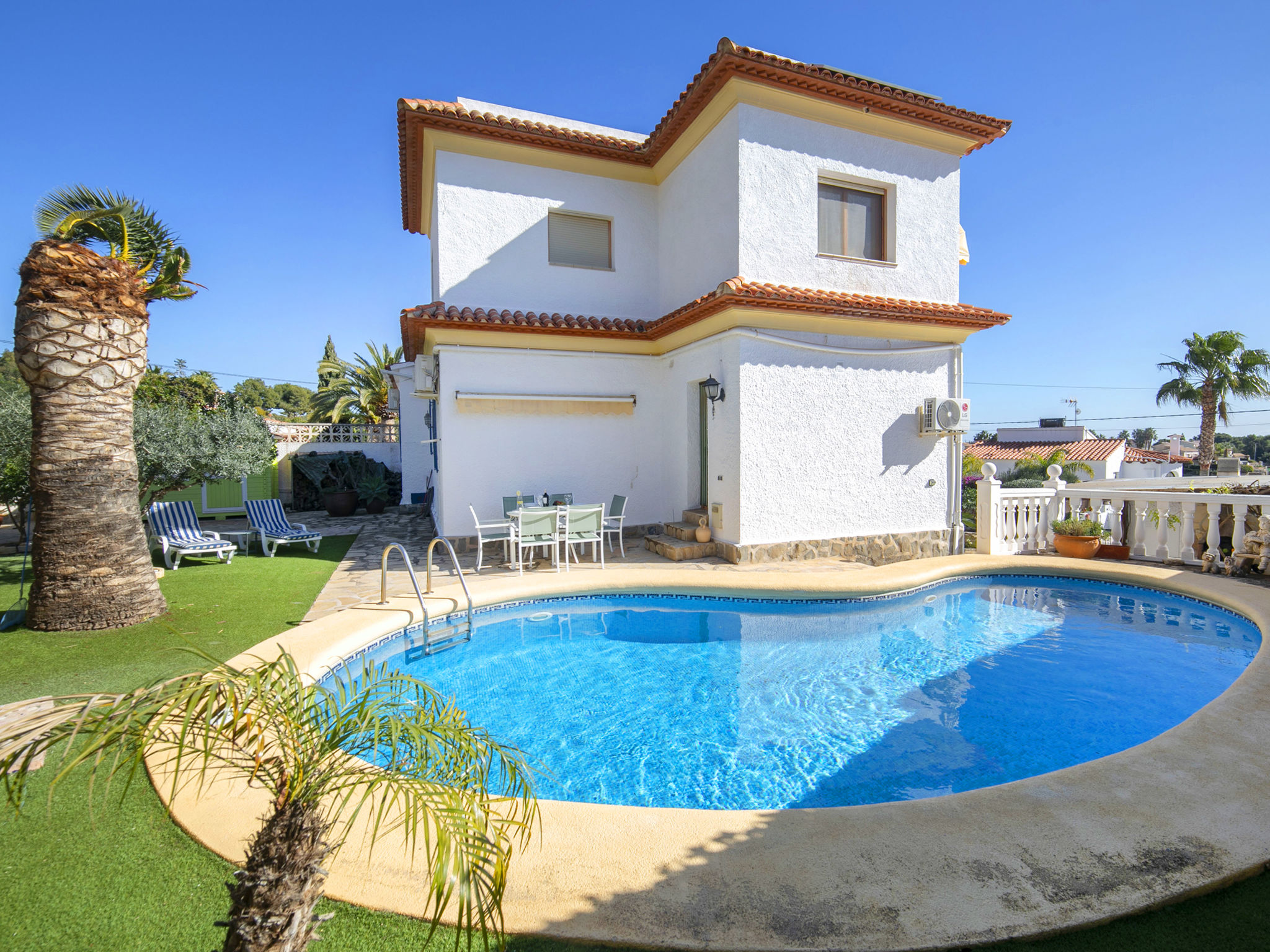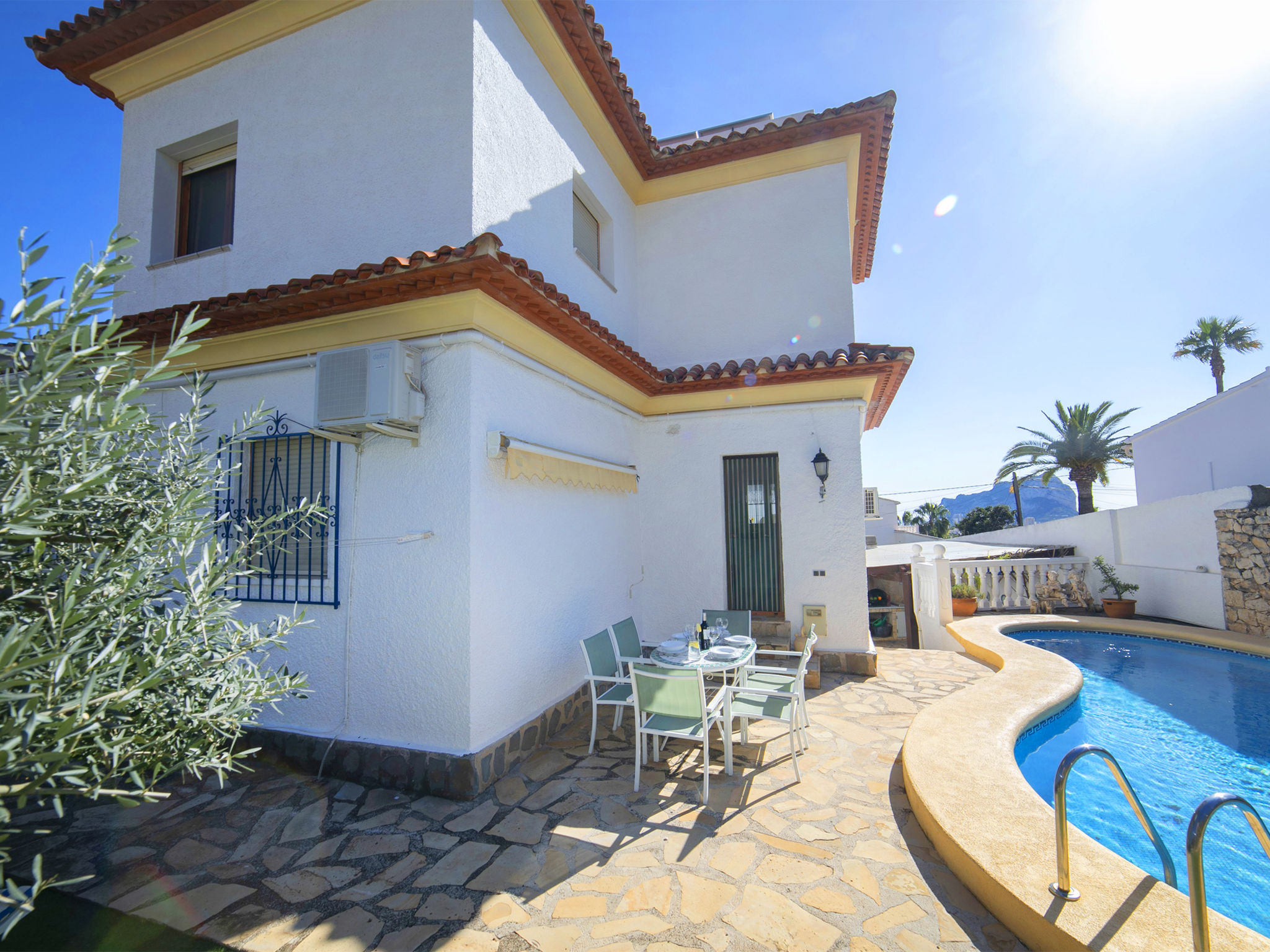 Schöne Villa "Antonia", auf 3 Stockwerken. 4 km vom Zentrum von Calpe, ruhige, sonnige Lage im Villenviertel, verkehrsberuhigte Zone, 2 km vom Meer, 2 km vom Strand, in einer Sackgasse. Zur Alleinbenutzung: Grundstück (eingezäunt), Garten, Schwimmbad (8 x 4 m, saisonale Verfügbarkeit: 01.Jan. - 31.Dez.). Aussendusche, Terrasse, Grill. Lebensmittelgeschäft 3 km, Supermarkt 3 km, Restaurant 2 km, Bäckerei 3 km, Bushaltestelle 1.5 km, Sandstrand "Playa La Fustera" 2 km. Sporthafen 5 km, Jacht-Hafen 5 km, Golfplatz (18 Loch) 9 km. Nahe gelegene Sehenswürdigkeiten: Aqualandia, Mundomar, Terra Mítica, Terra Natura, Benidorm Palace (Benidorm), Les Fonts de l'Algar, Castillo de Guadalest. Der Besitzer akzeptiert keine Jugendgruppen.