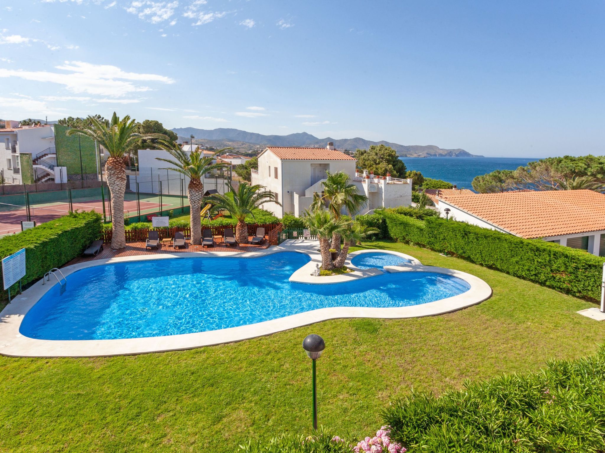 Fane de Baix 5 km von El Port de la Selva: Feriensiedlung "Palmiers I". 2 km vom Zentrum von Llançà, 50 m vom Meer. Zur Mitbenutzung: Grundstück 6'000 m2 mit Pflanzen und Bäumen, Schwimmbad (17 x 7 m, saisonale Verfügbarkeit: 03.Mai. - 30.Sep.) mit Salzelektrolyse-Reinigungssystem. Tennis, Kinderspielplatz (Schaukel), Parkplatz in 100 m. Einkaufszentrum 2 km, Restaurant 2 km, Bushaltestelle "Ayuntamiento Llançà" 2.6 km, Bahnstation "Llançà" 3.2 km, Sandstrand 2 km, Kieselstrand, Badebucht 400 m. Golfplatz (18 Loch) 17 km. Bitte beachten: Weitere Unterkünfte sind buchbar. Tennis 1 h, von 9-18 Uhr gratis.