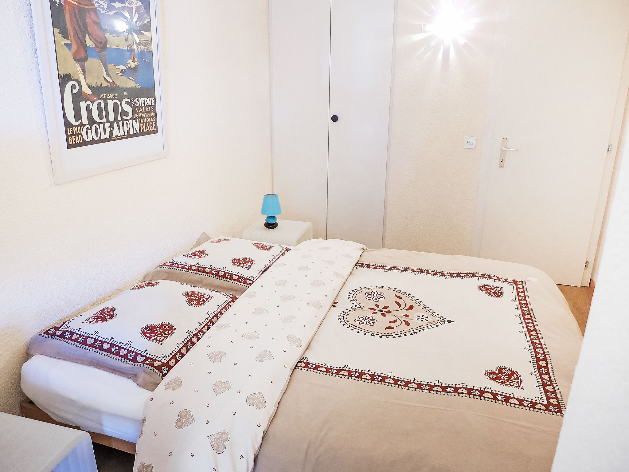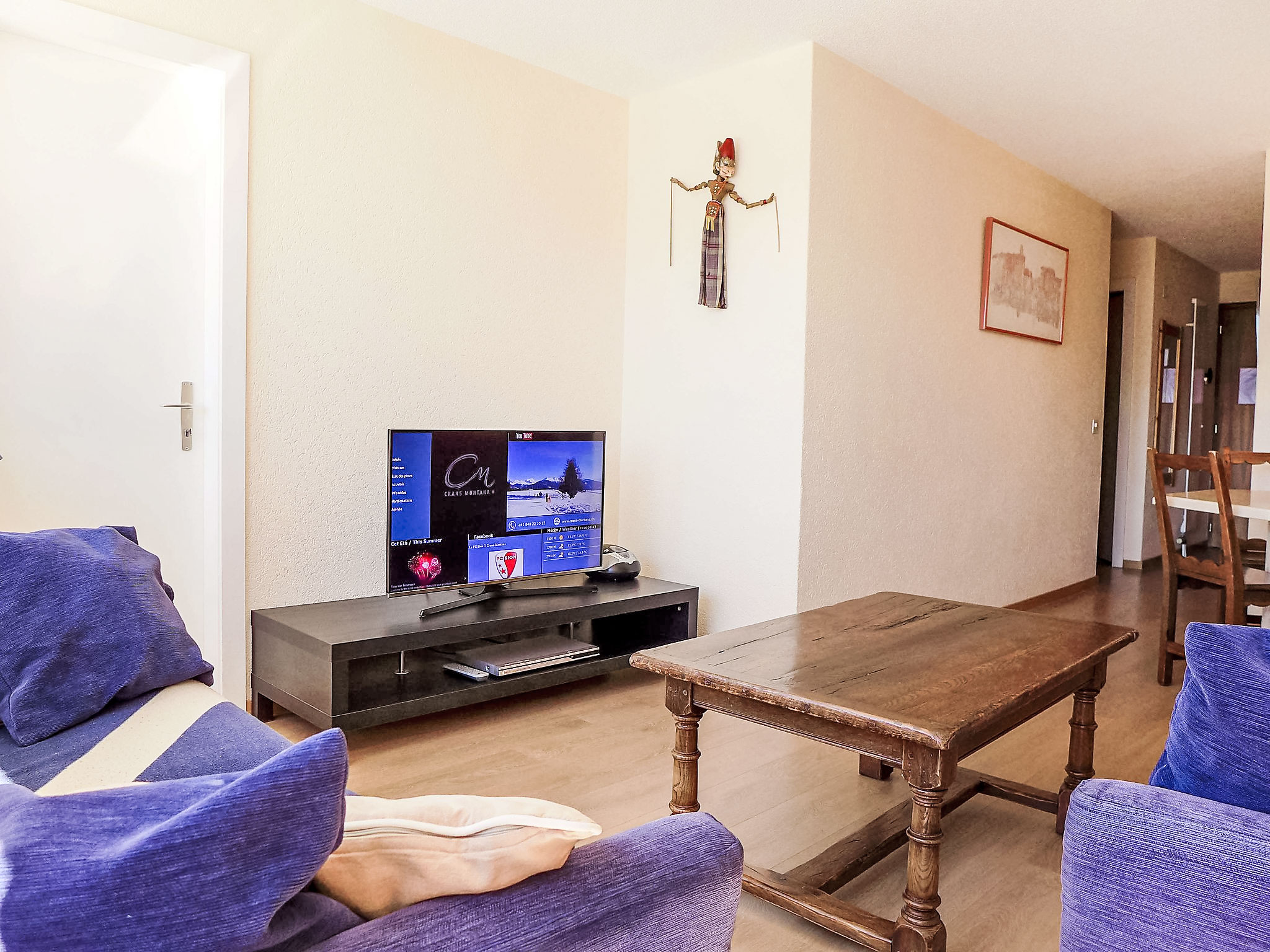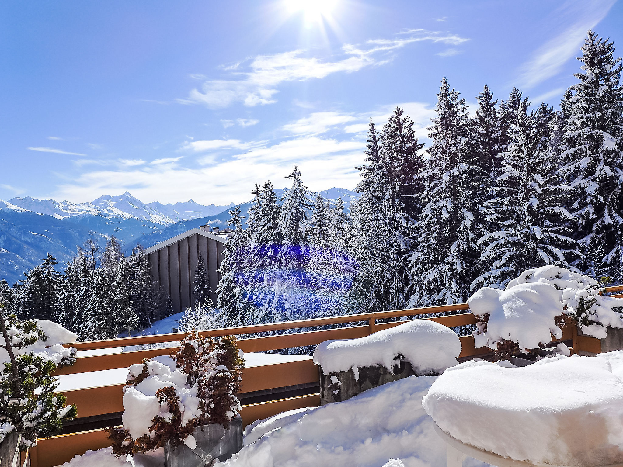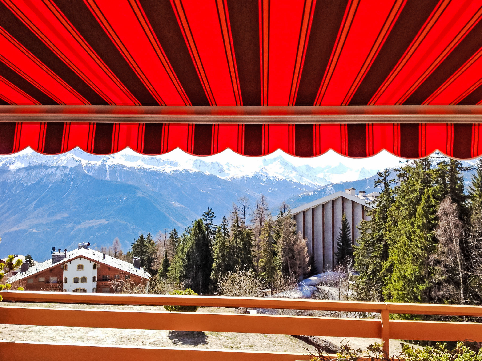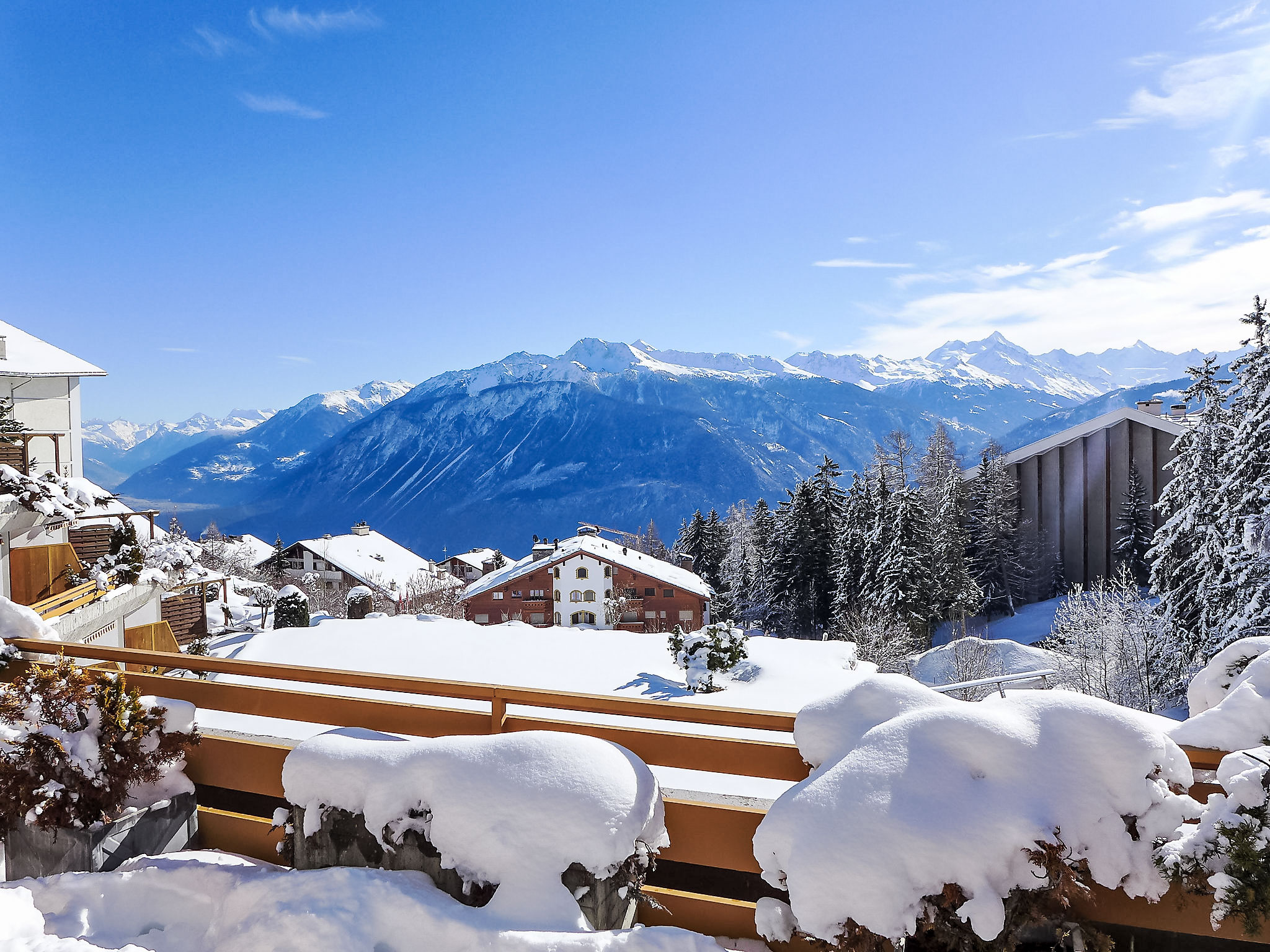 Terrassenhaus "Terrasse des Alpes". Im Ortsteil Marigny, 400 m vom Zentrum von Montana, sonnige Lage. Zur Mitbenutzung: Hallenbad beheizt (12 x 5 m, saisonale Verfügbarkeit: 01.Jan.-31.Okt. und 01.Dez.-31.Dez. Öffnungszeiten Schwimmbad: 08:00-20:00). Sprudelbad, Terrasse. Im Hause: Aufenthaltsraum, Fahrstuhl, Skiraum, Waschmaschine, Wäschetrockner (zur Mitbenutzung, extra). Einkaufsgeschäft, Supermarkt, Restaurant, Bar, Café 400 m, Bushaltestelle "Montana Poste" 300 m. Golfplatz (18 Loch) 3.8 km, Skisportanlagen 1.5 km. COVID-Messungen: Zugang zum Pool mit 2G+. Schwimmbad (ca. 26°) und Sprudelbad (ab 16 Jahre alt) im November geschlossen. Das Gebäude wurde auf einem geneigten Grundstück erbaut. Die Stockwerke werden als Ebenen betrachtet, die ab Residenzboden nummeriert sind. Bei starkem Schneefall, ist es gemäss den Anweisungen des Administrators untersagt, die Terrassen vom Schnee zu räumen.