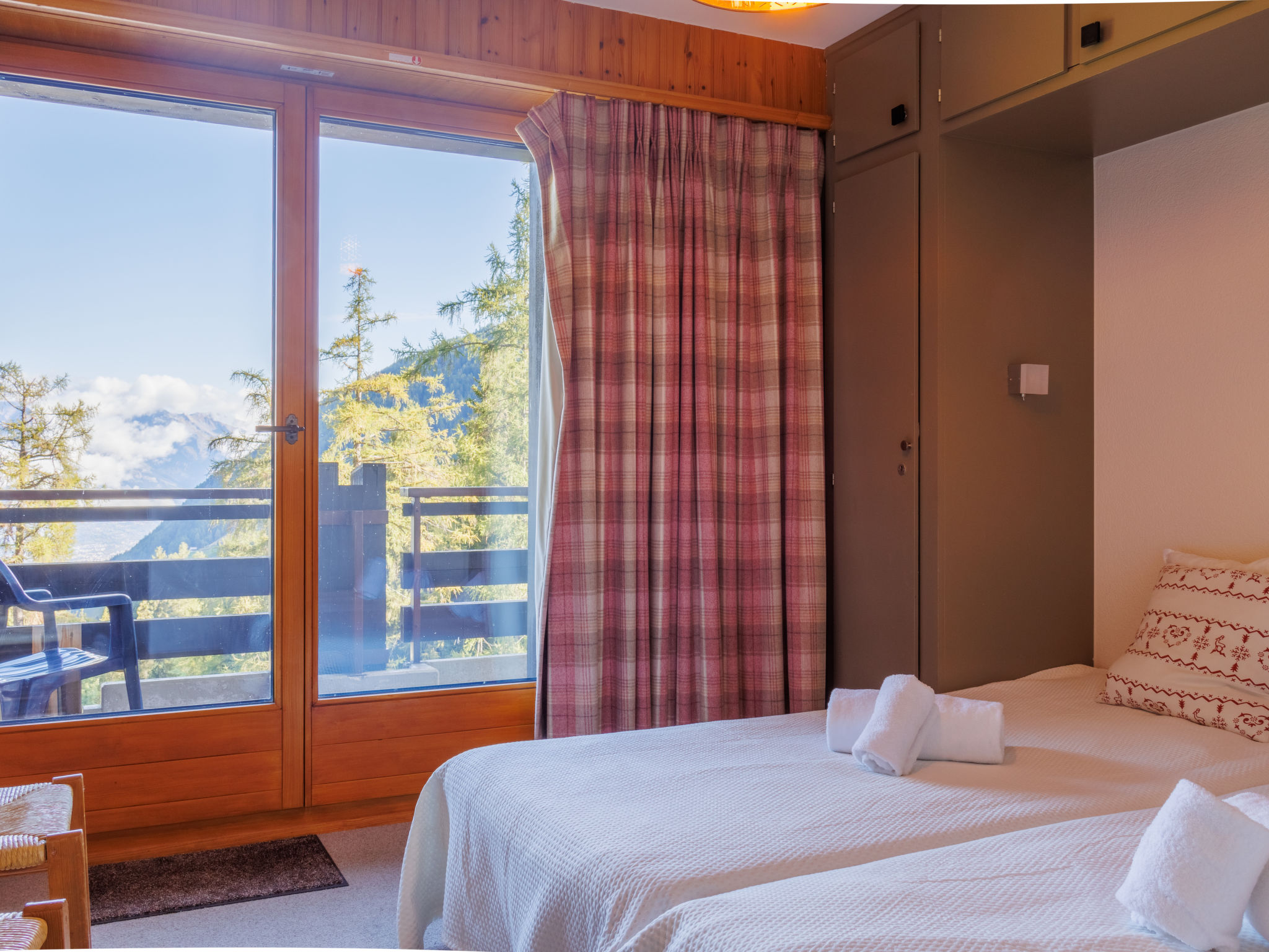 "Dents Rousses B4", 4-Zimmer-Wohnung 90 m2 im 4. Stock. Komfortabel und schön eingerichtet: Wohn-/Esszimmer mit offenem Kamin, Kabel-TV, Flachbildschirm, Radio und CD. Ausgang zum Balkon, zur Terrasse. 1 Zimmer mit 1 franz. Bett (140 cm, Länge 190 cm). 1 Zimmer mit 1 Doppelbett (2 x 90 cm, Länge 190 cm). Ausgang zum Balkon, Richtung Norden. 1 Kinderzimmer mit 2 x 2 Etagenbetten (80 cm, Länge 190 cm). Offene Küche (Backofen, Geschirrspüler, 4 Induktionskochplatten, Mikrowelle, Fondue Set (Käse)). Bad/WC, Dusche/WC. Balkon, Südlage Balkon, Nordlage Terrasse, Südwestlage. Balkonmöbel, Gartengrill. Sicht auf die Skipiste. Zur Verfügung: Kinderhochstuhl, Babybett, Haartrockner. Internet (Wireless LAN, gratis). Garage Nr. 2. Bitte beachten: Nichtraucher-Haus. Rauchmelder. Smart Fernsehen.