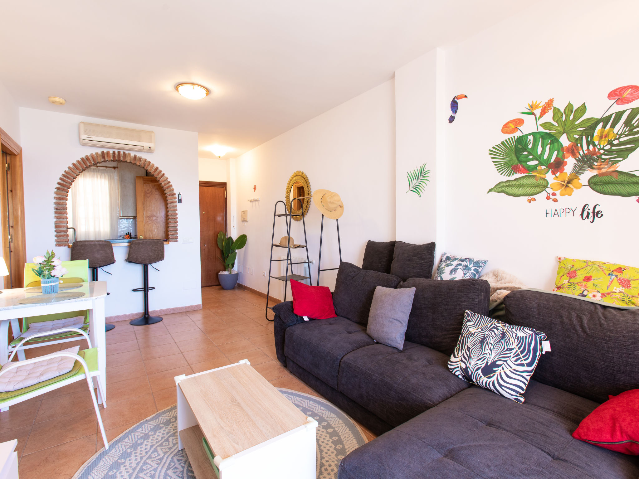 "Ladera del Mar", 2-Zimmer-Wohnung 45 m2, Südlage. Hell, zweckmässig und komfortabel eingerichtet: Wohn-/Esszimmer mit 1 Doppeldiwanbett (180 cm, Länge 200 cm), Bar, Digital-TV, Flachbildschirm, Klimaanlage und Warmluftheizung. Ausgang zur Terrasse. 1 Zimmer mit 2 Betten (90 cm, Länge 190 cm), Ventilator. Ausgang zur Terrasse. Offene Küche (Backofen, Geschirrspüler, Toaster, Wasserkocher, Mikrowelle, Tiefkühler, elektrische Kaffeemaschine, Kapseln für die Kaffeemaschine (Tassimo)) mit Bar. Bad/WC. E-Heizung. Terrasse. Terrassenmöbel, Liegestühle (1), Sitzplatz. Herrliche Panoramasicht auf das Meer und das Schwimmbad. Zur Verfügung: Waschmaschine, Bügeleisen, Kinderhochstuhl, Babybett bis 2 Jahre, Haartrockner. Internet (WLAN, gratis). Bitte beachten: geeignet für Familien. Maximal 1 kleines Haustier/Hund erlaubt. Rauchmelder, Feuerlöscher. VFT/MA/37705 // Reg. Nr.: ESFCTU00002901300079051700000000000000000VUT/MA337052