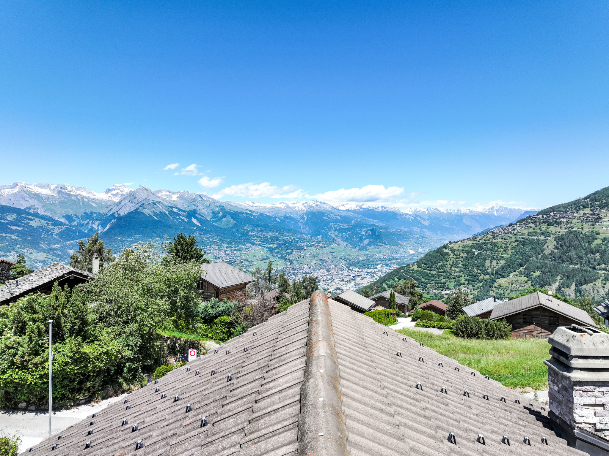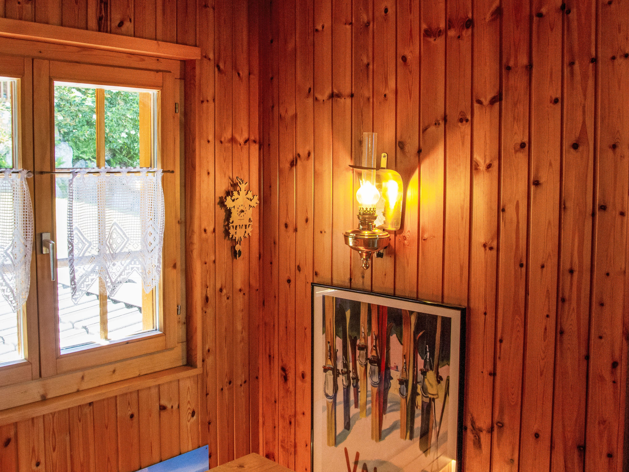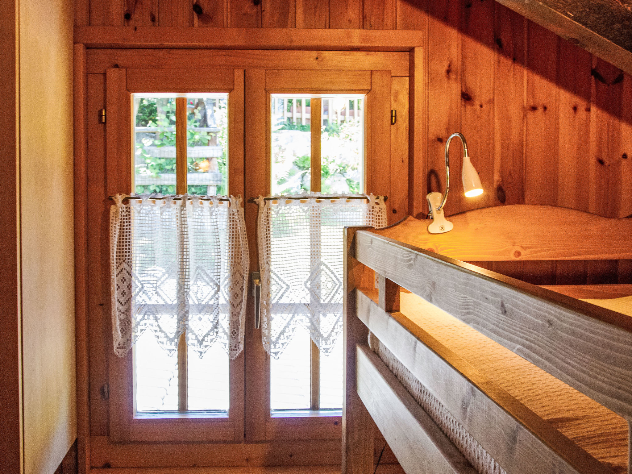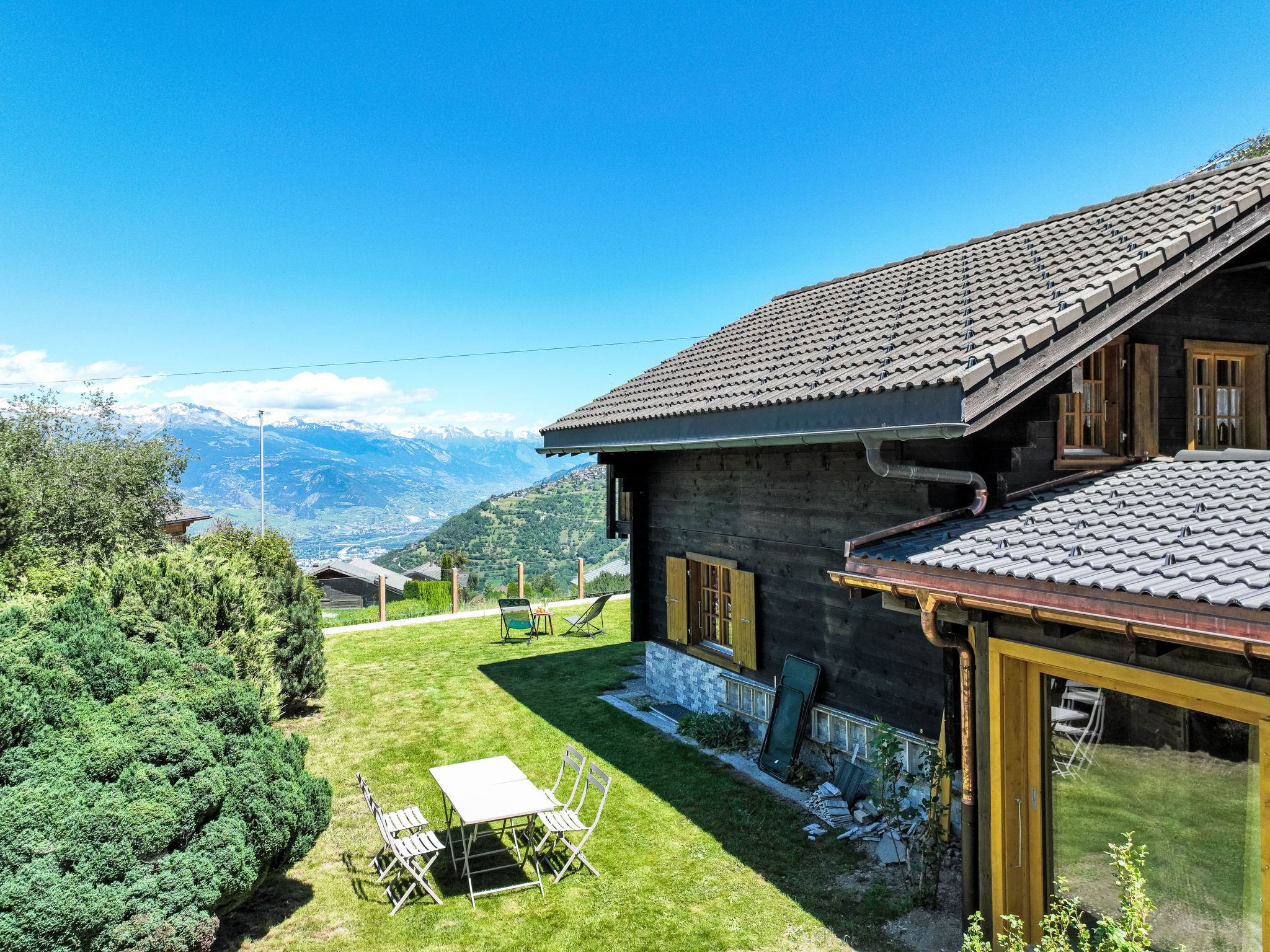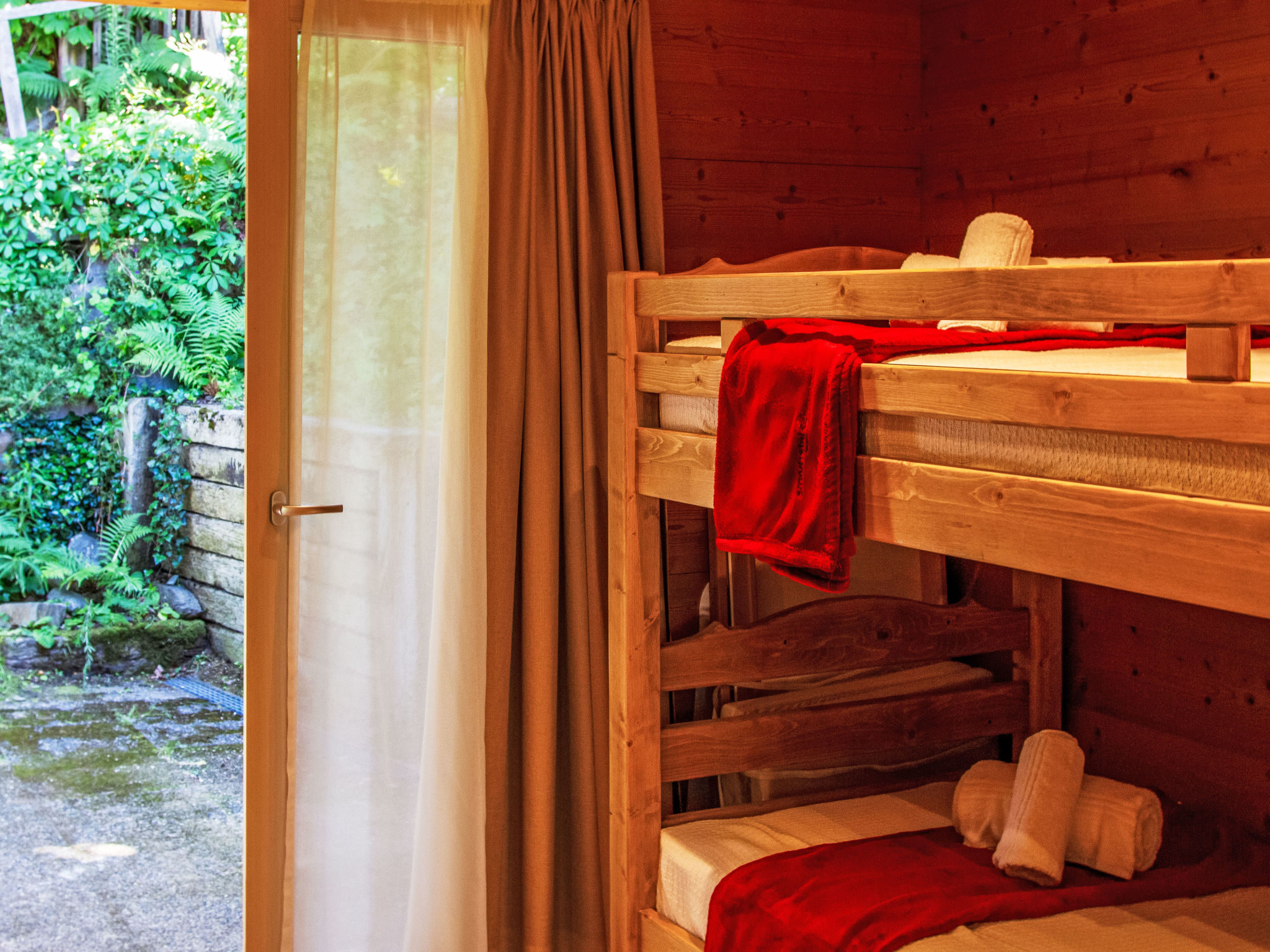 "Mirabeau", 4-Zimmer-Chalet 83 m2 auf 2 Stockwerken, Ostlage. Teilweise abgeschrägt, komfortabel und schön eingerichtet: Eingang. Wohn-/Esszimmer mit offenem Kamin, Kabel-TV, Stereoanlage und DVD. Ausgang zum Garten, zur Terrasse. Offene Küche (Backofen, Geschirrspüler, 4 Glaskeramikherd Platten, elektrische Kaffeemaschine, Kapseln für die Kaffeemaschine (Nespresso) extra, Racletteofen, Fondue Set (Käse)). Ausgang zur Veranda. Sep. WC. Obergeschoss: 1 Zimmer mit 1 franz. Bett (160 cm, Länge 200 cm). Ausgang zum Balkon, Richtung Osten. 1 kleines Kinderzimmer mit 1 x 2 Etagenbetten (80 cm, Länge 200 cm). 1 Zimmer mit 1 Doppelbett (2 x 90 cm, Länge 200 cm). Ausgang zum Balkon, Richtung Osten. Dusche/WC. Balkon, Ostlage, Terrasse, Ostlage. Terrassenmöbel, Gartengrill (mobil), Liegestühle (4), Wintergarten. Sehr schöne Sicht auf die Berge und das Tal. Zur Verfügung: Waschmaschine, Wäschetrockner, Kinderhochstuhl, Babybett, Haartrockner. Internet (Wireless LAN, gratis). Parkplatz. Bitte beachten: Nichtraucher-Unterkunft. 1 Haustier/Hund erlaubt. Unbeheizte Veranda. Warmwasser begrenzt.