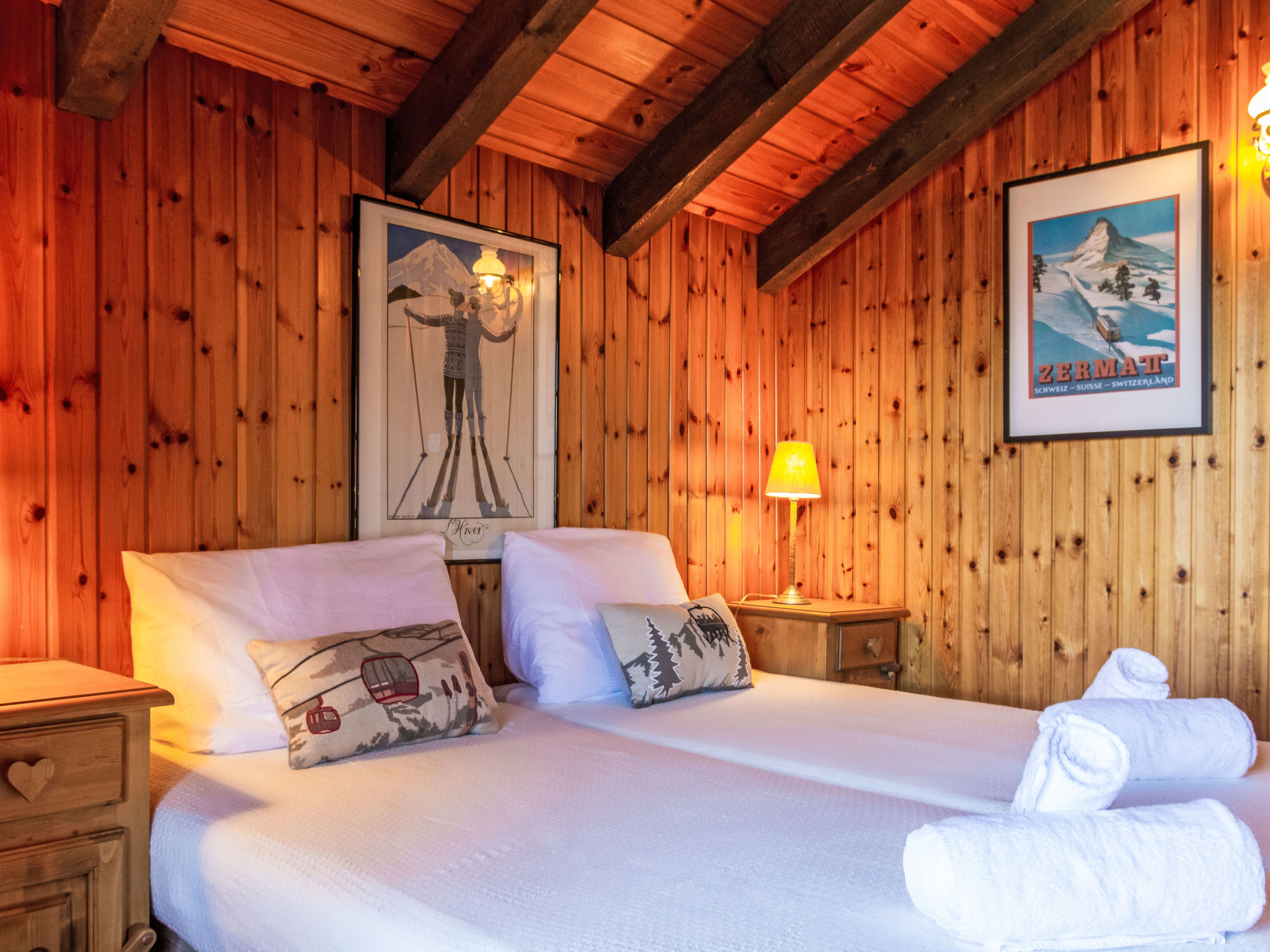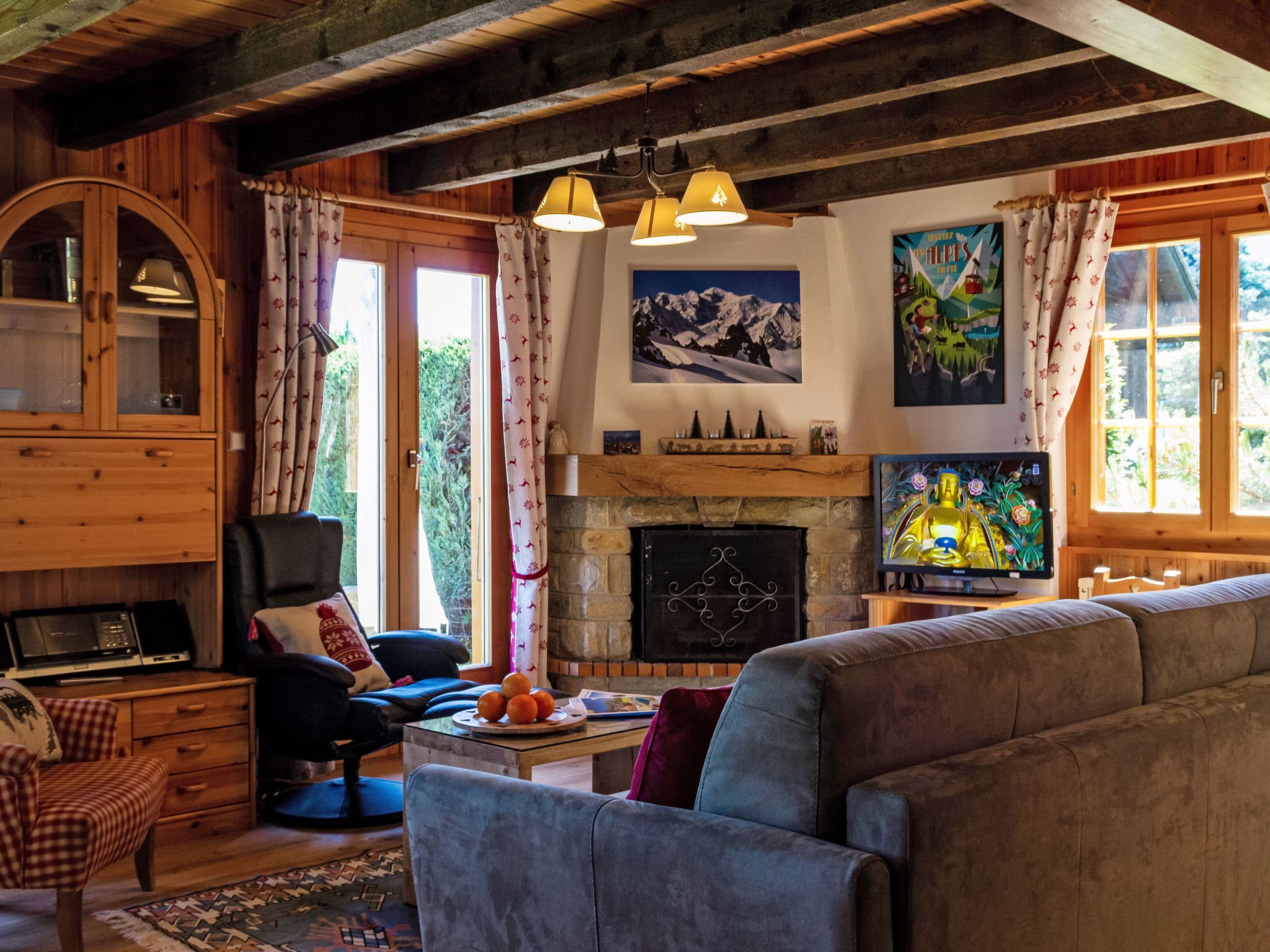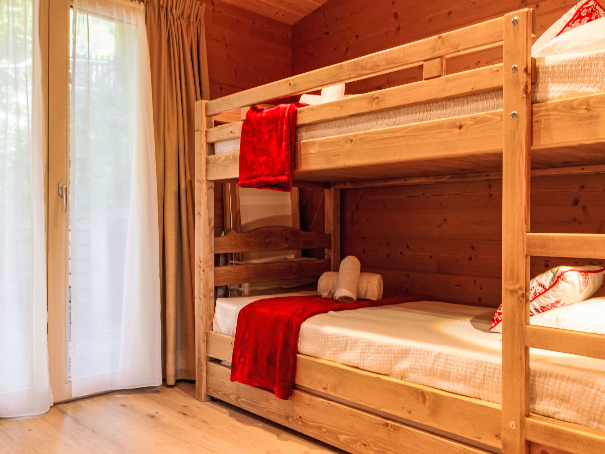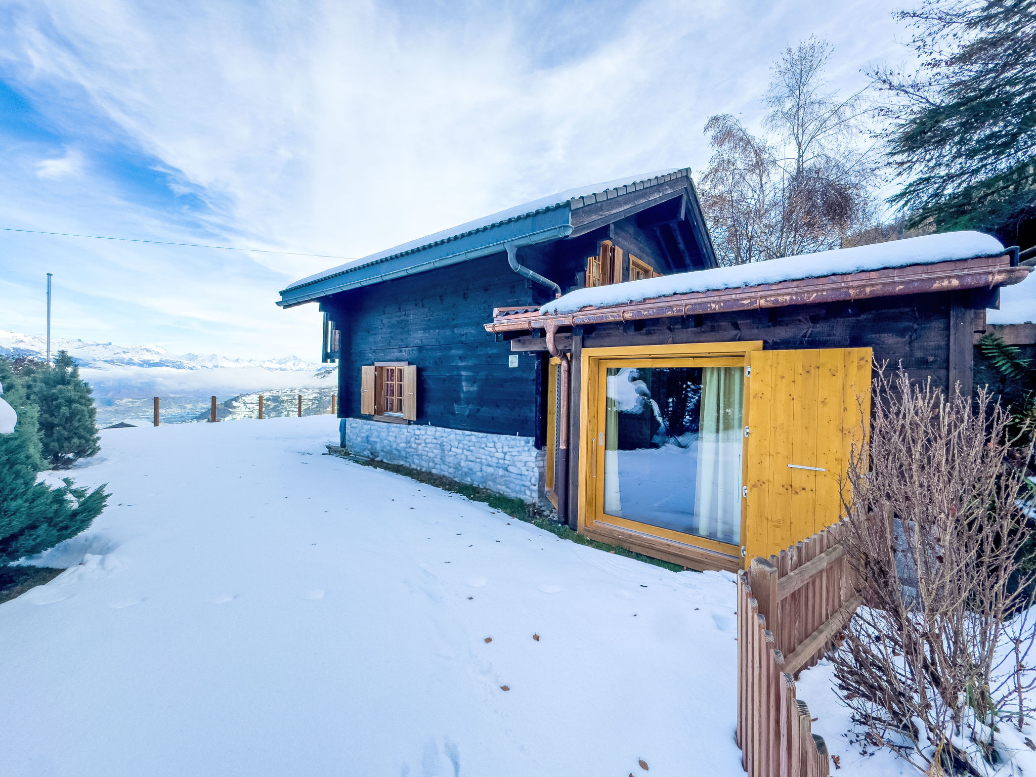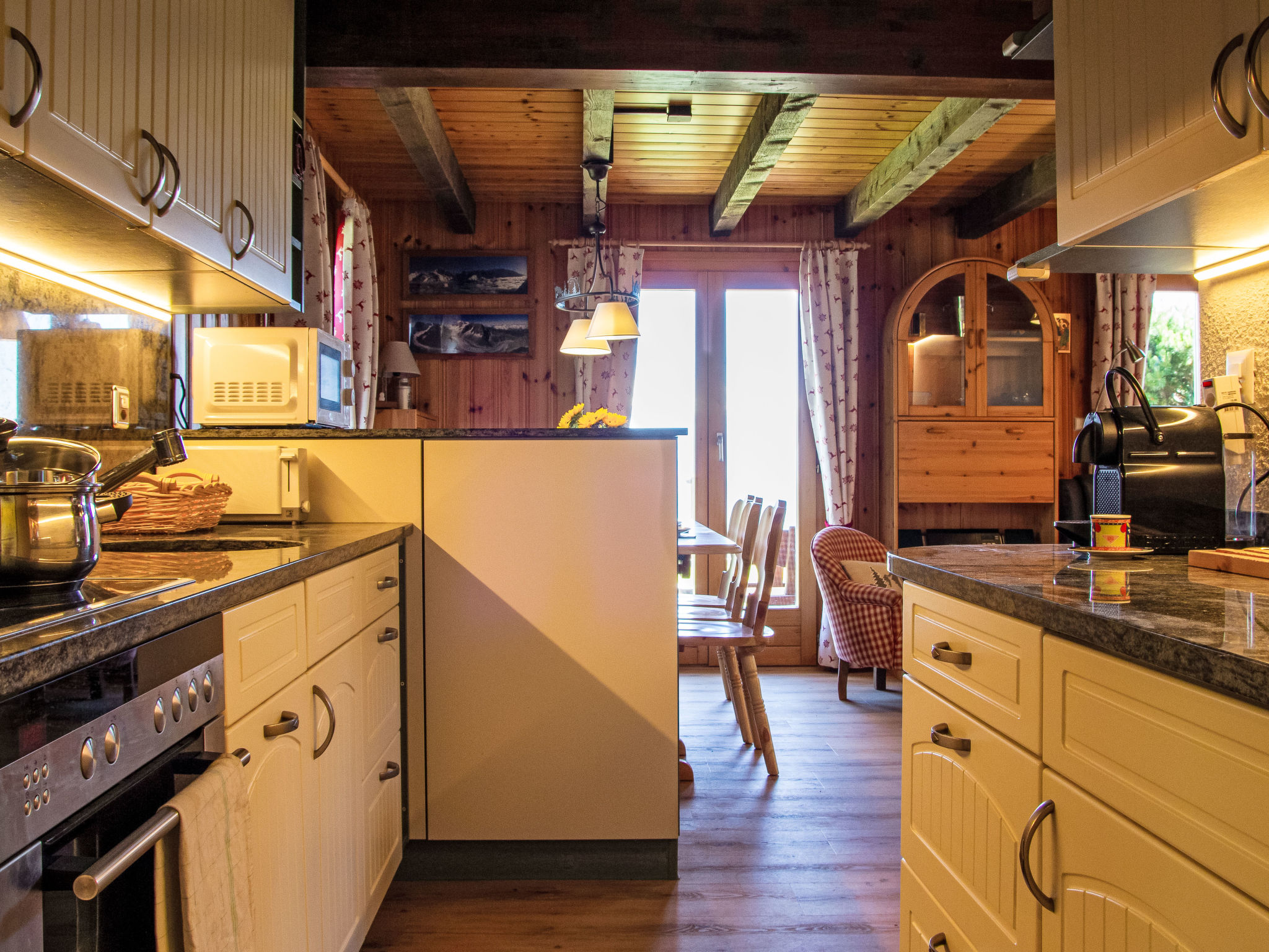 "Mirabeau", 4-Zimmer-Chalet 83 m2 auf 2 Stockwerken, Ostlage. Teilweise abgeschrägt, komfortabel und schön eingerichtet: Eingang. Wohn-/Esszimmer mit offenem Kamin, Kabel-TV, Stereoanlage und DVD. Ausgang zum Garten, zur Terrasse. Offene Küche (Backofen, Geschirrspüler, 4 Glaskeramikherd Platten, elektrische Kaffeemaschine, Kapseln für die Kaffeemaschine (Nespresso) extra, Racletteofen, Fondue Set (Käse)). Ausgang zur Veranda. Sep. WC. Obergeschoss: 1 Zimmer mit 1 franz. Bett (160 cm, Länge 200 cm). Ausgang zum Balkon, Richtung Osten. 1 kleines Kinderzimmer mit 1 x 2 Etagenbetten (80 cm, Länge 200 cm). 1 Zimmer mit 1 Doppelbett (2 x 90 cm, Länge 200 cm). Ausgang zum Balkon, Richtung Osten. Dusche/WC. Balkon, Ostlage, Terrasse, Ostlage. Terrassenmöbel, Gartengrill (mobil), Liegestühle (4), Wintergarten. Sehr schöne Sicht auf die Berge und das Tal. Zur Verfügung: Waschmaschine, Wäschetrockner, Kinderhochstuhl, Babybett, Haartrockner. Internet (Wireless LAN, gratis). Parkplatz. Bitte beachten: Nichtraucher-Unterkunft. 1 Haustier/Hund erlaubt. Unbeheizte Veranda. Warmwasser begrenzt.