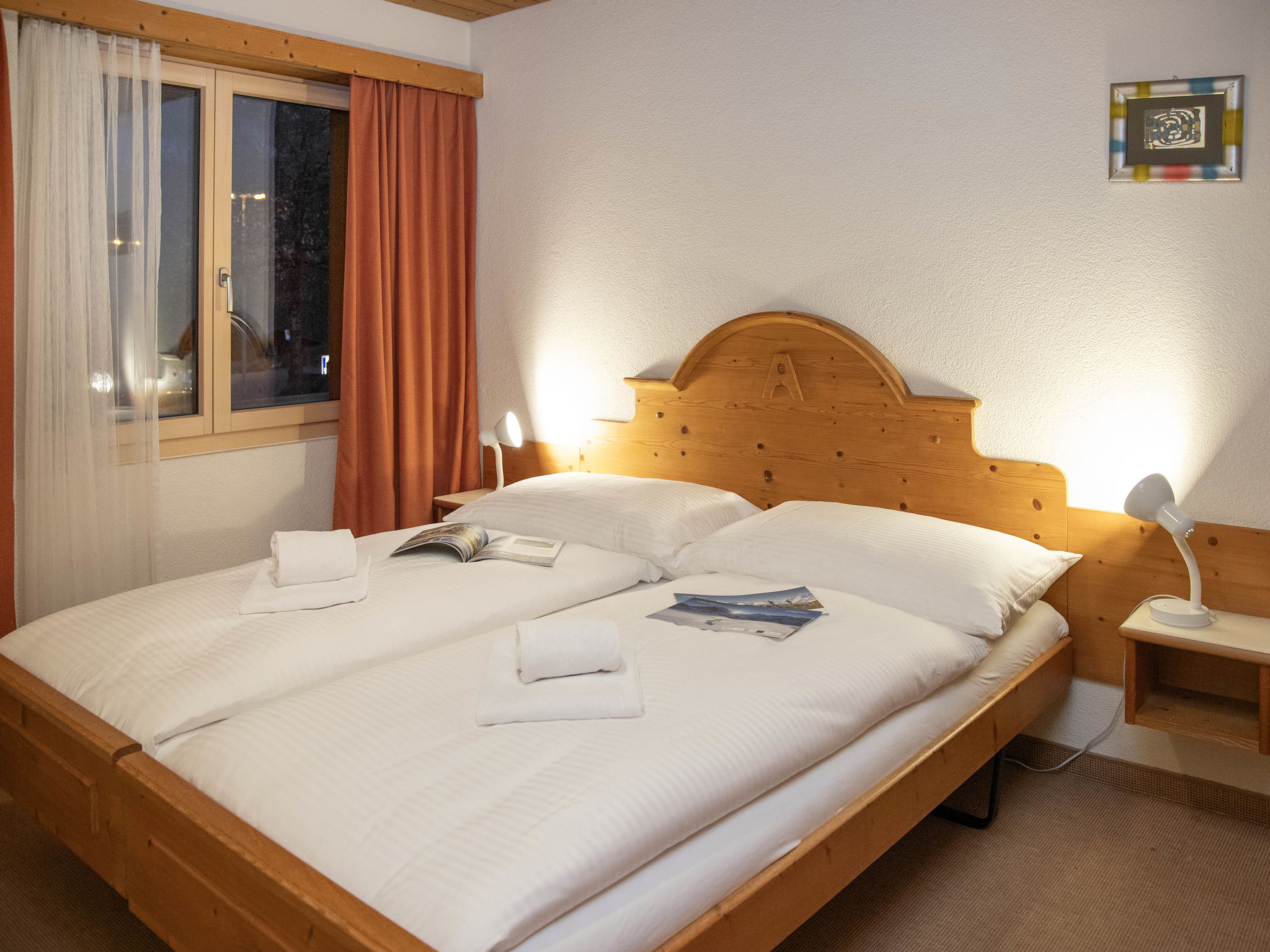 2-Zimmer-Wohnung 64 m2 im 1. Stock, Südlage. Wohn-/Esszimmer mit 2 Betten und Kabel-TV (Flachbildschirm). 1 Doppelzimmer. Offene Küche (Backofen, 4 Glaskeramikherd Platten, Wasserkocher, elektrische Kaffeemaschine). Bad/WC. Kleiner Balkon, Südlage. Balkonmöbel. Schöne Sicht auf die Berge. Zur Verfügung: Haartrockner. Internet (Wireless LAN, gratis). Bitte beachten: Nichtraucher-Unterkunft. Maximal 1 Haustier/Hund erlaubt. Ein Fondue Set (Fleisch oder Käse) sowie ein Raclette Ofen kann an der Rezeption ausgeliehen werden.