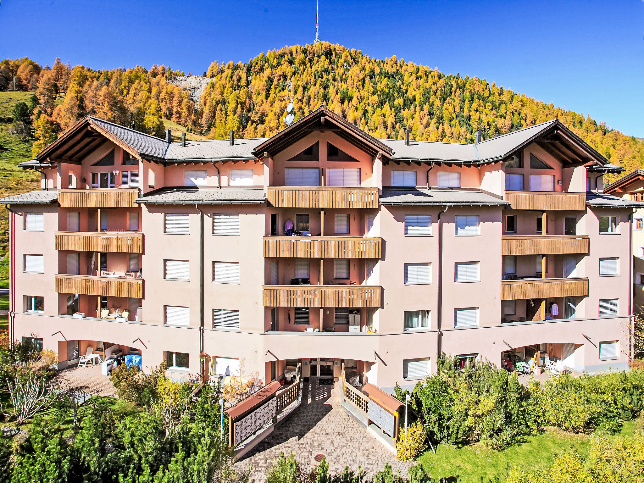 St. Moritz-Dorf: Schönes Mehrfamilienhaus "Chesa Sur Val", auf 5 Stockwerken. Am Ortsrand, 600 m vom Zentrum von St.Moritz Dorf, 1.6 km vom See, 1.9 km vom Skigebiet. Im Hause: Fahrstuhl, Skiraum, Waschmaschine, Wäschetrockner (zur Mitbenutzung, extra), Trockenraum. Einkaufsgeschäft 400 m, Lebensmittelgeschäft 700 m, Supermarkt 1.8 km, Restaurant 120 m, Bar 700 m, Bäckerei, Café 900 m, Fußgängerzone 600 m, Fahrradverleih 2.3 km, Bushaltestelle "St. Moritz, Bären" 120 m, Bahnstation 1.5 km, Hallenbad 2.7 km, Thermalbad "Heilbadzentrum St. Moritz" 2.9 km, See St. Moritzer See 1.6 km. Golfplatz (9 Loch) 700 m, Surfschule 7.3 km, Tennis 3 km, Tennishalle 3 km, Minigolf 2.7 km, Reitstall 4.3 km, Wanderwege ab Haus 200 m, Radweg 2.7 km, Luftseilbahn 2.9 km, Bergbahn, Skilift 850 m, Skipisten 2 km, Skiverleih 850 m, Skibushaltestelle 120 m, Skischule, Kinderskischule 850 m, Schlittelbahn 4.5 km, Langlaufloipe 2.7 km, Eisfeld 300 m, Kinderspielplatz 2.8 km. Nahe gelegene Sehenswürdigkeiten: Segantini Museum 1.6 km, Engadiner Museum 1.4 km, Mili Weber-Haus 4.4 km, Olympia Bob Run mit Museum 280 m, Nietzsche Museum in Sils-Maria 11.6 km. Bekannte Skigebiete sind gut erreichbar: Corviglia Piz Nair 2 km, Corvatsch - Furtschellas 8.5 km, Diavolezza - Lagalb 18.5 km. Bekannte Seen in der Umgebung sind gut erreichbar: St. Moritzer See 1.6 km, Silvaplaner See 7.3 km, Silser See 11.6 km. Wandergebiete: Stazerwald & Stazersee, Corviglia Piz Nair, Muottas Muragl. Bitte beachten: Die Schlüsselübergabe findet bei der Agentur Interhome in St. Moritz Bad statt. In diesem Haus sind weitere Ferienwohnungen mietbar.
