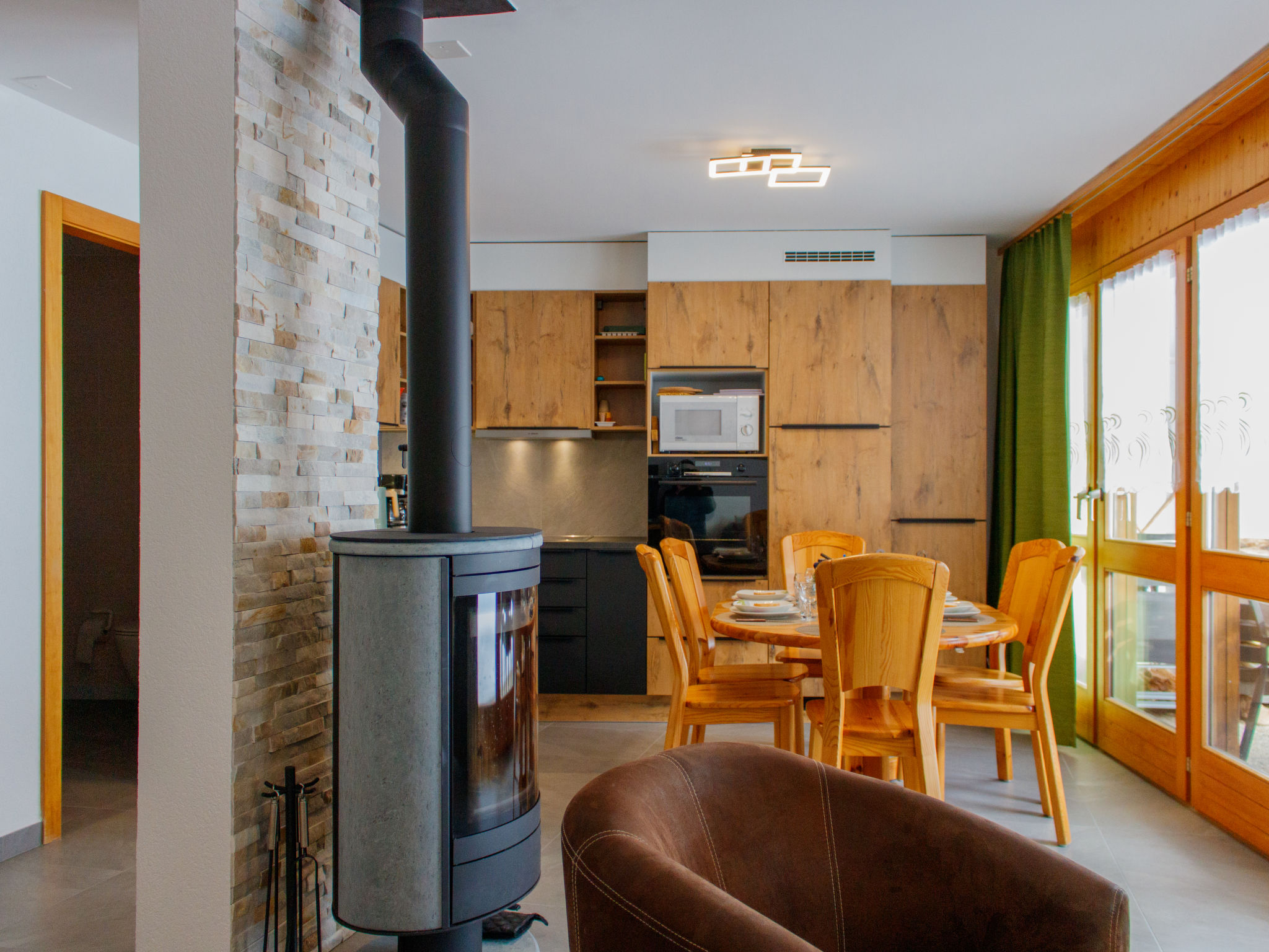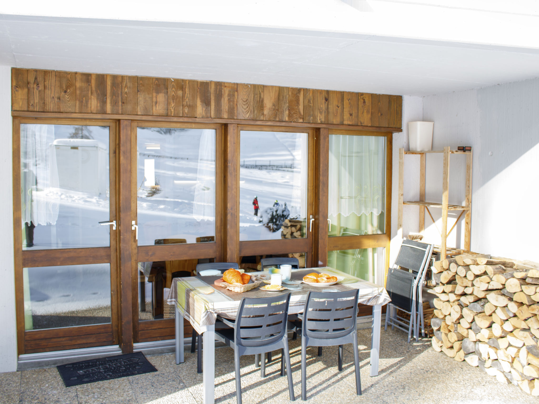 3-Zimmer-Wohnung, 2 Etagen, ca. 85 m². Eingang in 1. Etage: Flur mit Garderobe. Abstellraum. Zweibettzimmer. Schlafzimmer mit Dreierbett (2 Personen unten, Bett 1,20 m breit, 1 Person oben). Dusche/WC. Vom Flur Treppe ins Erdgeschoss: Abstellraum. Wohn-/Schlafraum mit Sitzgruppe/Doppelbettcouch, Kamin, offene Küche (4 Ceranfelder, Backofen, Mikrowelle, Geschirrspüler, Kühlschrank, Kaffeemaschine, Wasserkocher, Toaster, Raclette-Set, Fondue-Set) mit Essplatz und Terrassenausgang mit Zugang zum Kinderskilift. Bad/WC. Maximale Belegung: 6 Personen.