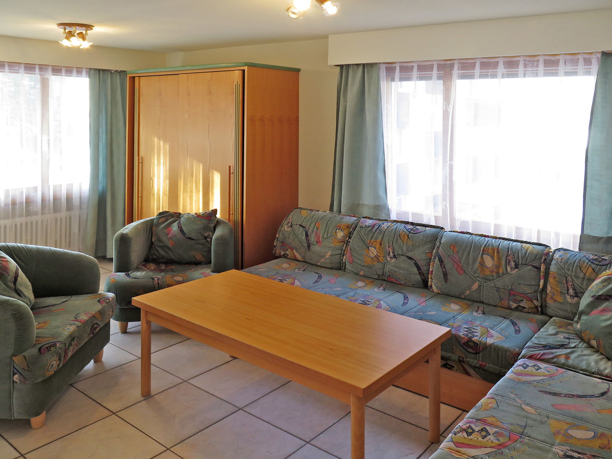 3-Zimmer-Wohnung 65 m2, im Obergeschoss. Gemütlich eingerichtet: Wohn-/Esszimmer mit 2 Schlafmöglichkeiten und Sat-TV (Flachbildschirm), Radio und DVD. Ausgang zum Balkon, Richtung Süden. 2 Doppelzimmer, jedes Zimmer mit Waschbecken. Offene Küche (3 Kochplatten, Backofen, Wasserkocher, Mikrowelle, elektrische Kaffeemaschine, Fondue Set (Käse)). Bad/WC oder Dusche/WC. Ölheizung. Balkon, Südlage. Balkonmöbel, Liegestühle (2). Panoramasicht auf die Berge und die Ortschaft. Zur Verfügung: Internet (Wireless LAN, gratis). Bitte beachten: Nichtraucher-Unterkunft.