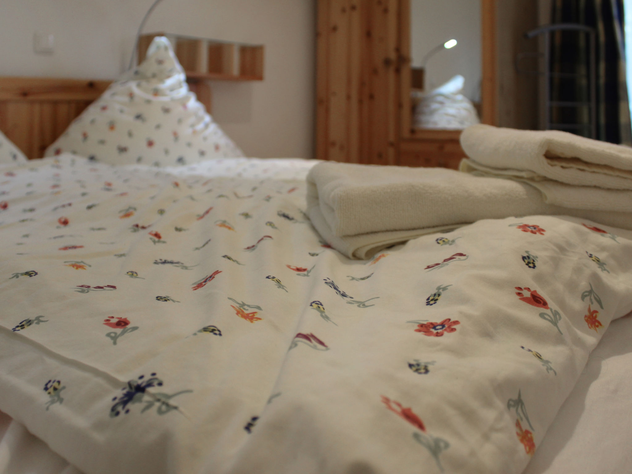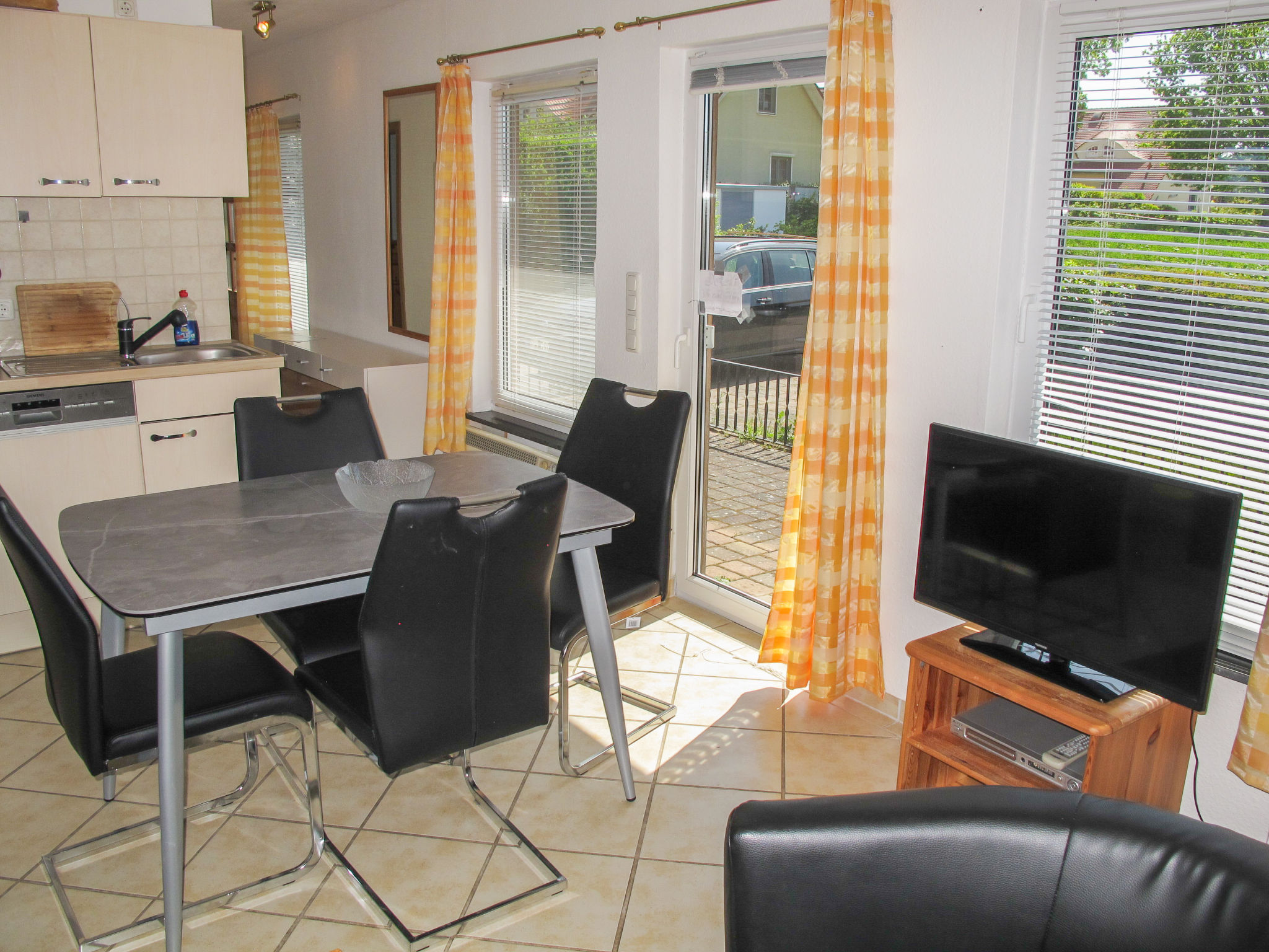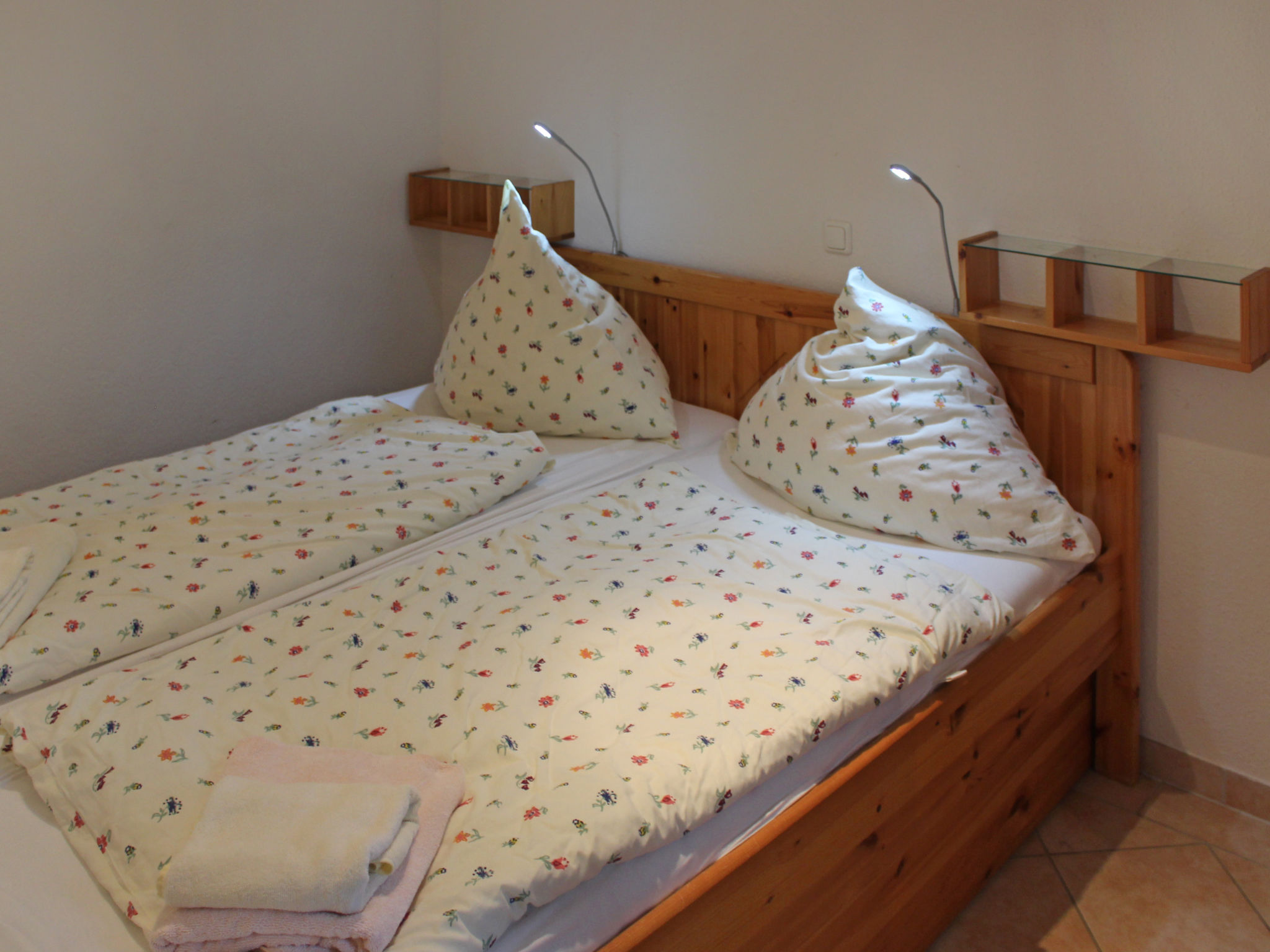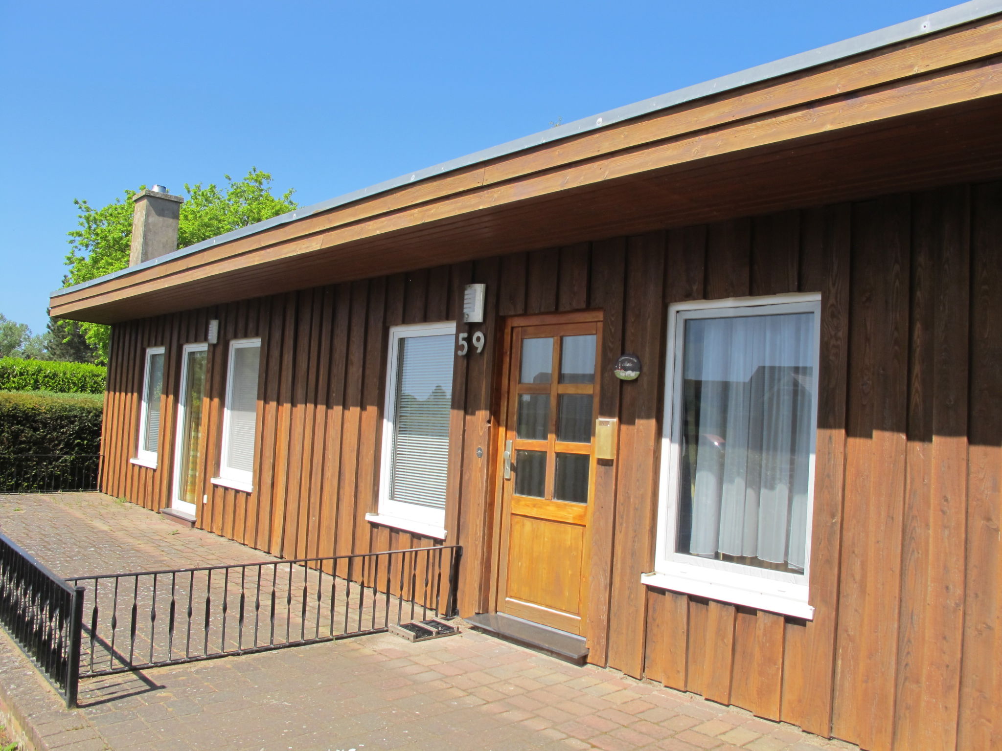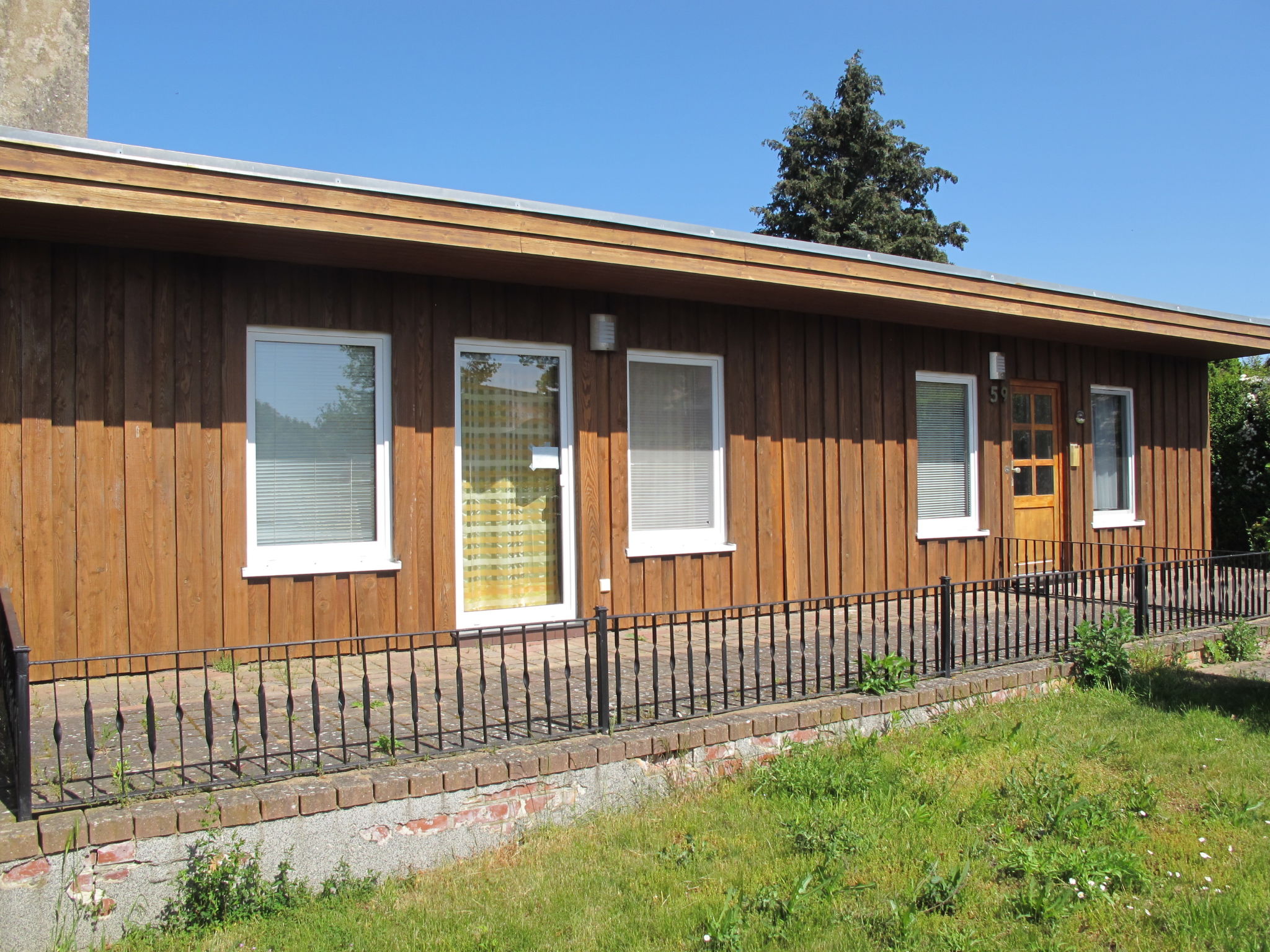 3-Zimmer-Bungalow 45 m2, im Erdgeschoss. Gemütlich eingerichtet: Wohn-/Esszimmer 12 m2 mit Schwedenofen und Sat-TV (Flachbildschirm), CD. Ausgang zur Terrasse. 1 Zimmer mit 1 Doppelbett (180 cm, Länge 200 cm), Sat-TV (Flachbildschirm). 1 kleines Kinderzimmer mit 1 x 2 Etagenbetten (90 cm, Länge 200 cm). Kochnische (Backofen, Geschirrspüler, 4 Glaskeramikherd Platten, Wasserkocher, elektrische Kaffeemaschine). Dusche/WC. E-Heizung. 2 Terrassen, Südlage und Nordlage. Terrassenmöbel, Gartengrill (mobil). Zur Verfügung: Sauna, Holz (extra). Bitte beachten: Nichtraucher-Haus. Maximal 1 Haustier/Hund erlaubt. Rauchmelder, Feuerlöscher. Die Sauna mit Ruheraum und die beiden buchbaren Zusatzbetten (Tandembett, 2 x 90 cm, Länge 200 cm) befinden sich in einem Nebengebäude (separater Eingang).