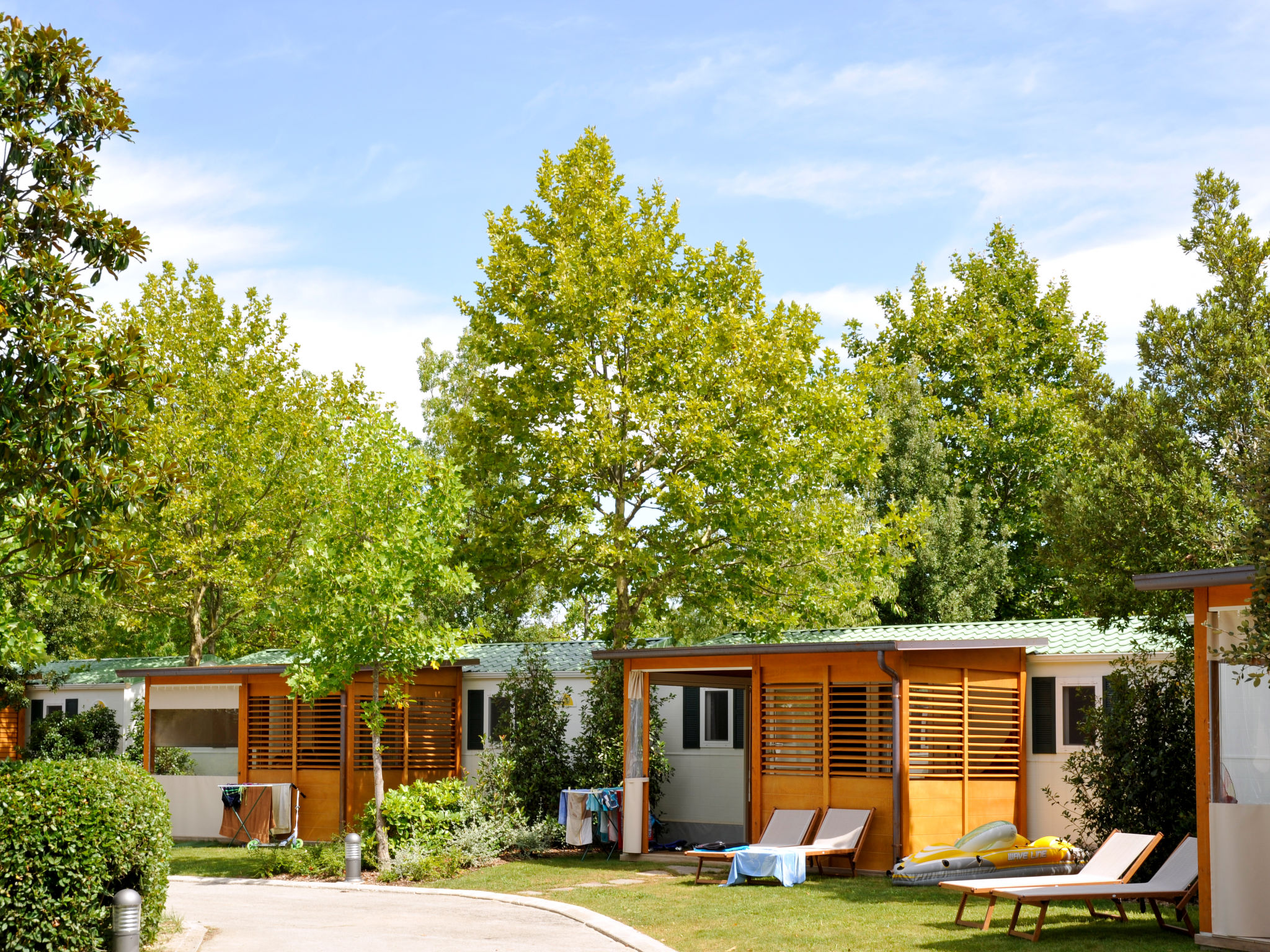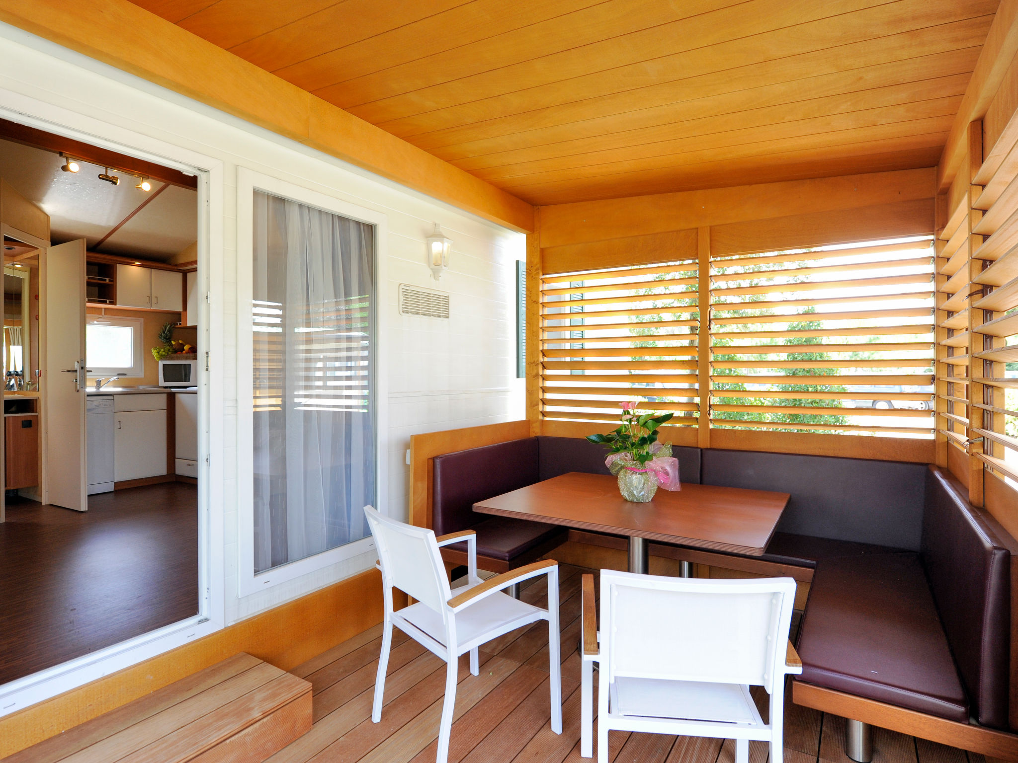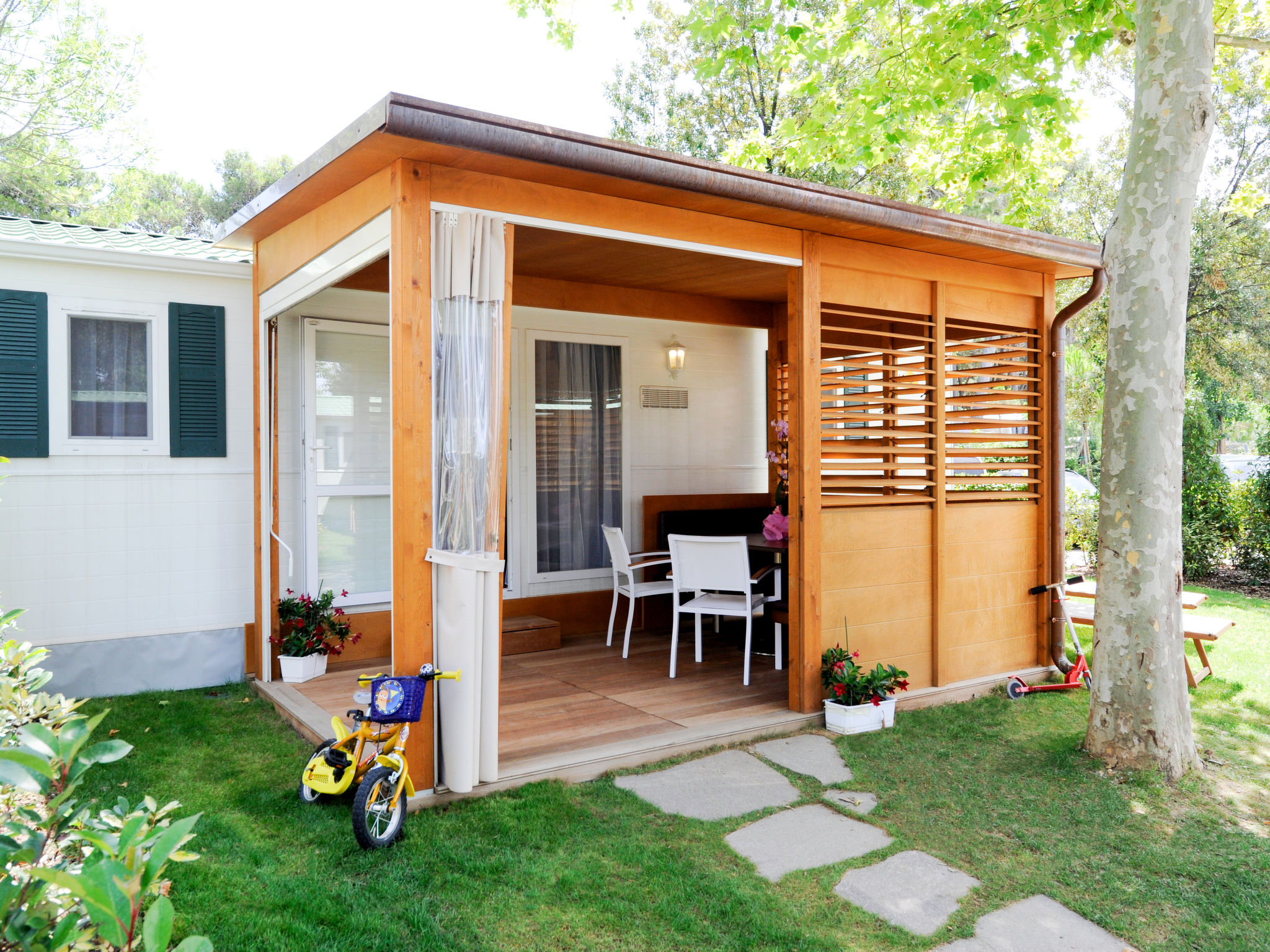 "Exotic", 4-Zimmer-Mobilheim 35 m2. Objekt geeignet für 6 Erwachsene + 1 Kind. Eingang mit Veranda mit Esstisch. 1 Doppelzimmer. 1 Zimmer mit 2 Betten. 1 Zimmer mit 2 Betten und 1 x 1 Etagenbetten (65 cm, Länge 180 cm). Küche (3 Kochplatten, Geschirrspüler, Wasserkocher, Mikrowelle, elektrische Kaffeemaschine). Dusche/WC, sep. WC. Klimaanlage, Warmluftheizung. Terrasse überdacht. Liegestühle (2). Zur Verfügung: Safe, Fliegengitter, Kinderhochstuhl, Babybett (extra). Parkplatz (1 Auto). Bitte beachten: Nichtraucher-Haus. Strandentfernung ca. 80-260 m. IT031009B28ZDV3E5N