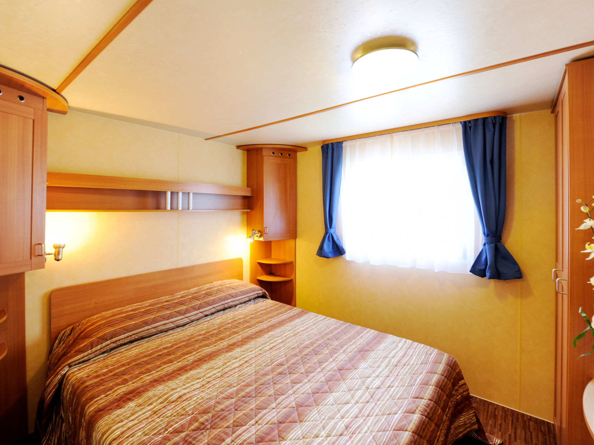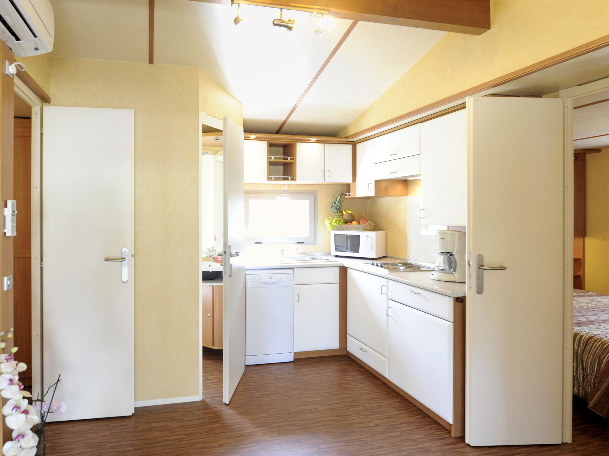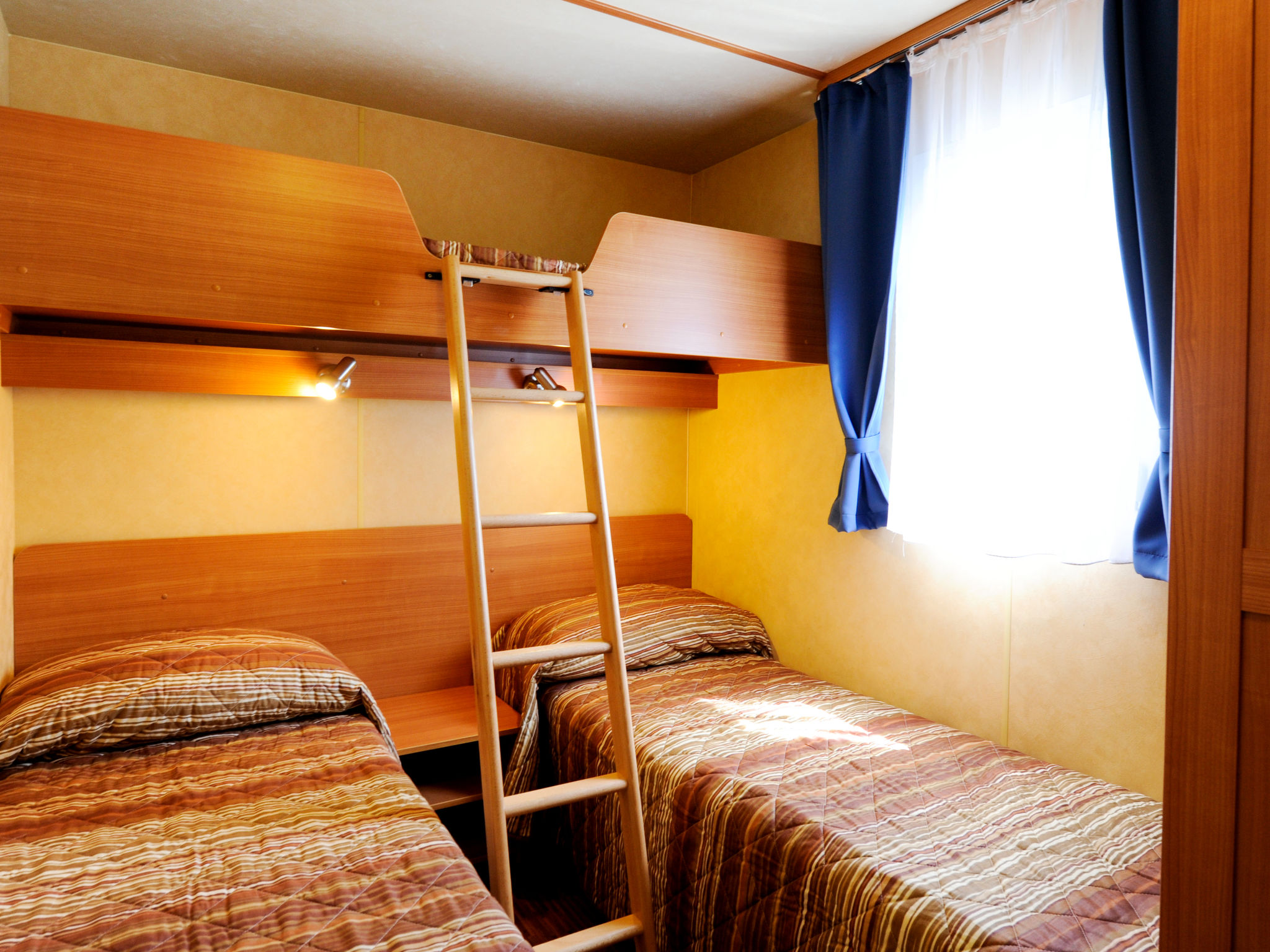 "Exotic", 4-Zimmer-Mobilheim 35 m2. Objekt geeignet für 6 Erwachsene + 1 Kind. Eingang mit Veranda mit Esstisch. 1 Doppelzimmer. 1 Zimmer mit 2 Betten. 1 Zimmer mit 2 Betten und 1 x 1 Etagenbetten (65 cm, Länge 180 cm). Küche (3 Kochplatten, Geschirrspüler, Wasserkocher, Mikrowelle, elektrische Kaffeemaschine). Dusche/WC, sep. WC. Klimaanlage, Warmluftheizung. Terrasse überdacht. Liegestühle (2). Zur Verfügung: Safe, Fliegengitter, Kinderhochstuhl, Babybett (extra). Parkplatz (1 Auto). Bitte beachten: Nichtraucher-Haus. Strandentfernung ca. 80-260 m. IT031009B28ZDV3E5N