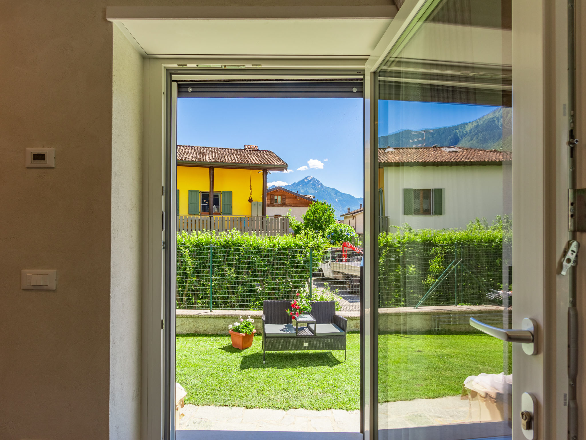 2-Zimmer-Wohnung 60 m2, im Erdgeschoss. Komfortabel eingerichtet: offenes Wohn-/Esszimmer mit Esstisch und TV. Ausgang zum Garten. 1 Zimmer mit 1 Bett und 1 Doppelbett. Offene Küche (Geschirrspüler, 4 Flammen, Toaster, Wasserkocher, Mikrowelle, elektrische Kaffeemaschine). Dusche/Bidet/WC. G-Heizung, Klimaanlage. Gartensitzplatz. Terrassenmöbel, Liegestühle (2). Schöne Sicht auf die Berge. Zur Verfügung: Haartrockner. Internet (WLAN, gratis). Parkplatz (1 Auto). Bitte beachten: Nichtraucher-Unterkunft. IT014046C2YLNPXQQ4
