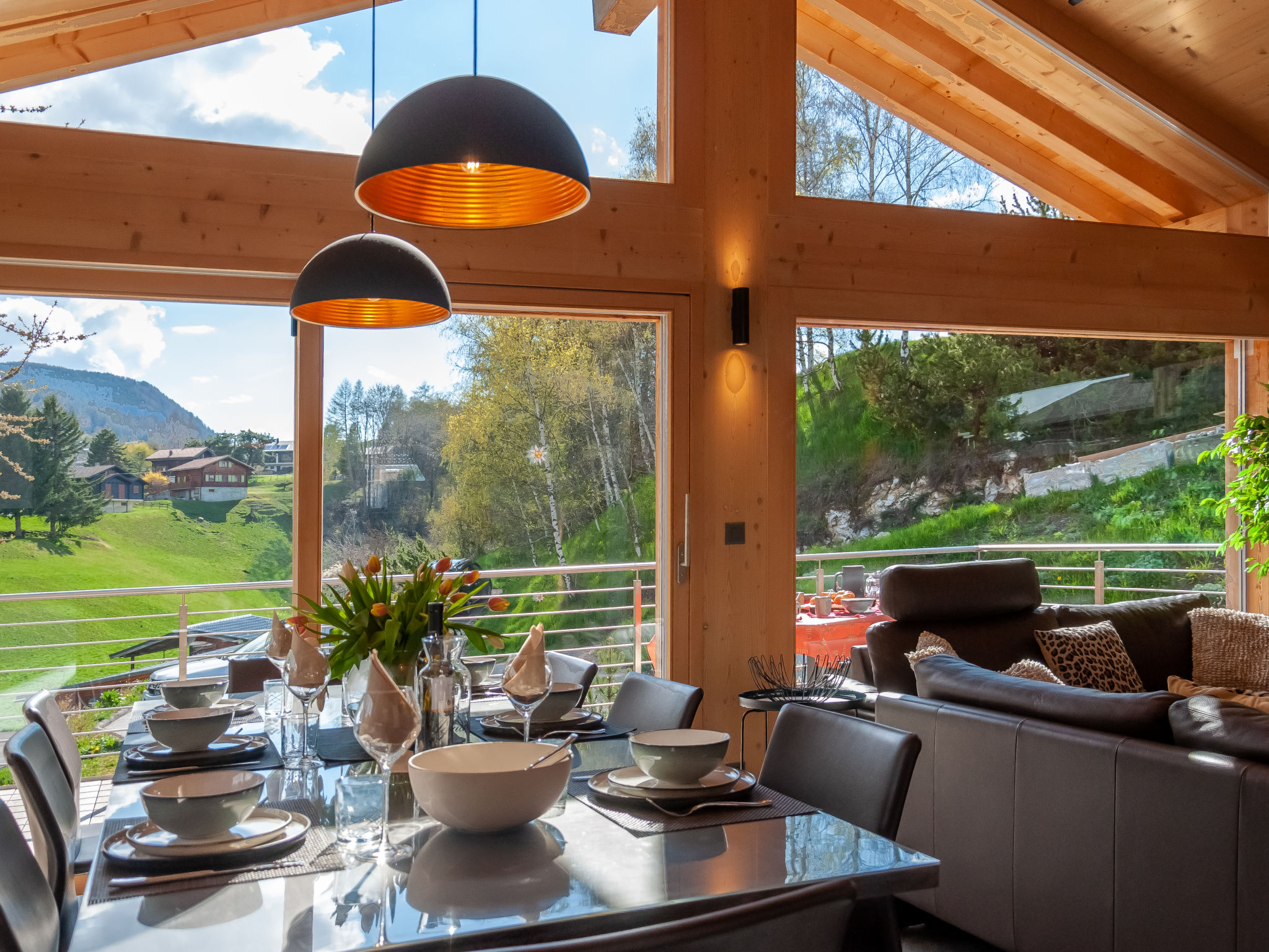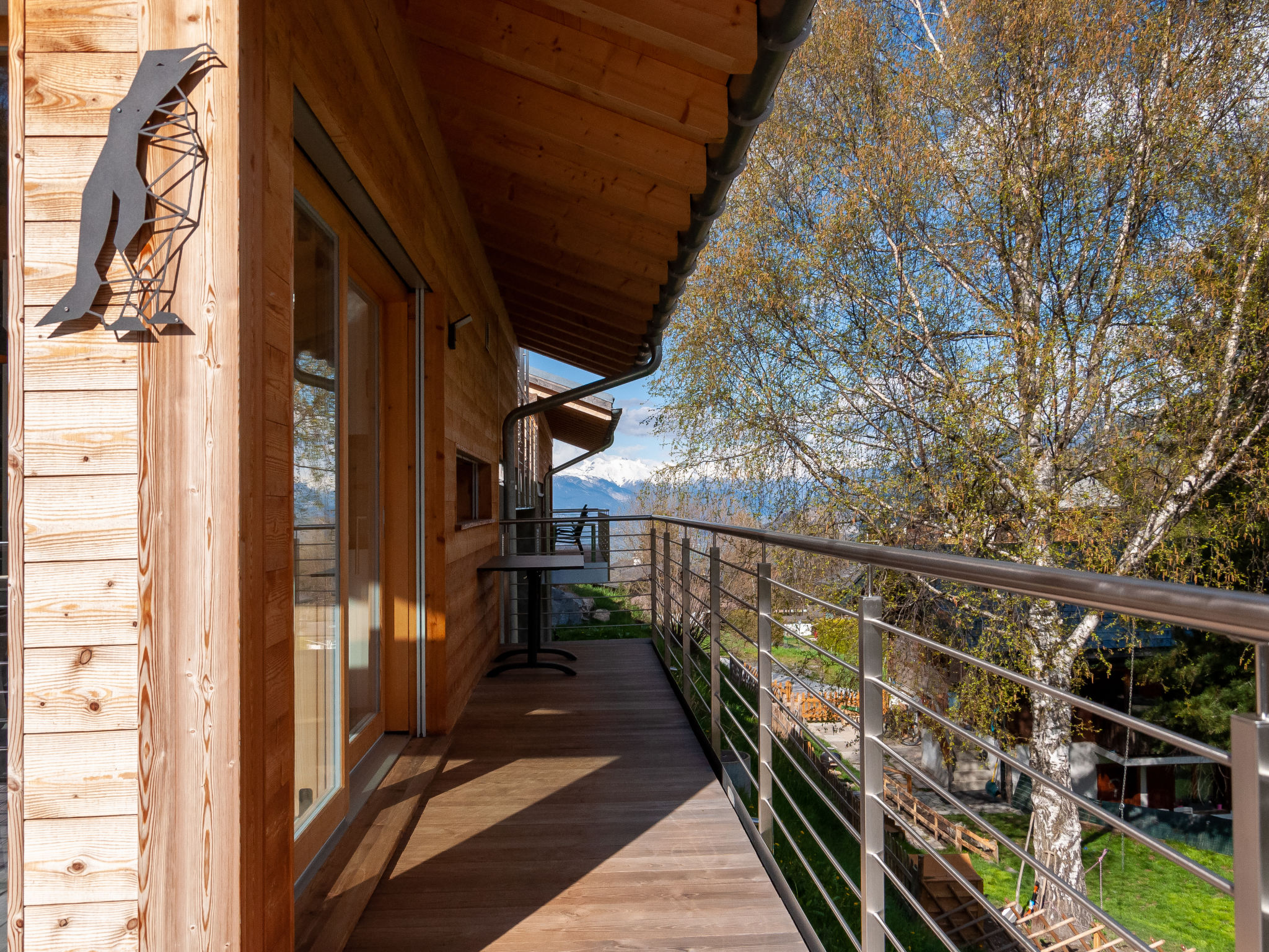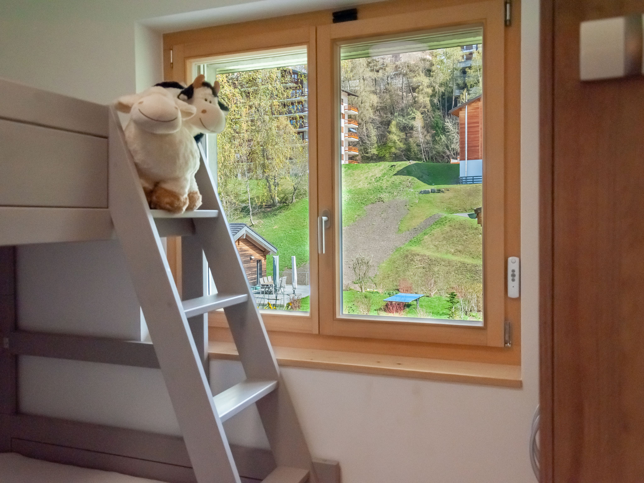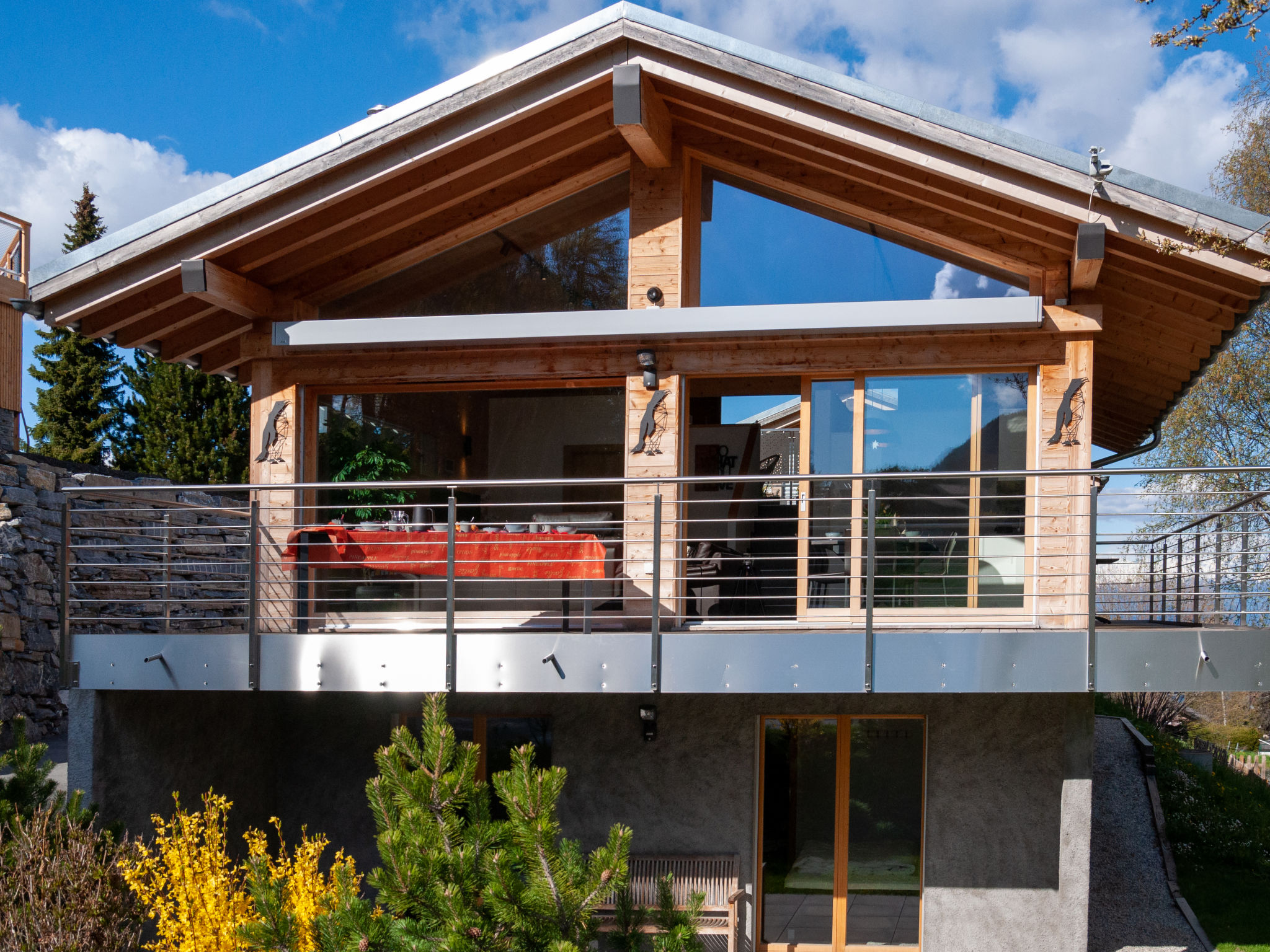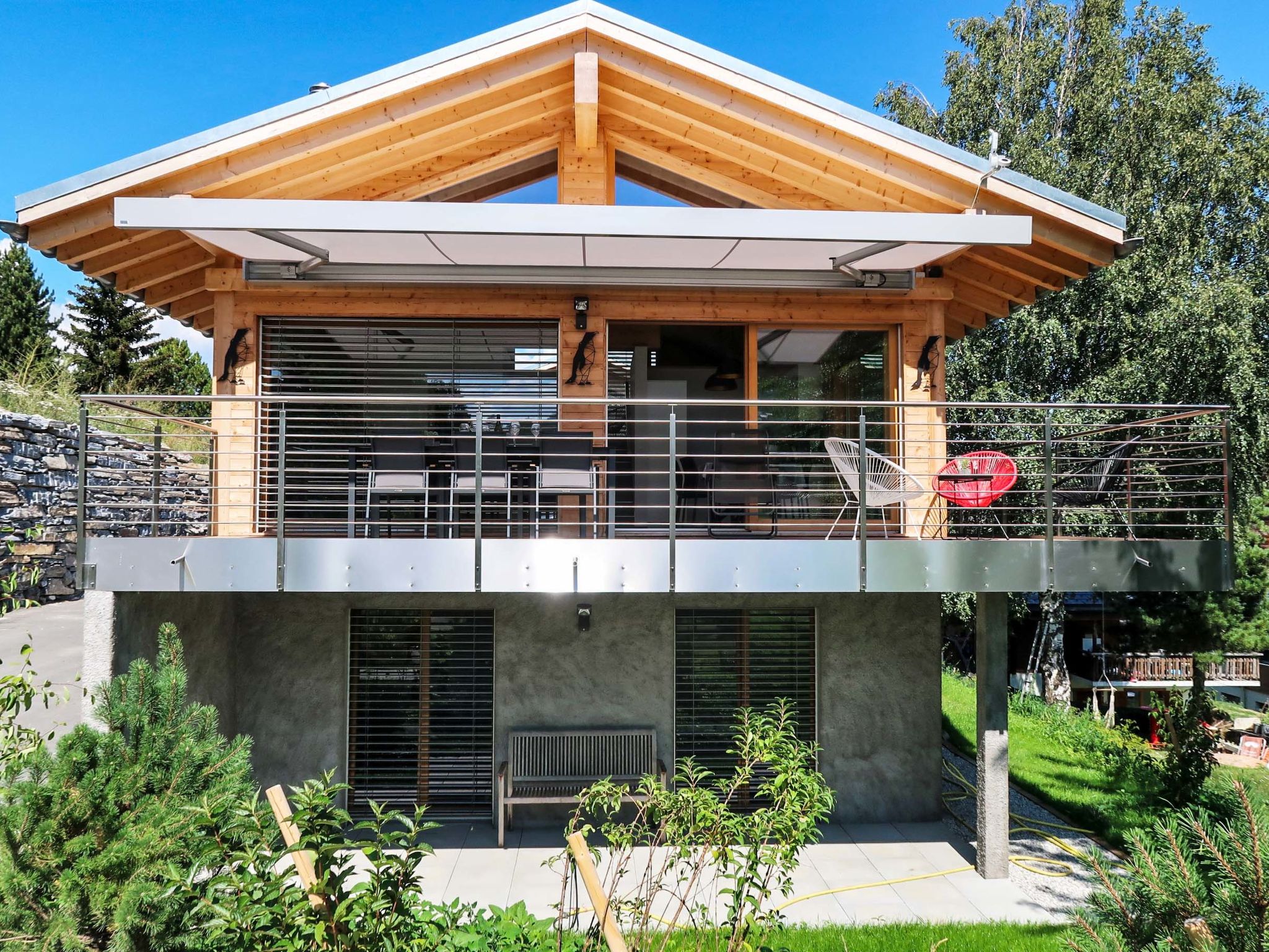 "Les penguins", 4-Zimmer-Chalet 116 m2 auf 3 Stockwerken. Hell, komfortabel und modern eingerichtet: grosses Wohn-/Esszimmer mit Kabel-TV. Ausgang zur Terrasse, Richtung Westen. Offene Küche (Backofen, Geschirrspüler, 4 Glaskeramikherd Platten, Mikrowelle, Tiefkühler, elektrische Kaffeemaschine, Kapseln für die Kaffeemaschine (nespresso) extra, Racletteofen, Fondue Set (Chinoise, Käse)). Dusche. Unteres Geschoss: Eingang. 2 Zimmer, jedes Zimmer mit 1 franz. Bett (160 cm, Länge 200 cm). Ausgang zur Terrasse. 1 Zimmer mit 1 franz. Bett (140 cm, Länge 200 cm). Bad/WC, sep. WC. Dachgeschoss: offene Galerie mit 1 Diwanbett (140 cm, Länge 200 cm). Ausgang zur Terrasse, Richtung Osten. Terrasse, Ostlage, 2 Terrassen, Westlage, Garten. Terrassenmöbel, Elektrogrill. Zur Verfügung: Waschmaschine, Kinderhochstuhl, Babybett, Haartrockner. Internet (Wireless LAN, gratis). Parkplatz (3 Autos), Garage. Bitte beachten: Nichtraucher-Unterkunft.