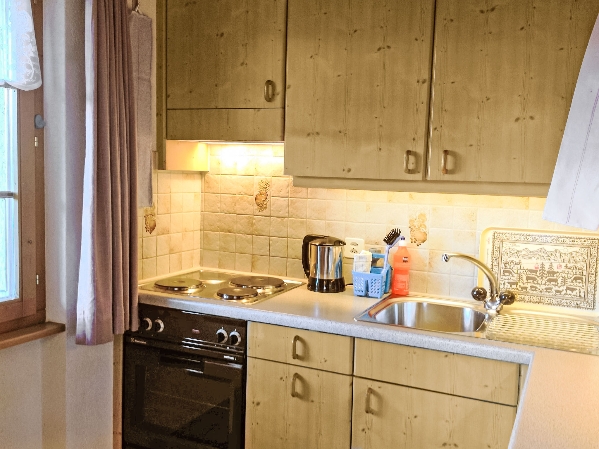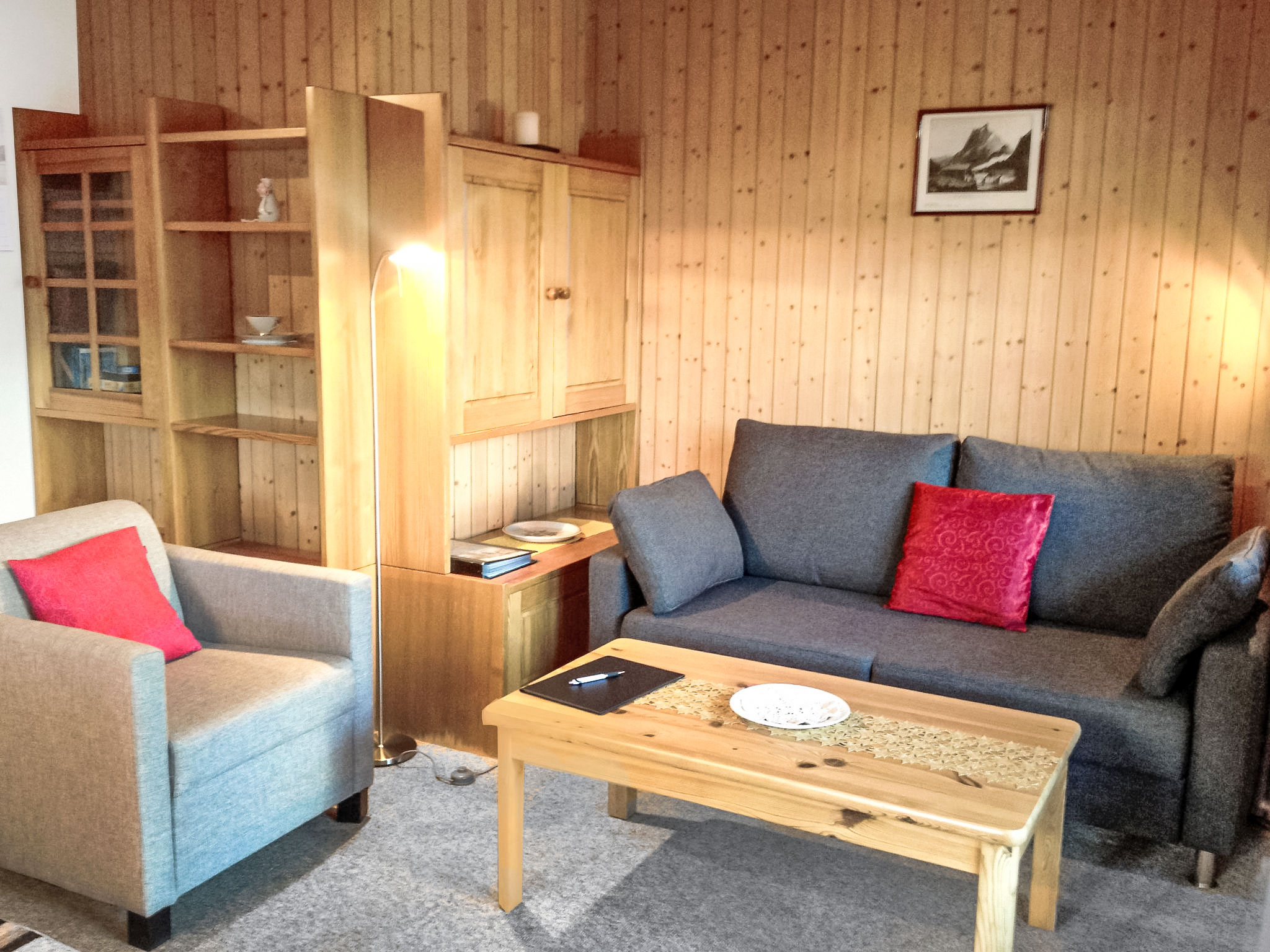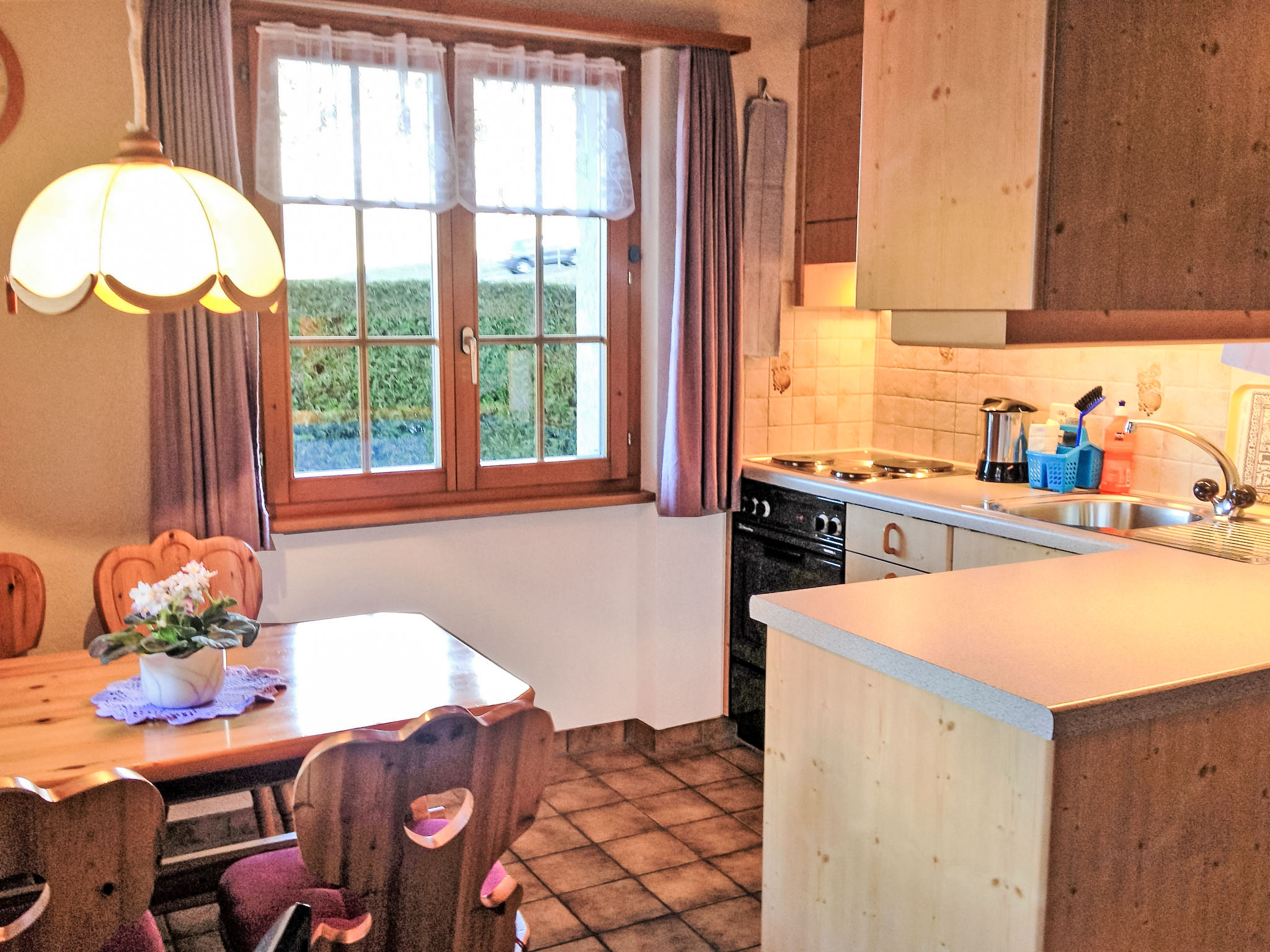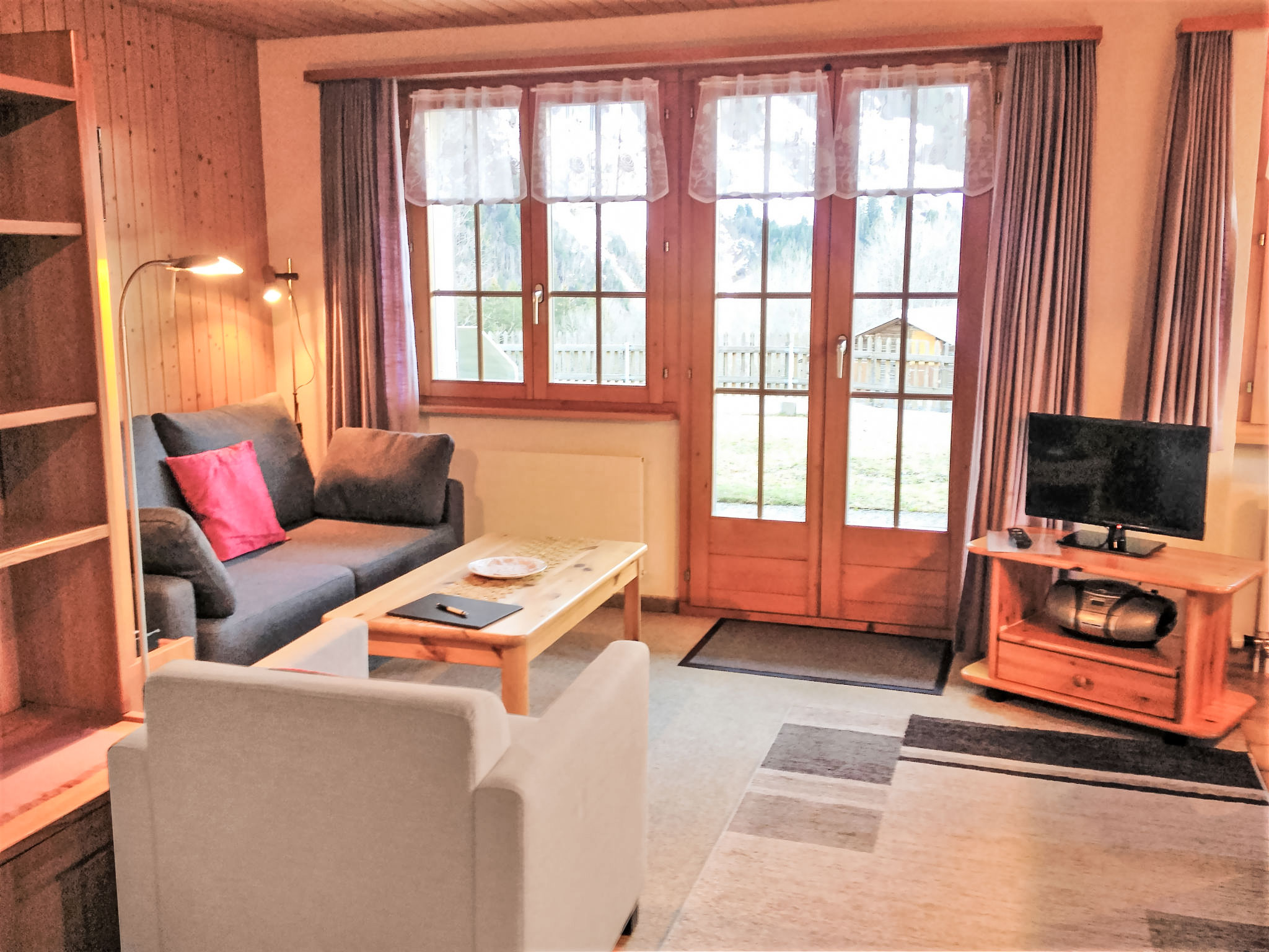 2-Zimmer-Wohnung 44 m2, im Erdgeschoss, Südwestlage. Gemütlich eingerichtet: Wohn-/Esszimmer mit Kabel-TV und Flachbildschirm. Ausgang zum Gartensitzplatz, Richtung Süden und Richtung Westen. 1 Zimmer mit 1 Doppelbett (2 x 90 cm, Länge 200 cm). Offene Küche (3 Kochplatten, Backofen, Mikrowelle, elektrische Kaffeemaschine, Racletteofen, Fondue Set (Käse)). Dusche/WC. Terrassenmöbel. Herrliche Sicht auf die Berge. Zur Verfügung: Internet (Wireless LAN, gratis). Parkplatz beim Haus. Bitte beachten: Nichtraucher-Unterkunft.