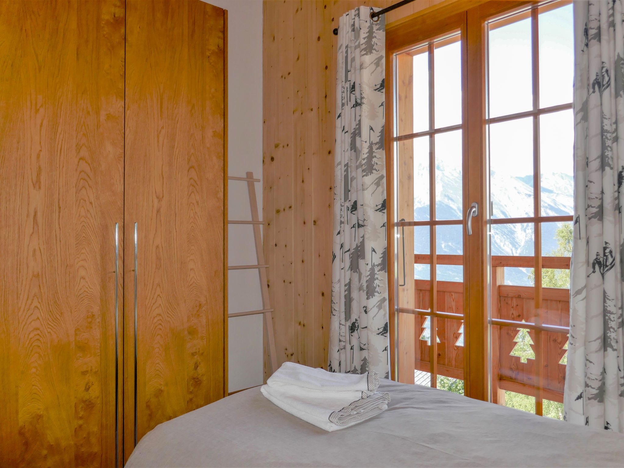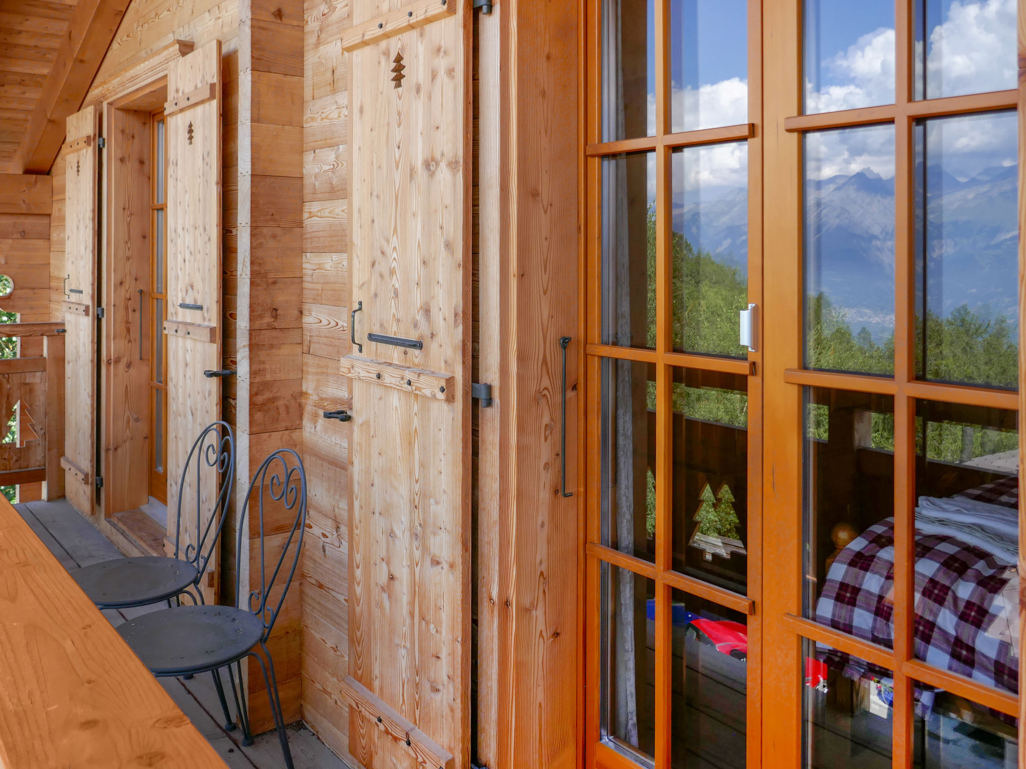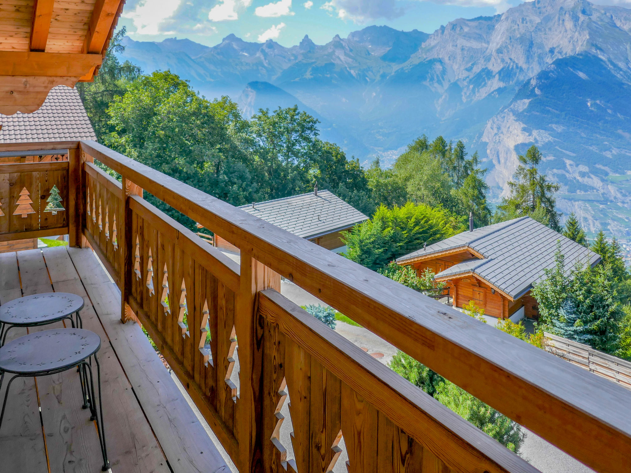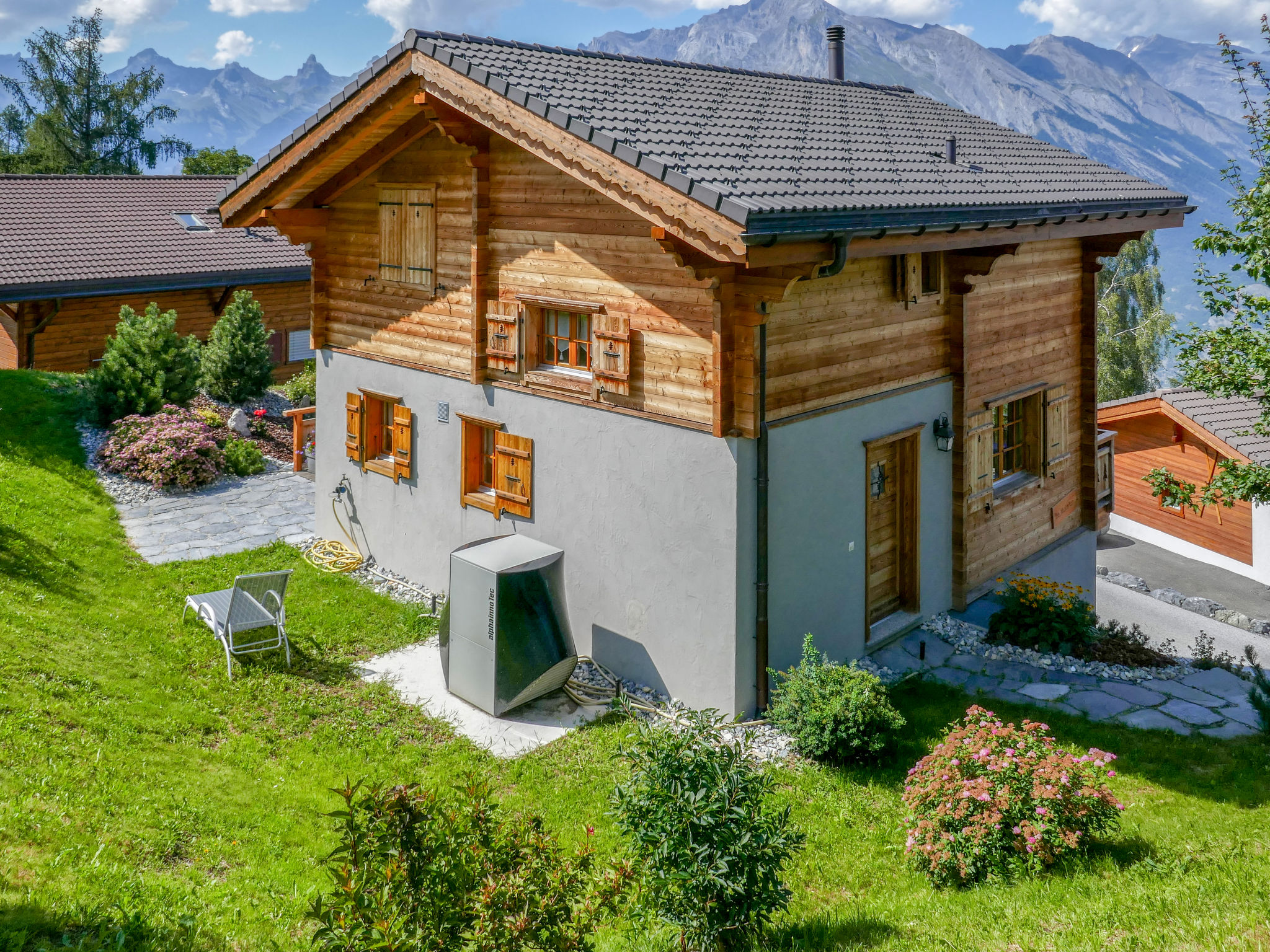 "Le Muveran V8", 5-Zimmer-Chalet 184 m2 auf 3 Stockwerken. Geräumig und hell, schön und geschmackvoll eingerichtet: Eingang. Wohn-/Esszimmer mit offenem Kamin, Kabel-TV und Radio. Ausgang zum Balkon, zur Terrasse, Richtung Norden und Richtung Westen. Offene Küche (Backofen, Geschirrspüler, 4 Glaskeramikherd Platten, Mikrowelle, elektrische Kaffeemaschine, Kapseln für die Kaffeemaschine (nespresso) extra, Racletteofen, Fondue Set (Chinoise, Käse)). Sep. WC. Unteres Geschoss: Eingang. 1 Zimmer mit 1 franz. Bett (160 cm, Länge 200 cm). 1 Zimmer mit 2 Betten (90 cm, Länge 200 cm). Dusche/WC. Obergeschoss: 1 Zimmer mit 1 franz. Bett (160 cm, Länge 200 cm). Ausgang zum Balkon, Richtung Norden. 1 Zimmer mit 2 Betten (90 cm, Länge 200 cm). Ausgang zum Balkon, Richtung Norden. Bad/Dusche/WC. Balkon, Nordlage Terrasse 27 m2, Westlage, Garten, Südlage. Terrassenmöbel, Gartengrill, Liegestühle (4). Sehr schöne Sicht auf die Berge. Zur Verfügung: Waschmaschine, Wäschetrockner, Kinderhochstuhl, Babybett, Haartrockner. Internet (Wireless LAN, gratis). Parkplatz (3 Autos). Bitte beachten: Nichtraucher-Unterkunft. 1 Haustier/Hund erlaubt.