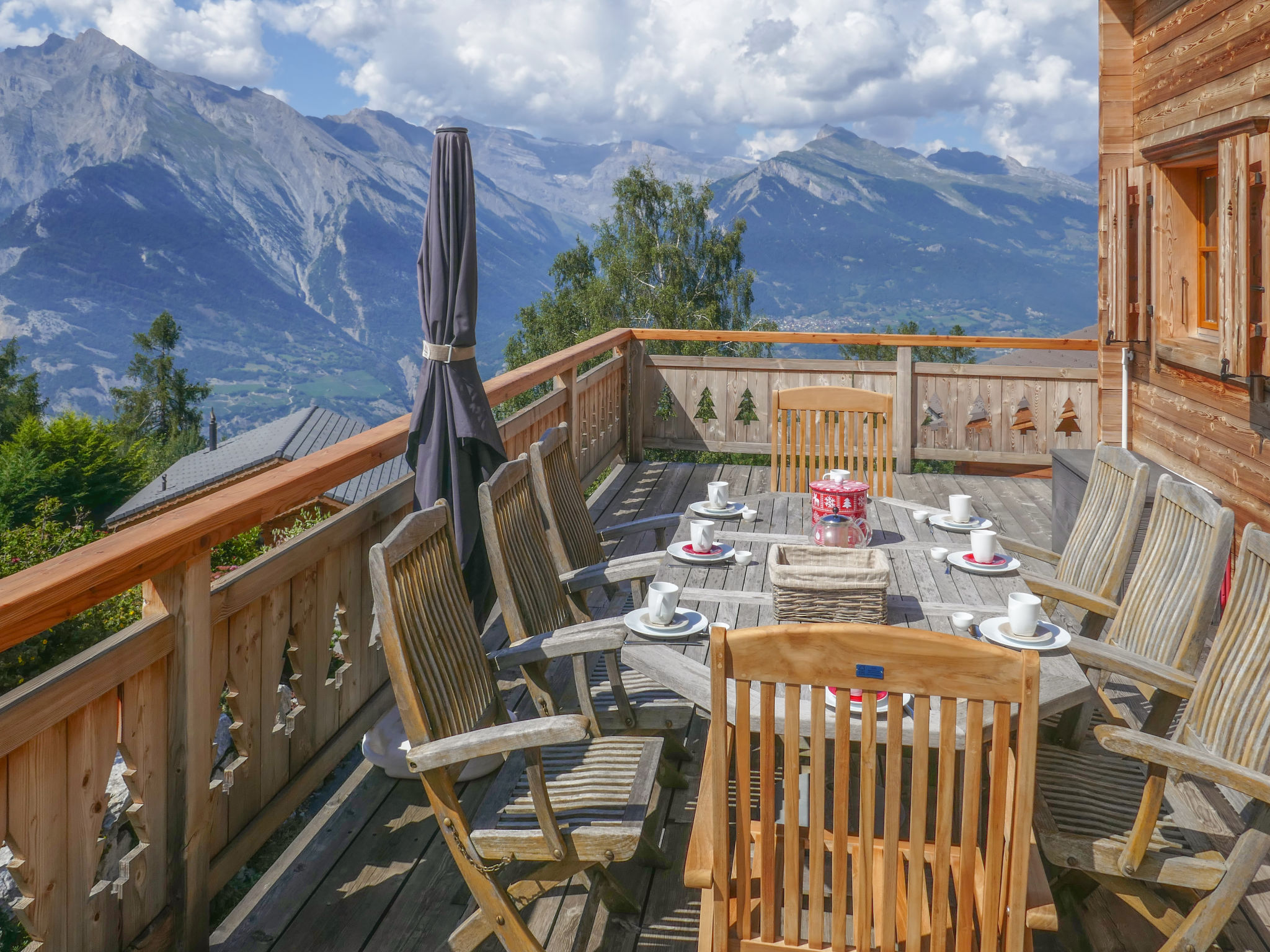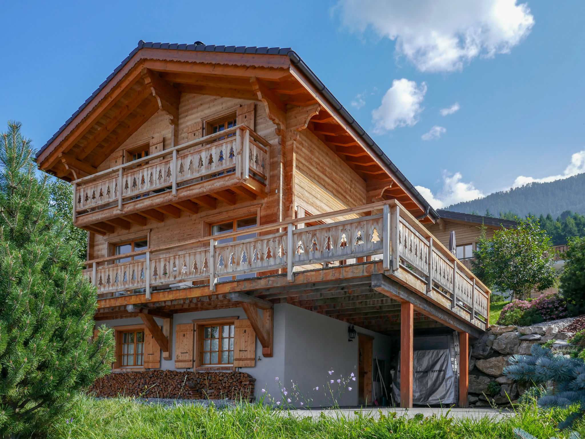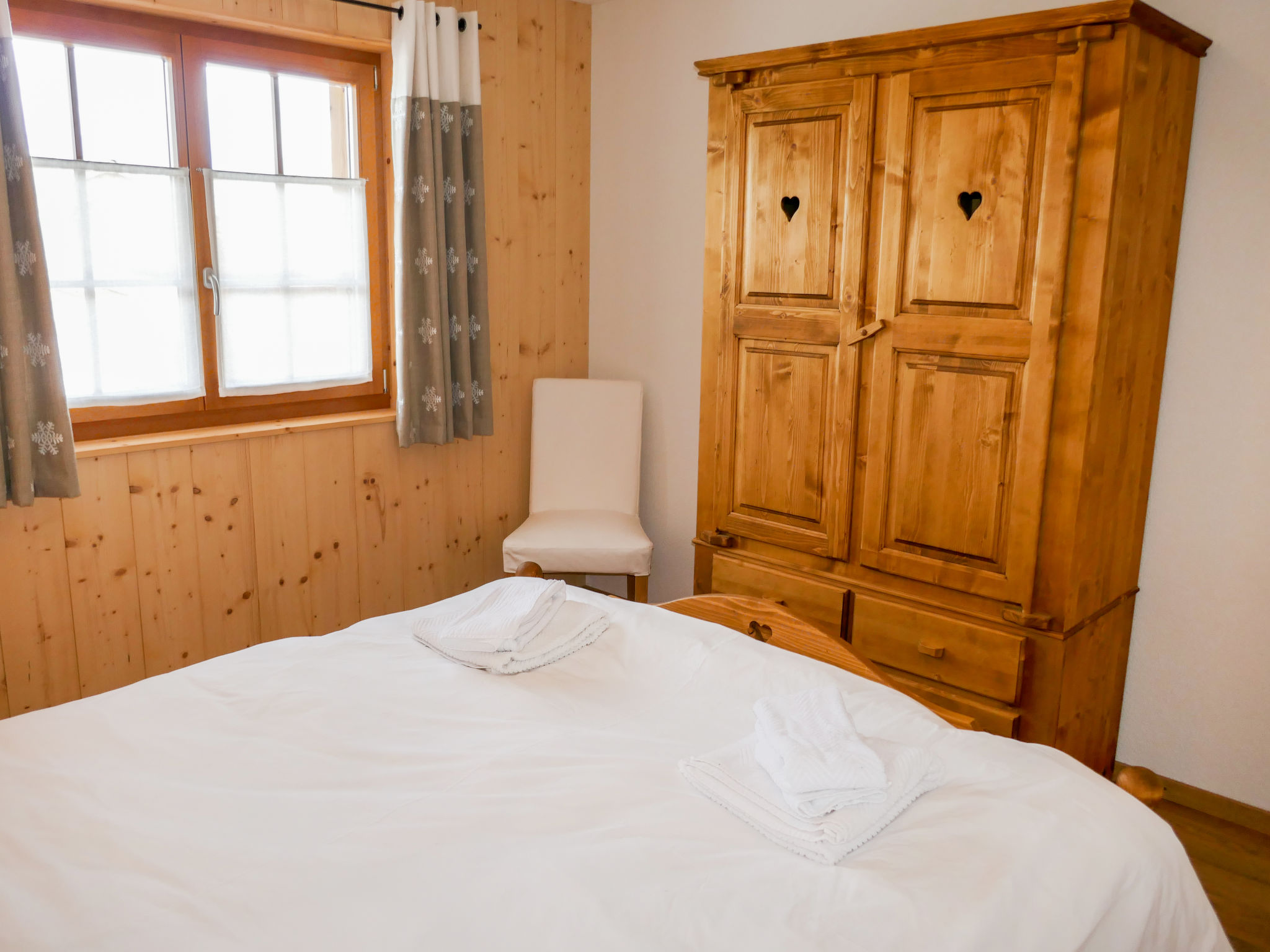 "Le Muveran V8", 5-Zimmer-Chalet 184 m2 auf 3 Stockwerken. Geräumig und hell, schön und geschmackvoll eingerichtet: Eingang. Wohn-/Esszimmer mit offenem Kamin, Kabel-TV und Radio. Ausgang zum Balkon, zur Terrasse, Richtung Norden und Richtung Westen. Offene Küche (Backofen, Geschirrspüler, 4 Glaskeramikherd Platten, Mikrowelle, elektrische Kaffeemaschine, Kapseln für die Kaffeemaschine (nespresso) extra, Racletteofen, Fondue Set (Chinoise, Käse)). Sep. WC. Unteres Geschoss: Eingang. 1 Zimmer mit 1 franz. Bett (160 cm, Länge 200 cm). 1 Zimmer mit 2 Betten (90 cm, Länge 200 cm). Dusche/WC. Obergeschoss: 1 Zimmer mit 1 franz. Bett (160 cm, Länge 200 cm). Ausgang zum Balkon, Richtung Norden. 1 Zimmer mit 2 Betten (90 cm, Länge 200 cm). Ausgang zum Balkon, Richtung Norden. Bad/Dusche/WC. Balkon, Nordlage Terrasse 27 m2, Westlage, Garten, Südlage. Terrassenmöbel, Gartengrill, Liegestühle (4). Sehr schöne Sicht auf die Berge. Zur Verfügung: Waschmaschine, Wäschetrockner, Kinderhochstuhl, Babybett, Haartrockner. Internet (Wireless LAN, gratis). Parkplatz (3 Autos). Bitte beachten: Nichtraucher-Unterkunft. 1 Haustier/Hund erlaubt.