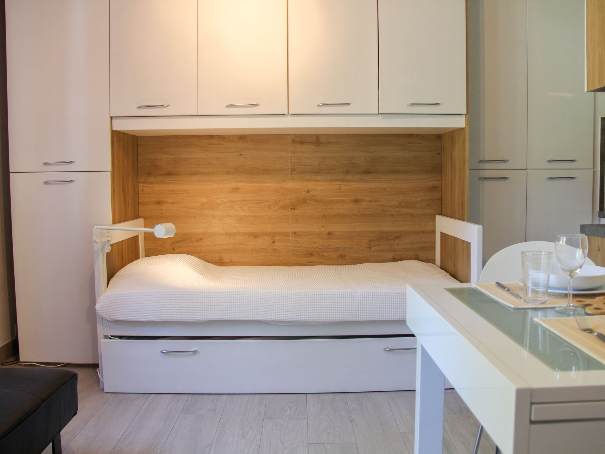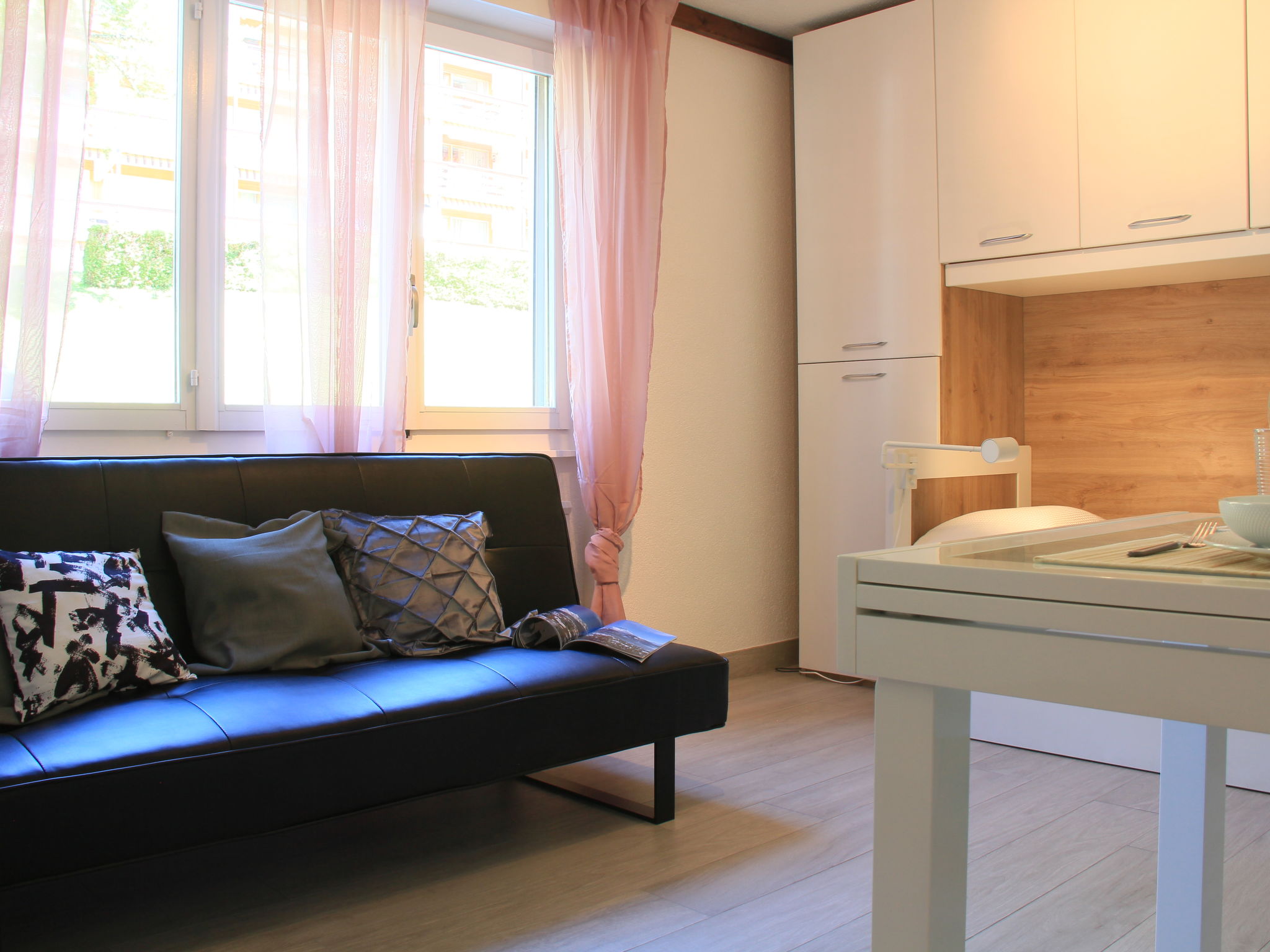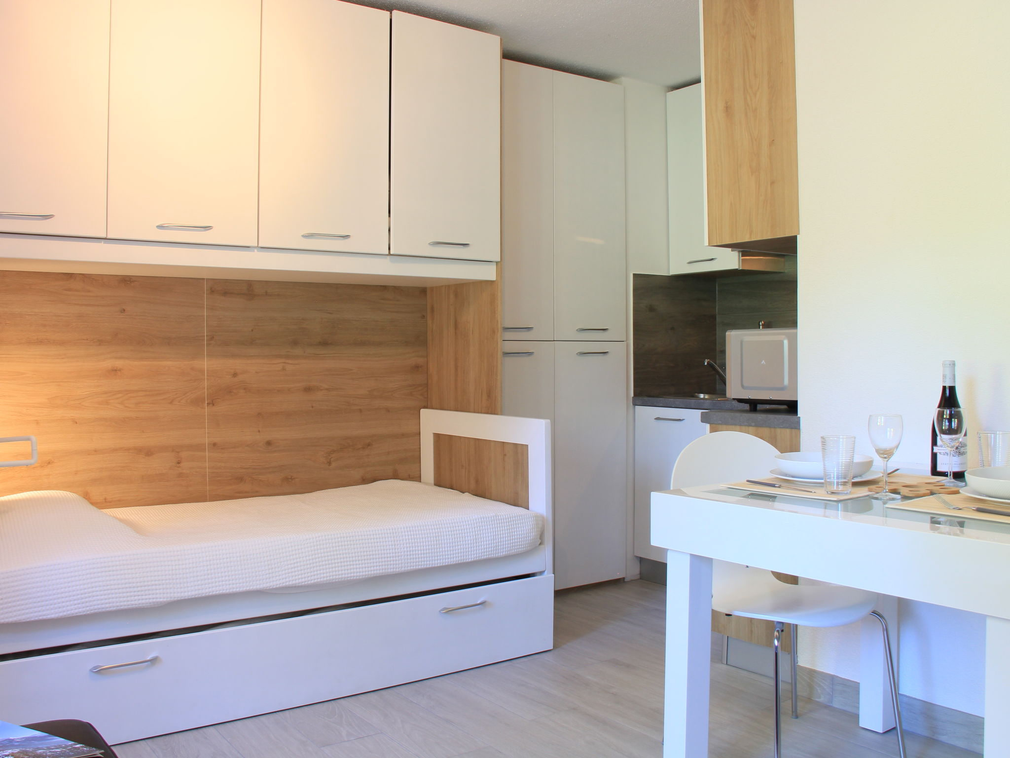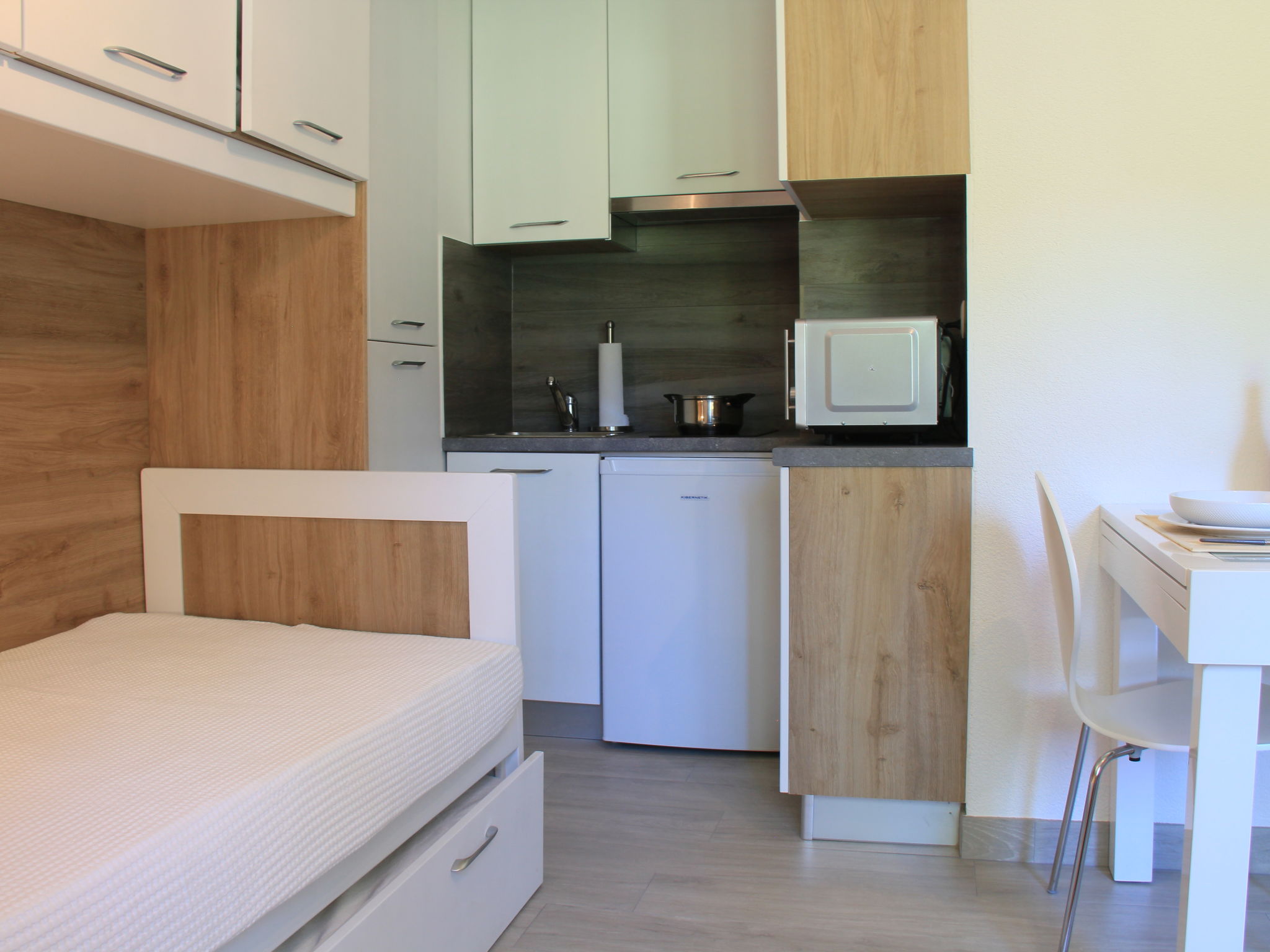 "Grenat 8", 1-Zimmer-Wohnung 23 m2, im Erdgeschoss, Nordlage. Einfach und zweckmässig eingerichtet: Wohn-/Schlafzimmer mit 2 Ausziehbetten (2 x 90 cm). Kleine, offene Küche (2 Glaskeramikherd Platten, Mikrowelle, elektrische Kaffeemaschine). Dusche/WC. Zur Verfügung: Internet (Wireless LAN, gratis). Parkplatz. Bitte beachten: Wohnung auf Parkplatzseite. Nichtraucher-Unterkunft. 1 Haustier/Hund erlaubt.