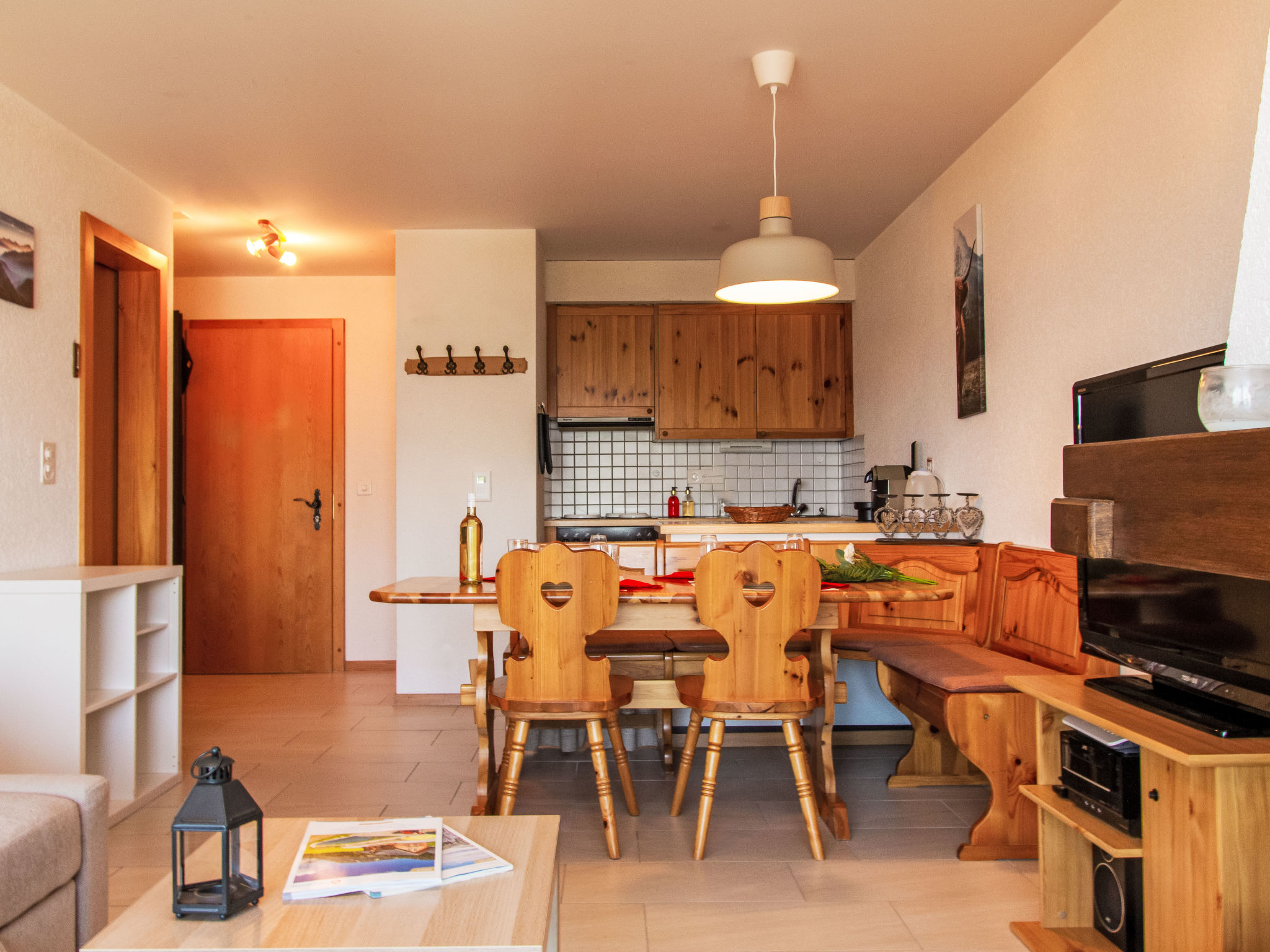 "Hauts de Nendaz A F3", 2-Zimmer-Wohnung 50 m2 im 3. Stock, Nordwestlage. Objekt geeignet für 2 Erwachsene + 2 Kinder. Hell, renoviert, komfortabel und schön eingerichtet: Eingang mit 1 x 2 Etagenbetten (90 cm, Länge 200 cm). Wohn-/Esszimmer mit offenem Kamin, Kabel-TV und DVD. Ausgang zum Balkon, Richtung Nordwesten. 1 Zimmer mit 1 Doppelbett. Ausgang zum Balkon. Offene Küche (4 Kochplatten, Backofen, Geschirrspüler, Toaster, Wasserkocher, elektrische Kaffeemaschine, Kapseln für die Kaffeemaschine (nespresso) extra). Bad/WC. Balkon, Nordwestlage. Balkonmöbel. Sehr schöne Sicht auf die Berge und die Skipiste. Zur Verfügung: Haartrockner. Internet (Wireless LAN, gratis). Parkplatz Nr. F3. Bitte beachten: Nichtraucher-Unterkunft.