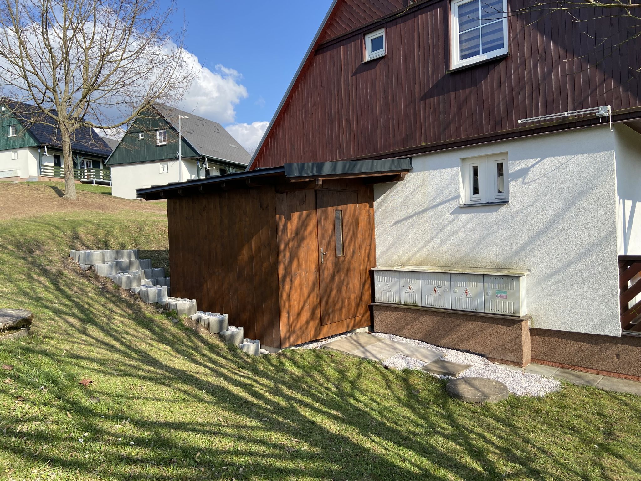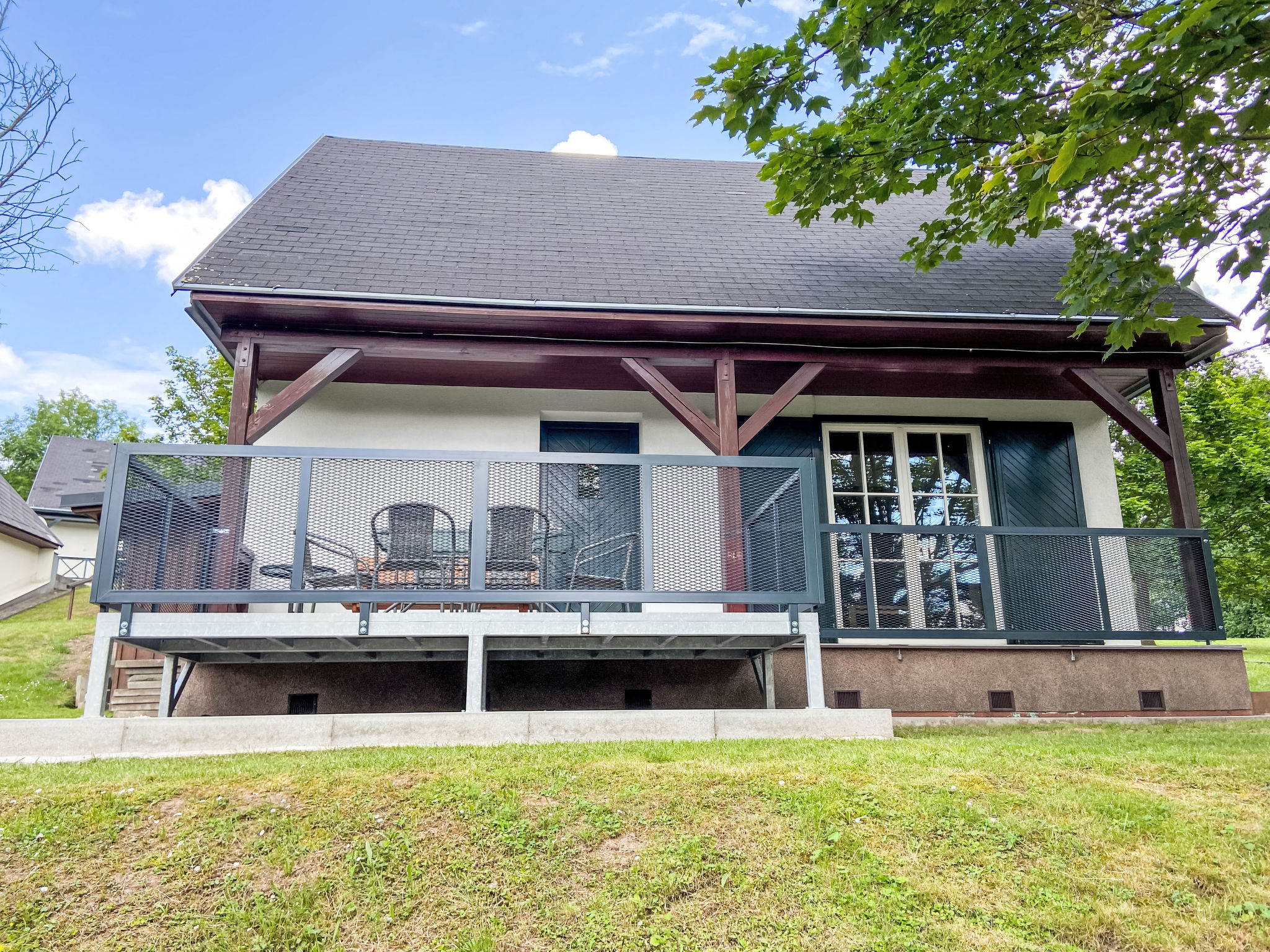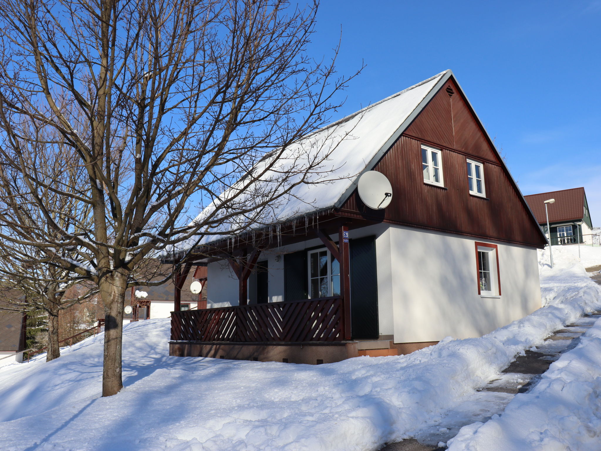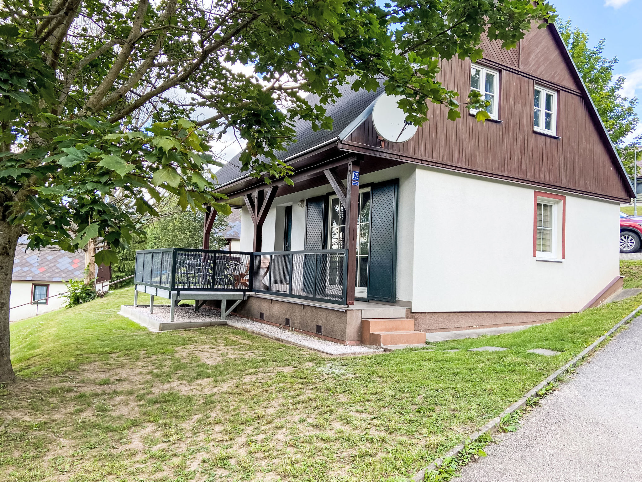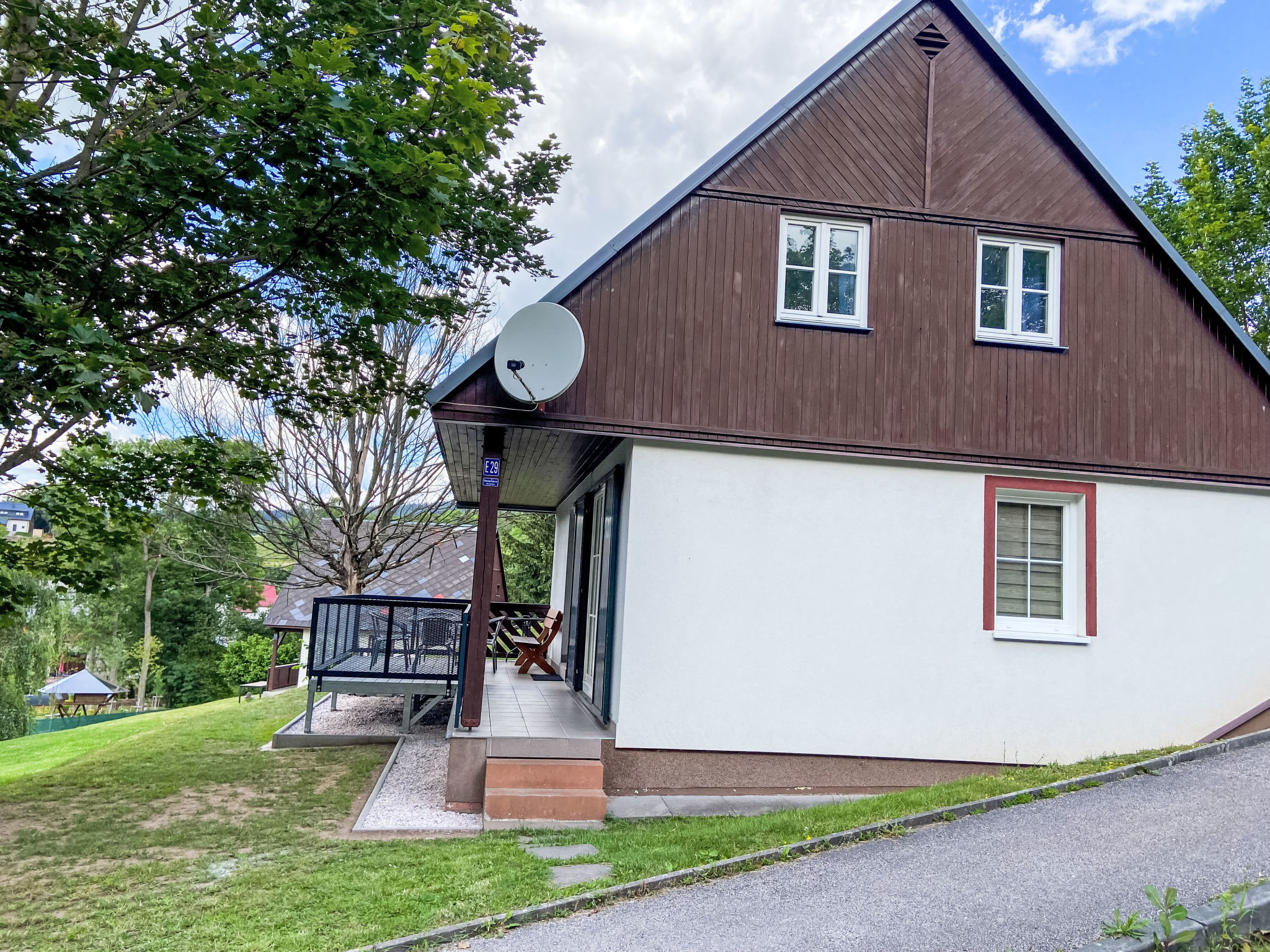 Čistá v Krkonoších 2 km von Černý Důl: Kinderfreundliches, schönes, komfortables Feriendorf "Holiday Hill", 500 m.ü.M., umgeben von Bäumen und Wiesen. 43 Häuser im Ferienresort. Am Ortsrand, alleinstehende, ruhige, sonnige Lage, 1.5 km vom See, 3 km vom Skigebiet, im Grünen. Zur Mitbenutzung: Grundstück 6 ha, Wiese, Schwimmbad beheizt (9 x 4 m, 120 cm tief, saisonale Verfügbarkeit: 01.Jun.-26.Sep. Öffnungszeiten Schwimmbad: 09:00-20:00). Dusche/WC im Poolbereich, Tischtennis, Kinderspielplatz (Schaukel). In der Anlage: Empfang. Parkplatz (für 2 Autos) beim Haus. Einkaufsgeschäft 2.5 km, Lebensmittelgeschäft 2.5 km, Supermarkt 7.5 km, Restaurant 1.6 km, Biergarten 400 m, Bushaltestelle "Černý Důl, Čistá-pošta" 400 m, Sandstrand 1.5 km (klein), Hallenbad 19 km. Golfplatz (18 Loch) 14 km, Tennis 2.5 km, Sportzentrum 2.5 km, Wanderwege ab Haus, Radweg 100 m, Skilift 3 km, Sessellift 3 km, Skipisten 3 km, Skibushaltestelle 100 m, Skischule 3 km, Kinderskischule 3 km, Schlittelbahn 7 km, Langlaufloipe 100 m. Nahe gelegene Sehenswürdigkeiten: Janské Lázně Spa 9 km, Vrchlabí 10 km, Aquapark Trutnov 25 km, Zoo Safari Dvůr Králové 29 km, Bozkovské jeskyně 37 km, Adršpašské skály 44 km. Bekannte Skigebiete sind gut erreichbar: Černý Důl 3 km, Herlíkovice 15 km, Pec pod Sněžkou 22 km. Bekannte Seen in der Umgebung sind gut erreichbar: Čistá 1.5 km, Vrchlabí 9 km. Wandergebiete: Sněžka 25 km.