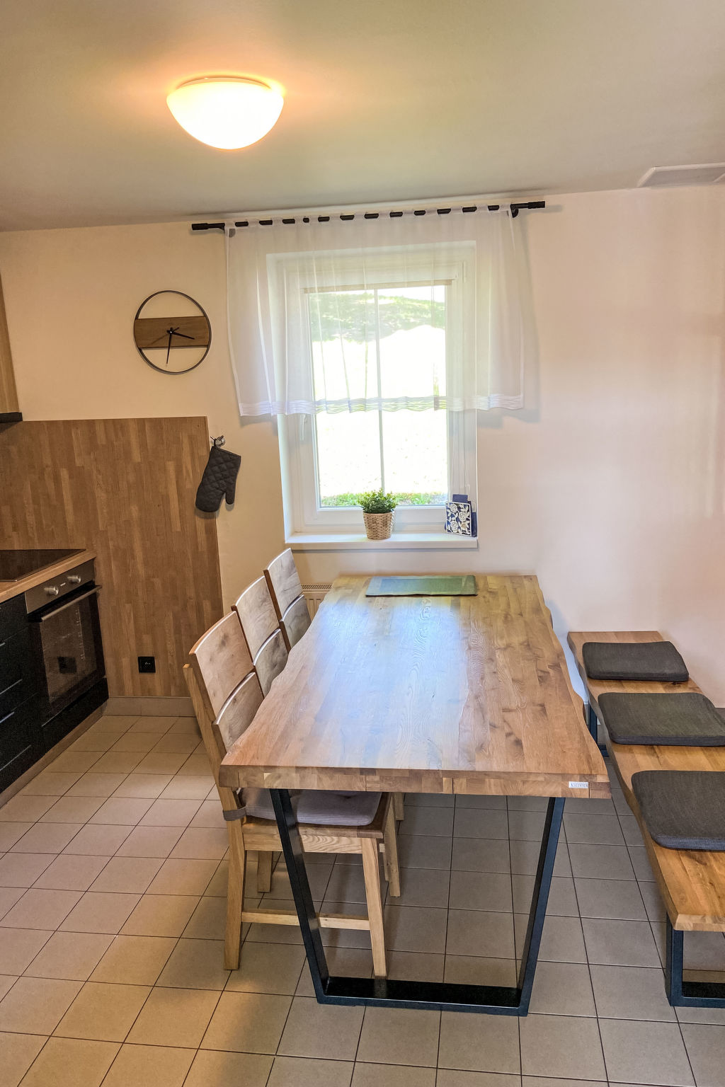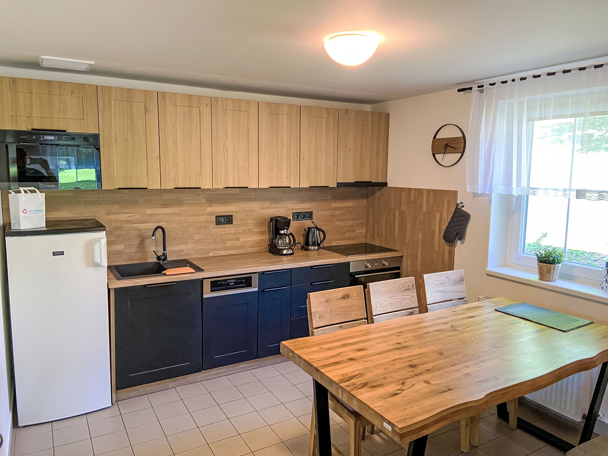 4-Zimmer-Haus 100 m2 auf 2 Stockwerken. Hell, komfortabel und gemütlich eingerichtet: offenes Wohnzimmer mit Sat-TV. Ausgang zur Terrasse. Küche (4 Kochplatten, Wasserkocher, Mikrowelle, Tiefkühler) mit Esstisch. Sep. WC. Obergeschoss: 3 Zimmer, jedes Zimmer mit 2 Betten. Bad/WC. Kleine Terrasse. Terrassenmöbel. Zur Verfügung: Waschmaschine, Kinderhochstuhl, Babybett. Internet (Wireless LAN, gratis). Bitte beachten: geeignet für Familien. Nichtraucher-Haus.