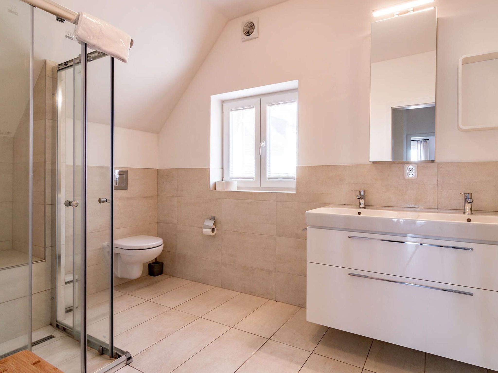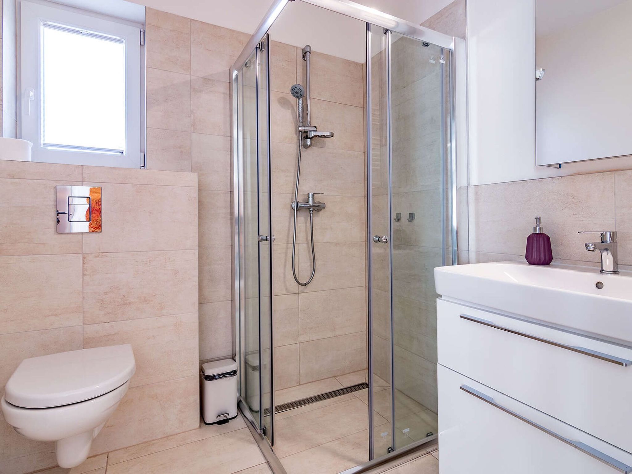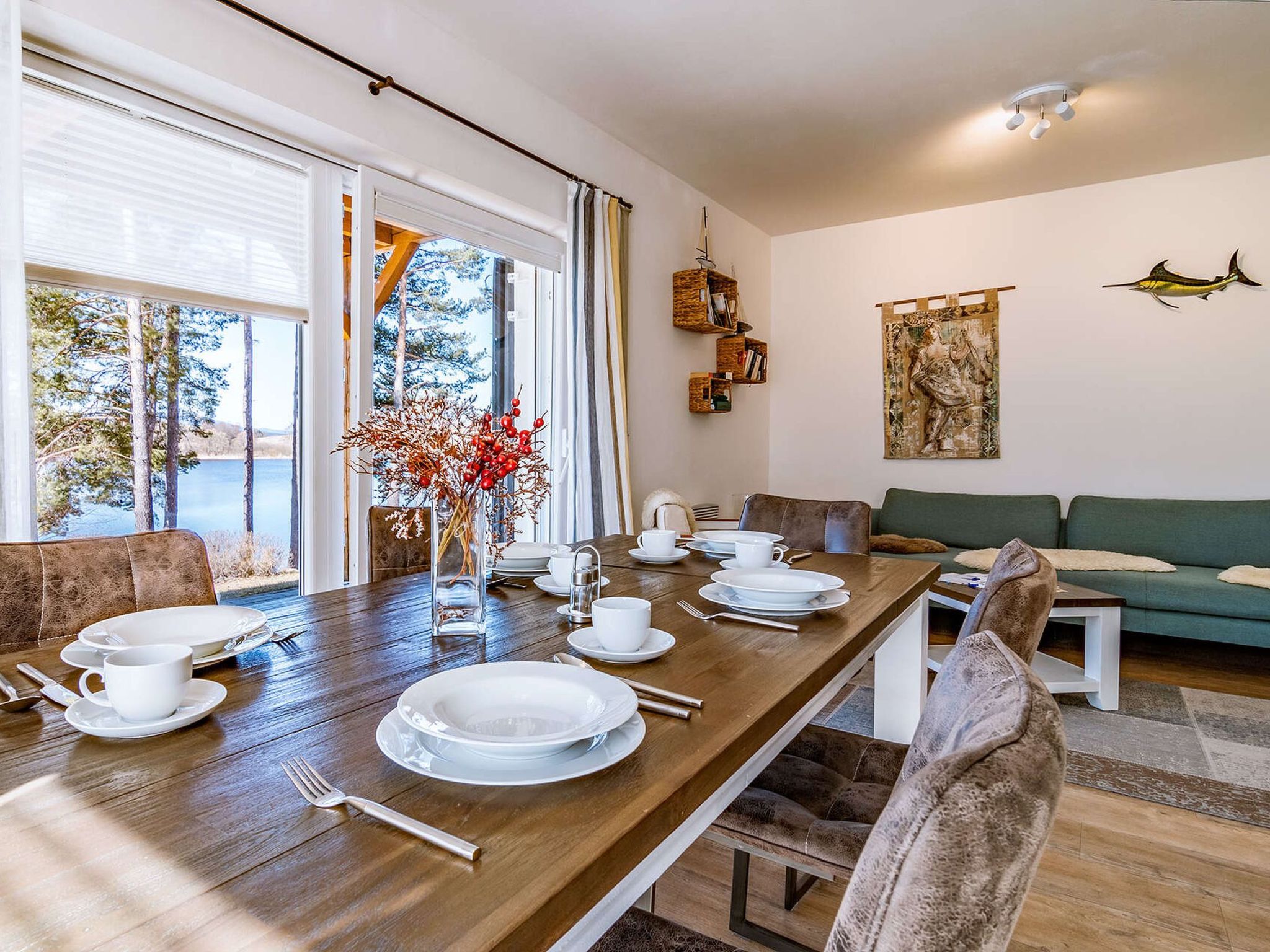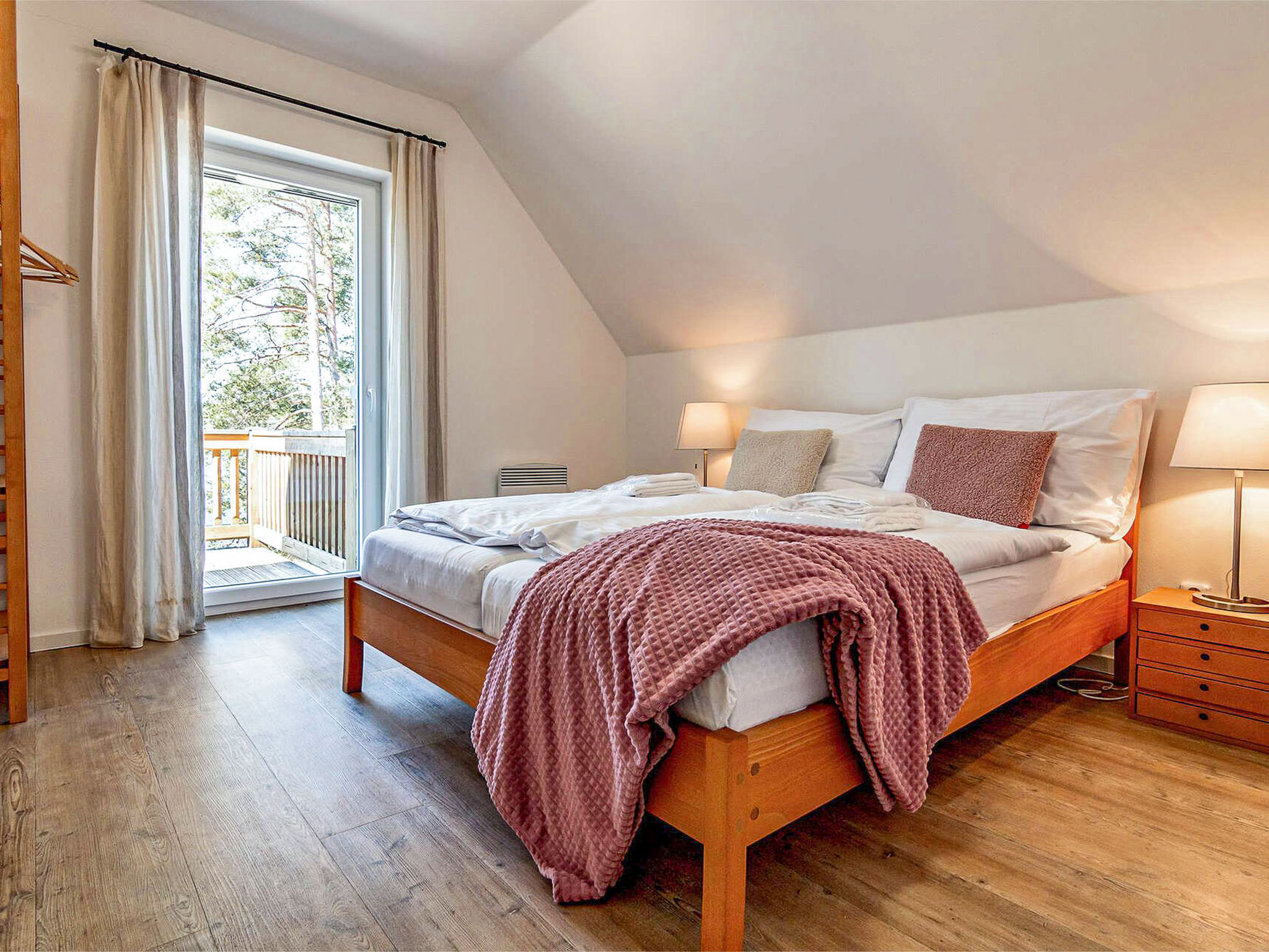 4-Zimmer-Haus 72 m2 auf 2 Stockwerken. Komfortabel und gemütlich eingerichtet: Wohnzimmer. Kochnische (4 Kochplatten, Backofen, Geschirrspüler, Wasserkocher, Mikrowelle, elektrische Kaffeemaschine) mit Esstisch, Sat-TV. Dusche/WC. Bodenheizung. Obergeschoss: 2 Zimmer, jedes Zimmer mit 1 Doppelbett. 1 Zimmer mit 2 Betten. Terrasse. Terrassenmöbel. Eingeschränkte Sicht auf den See. Zur Verfügung: Internet (Wireless LAN, gratis). 1 Haustier/Hund erlaubt. Hund (gegen Aufpreis) auf Anfrage.
