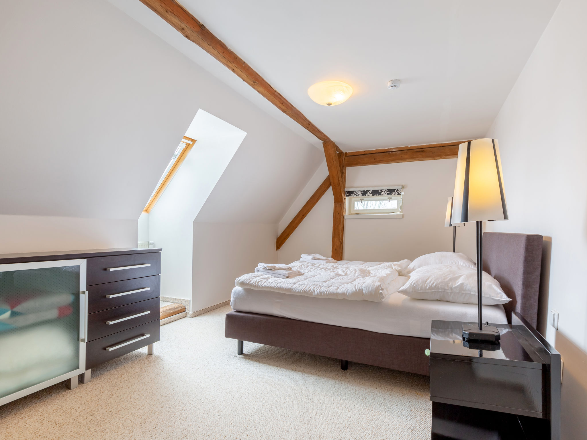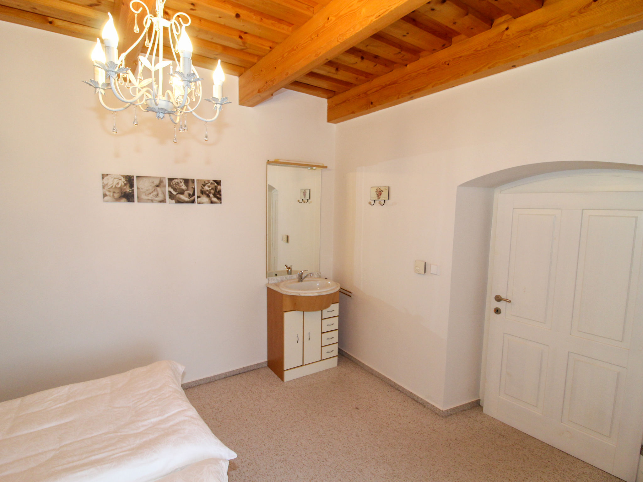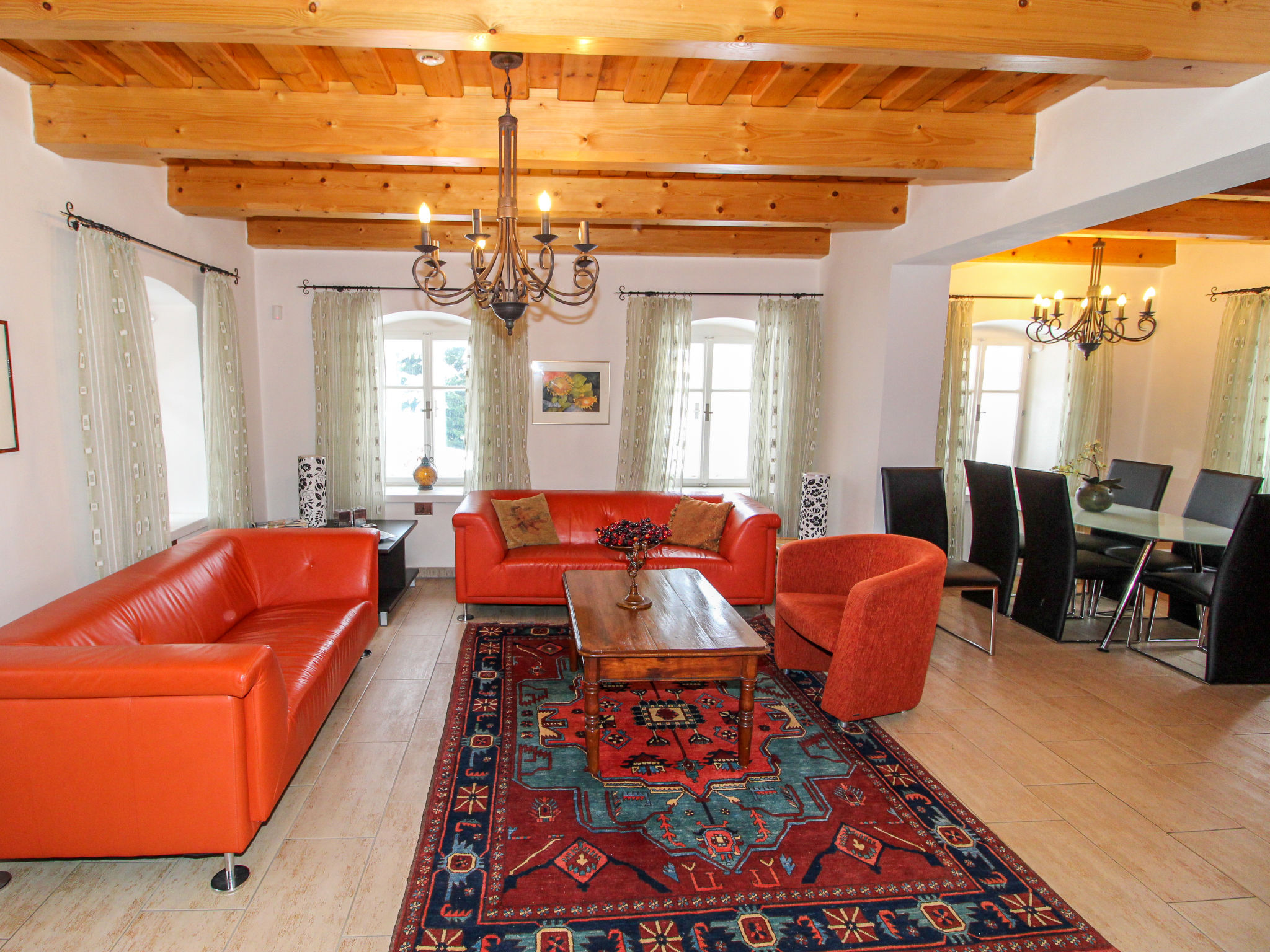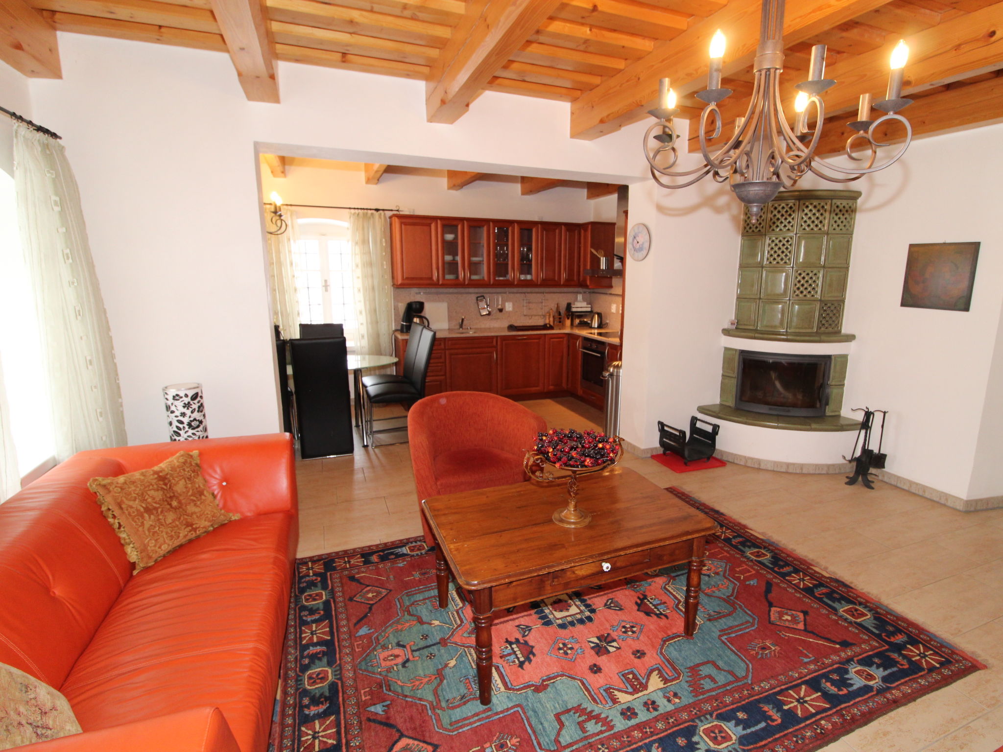 4-Zimmer-Haus 100 m2. Komfortabel und stilvoll eingerichtet: Eingang. Wohnzimmer 34 m2 mit 1 Diwanbett, Schwedenofen und Sat-TV. 1 Zimmer 13 m2 mit 1 Doppelbett und Waschbecken. Kochnische (Backofen, Geschirrspüler, 4 Glaskeramikherd Platten, Wasserkocher, Mikrowelle, Tiefkühler, elektrische Kaffeemaschine) mit Esstisch. Sep. WC. Obergeschoss: 1 Zimmer 32 m2 mit 1 Doppelbett. 1 Zimmer 17 m2 mit 1 Doppelbett. Dusche/WC. E-Heizung, Bodenheizung. Zur Verfügung: Waschmaschine. Internet (Wireless LAN, gratis). Bitte beachten: Nichtraucher-Haus.