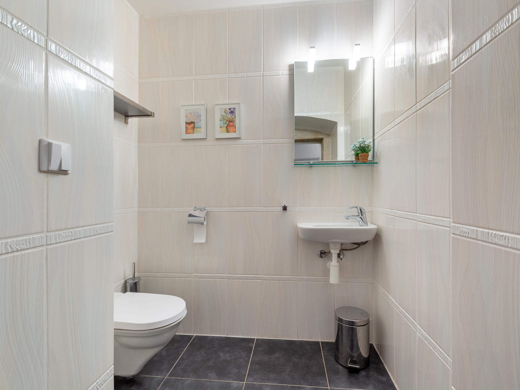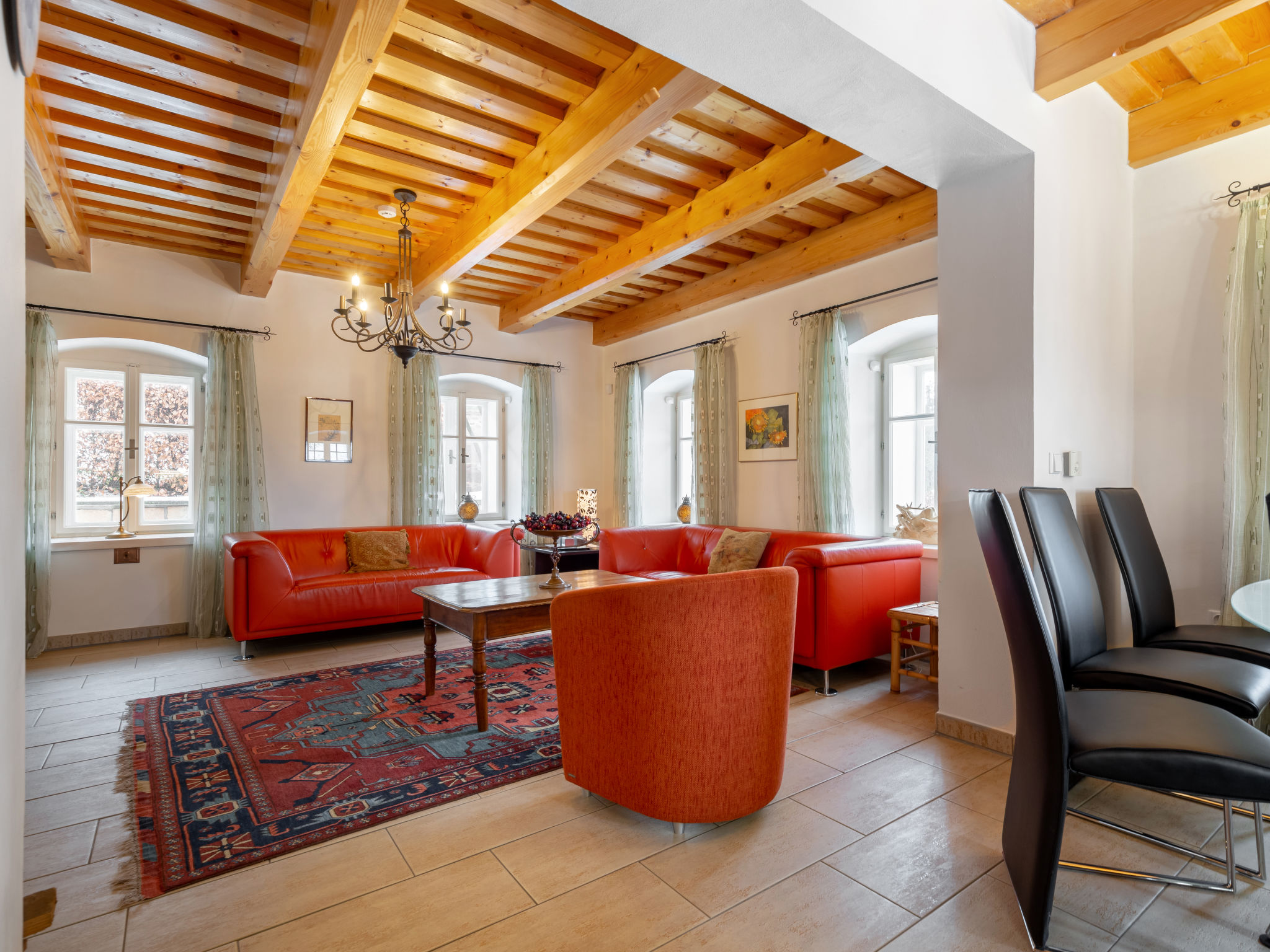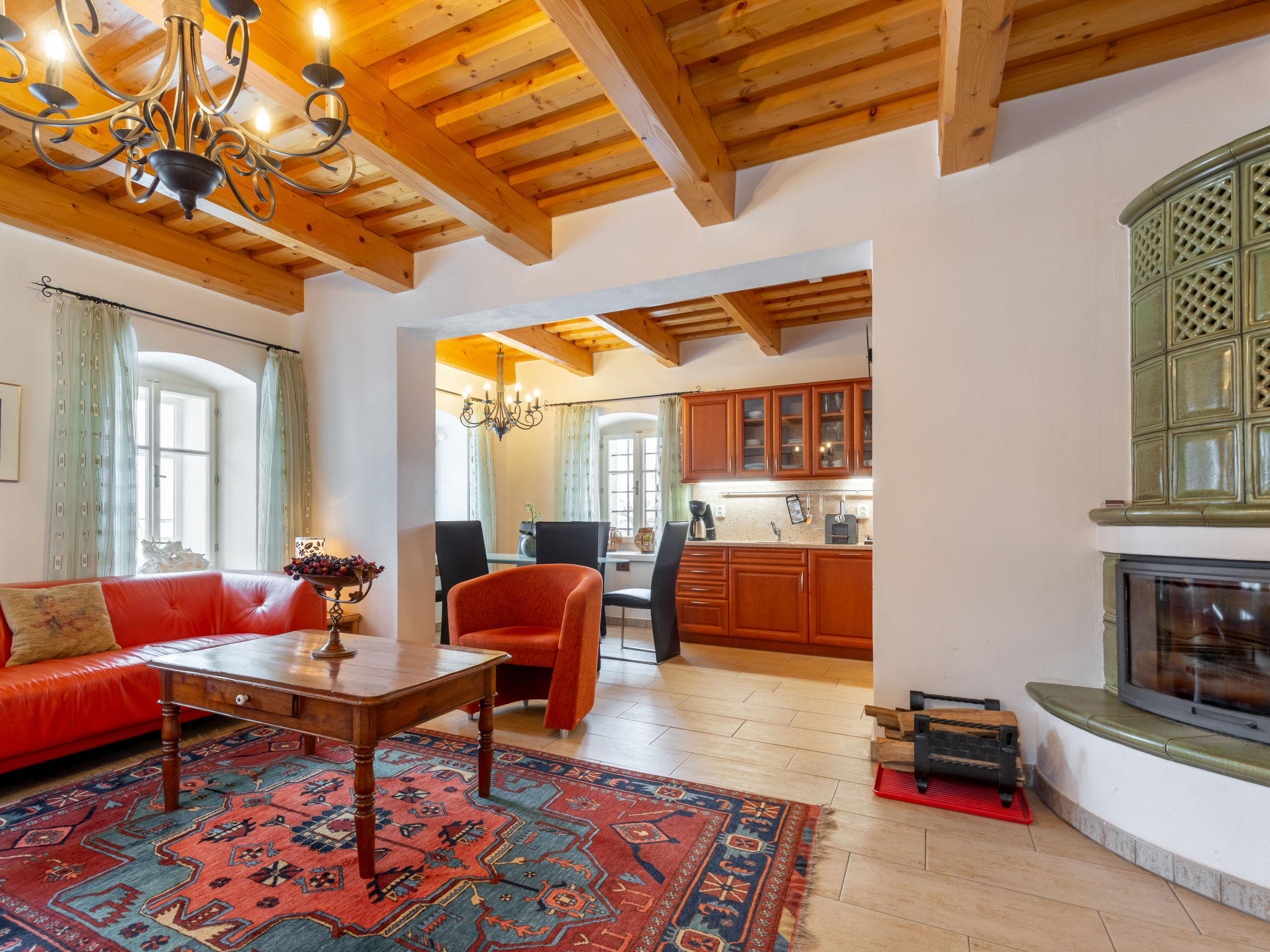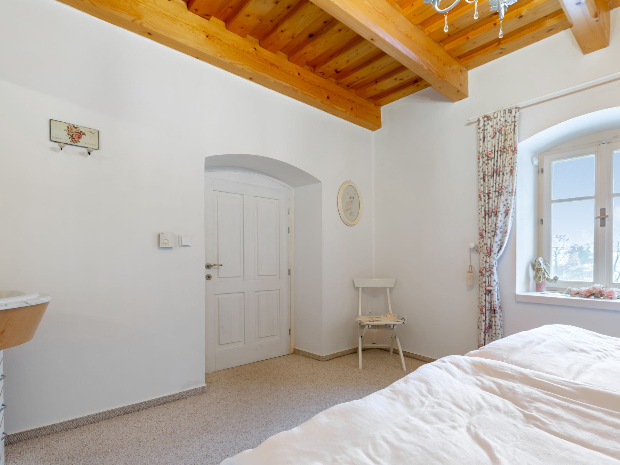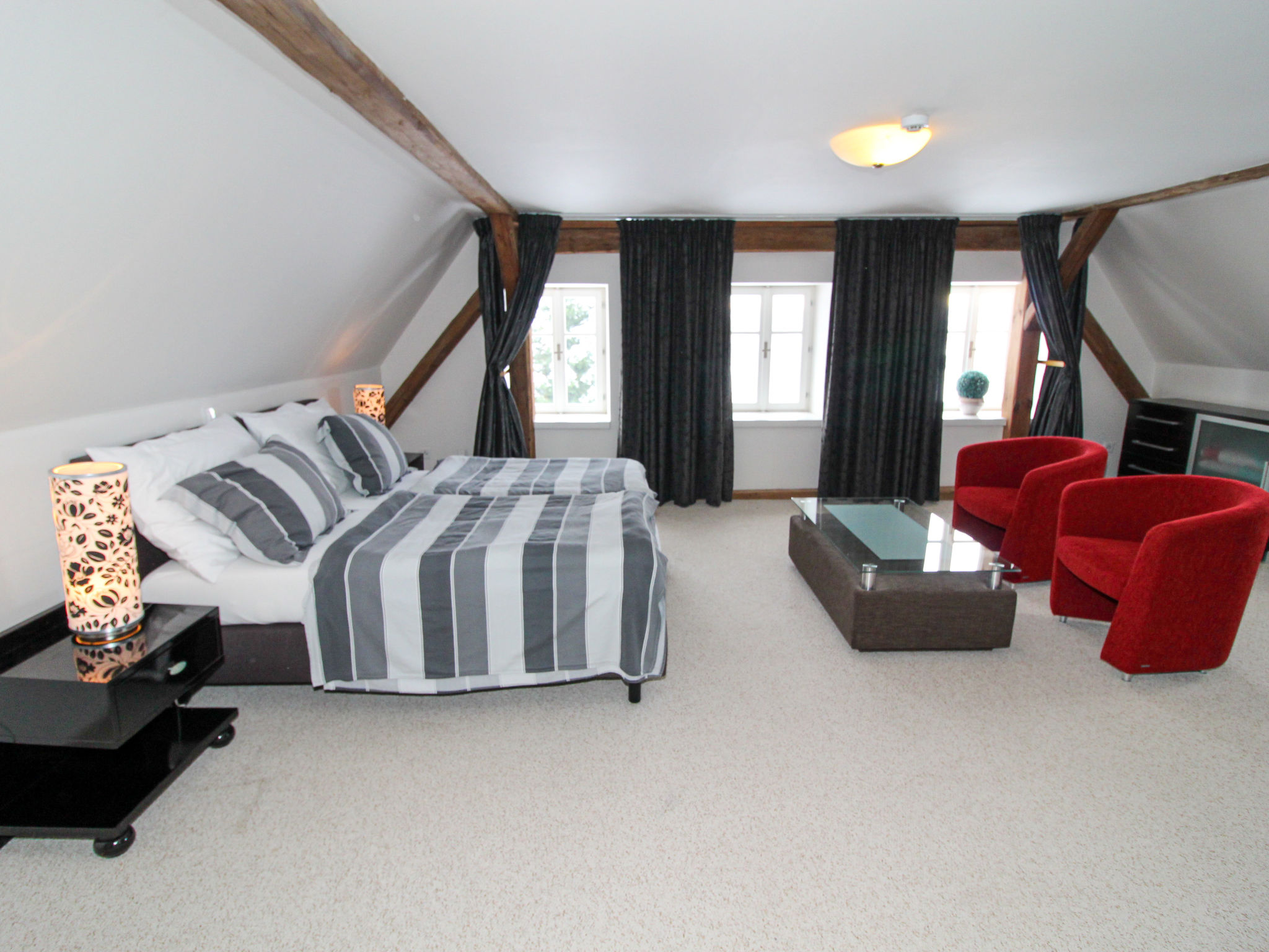 4-Zimmer-Haus 100 m2. Komfortabel und stilvoll eingerichtet: Eingang. Wohnzimmer 34 m2 mit 1 Diwanbett, Schwedenofen und Sat-TV. 1 Zimmer 13 m2 mit 1 Doppelbett und Waschbecken. Kochnische (Backofen, Geschirrspüler, 4 Glaskeramikherd Platten, Wasserkocher, Mikrowelle, Tiefkühler, elektrische Kaffeemaschine) mit Esstisch. Sep. WC. Obergeschoss: 1 Zimmer 32 m2 mit 1 Doppelbett. 1 Zimmer 17 m2 mit 1 Doppelbett. Dusche/WC. E-Heizung, Bodenheizung. Zur Verfügung: Waschmaschine. Internet (Wireless LAN, gratis). Bitte beachten: Nichtraucher-Haus.