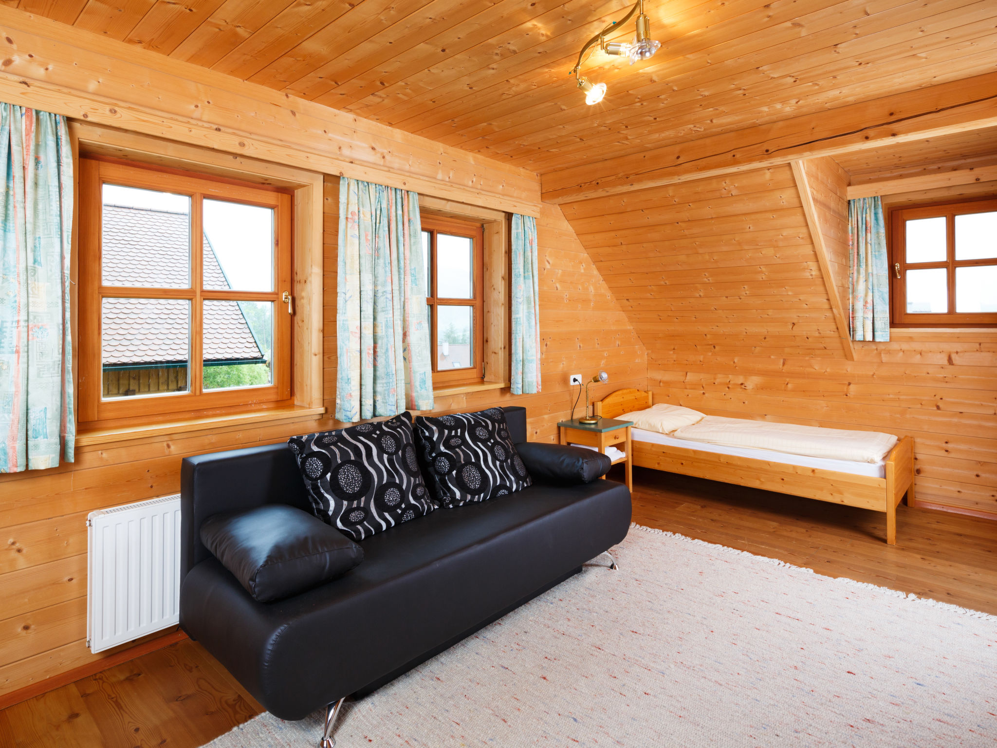 4-Zimmer-Chalet 87 m2 auf 2 Stockwerken. Gemütlich eingerichtet: 1 Doppelzimmer mit Dusche/WC. Wohn-/Esszimmer mit Schwedenofen, Esstisch und Sat-TV (Flachbildschirm), Radio. Offene Küche (Backofen, Geschirrspüler, 4 Glaskeramikherd Platten). Obergeschoss: 1 abgeschrägtes Zimmer mit 1 Diwanbett, 1 Doppelbett und Dusche/WC. 1 Zimmer mit 2 Betten und Dusche/WC. Terrasse. Terrassenmöbel. Sehr schöne Sicht auf das Tal. Zur Verfügung: Telefon. Internet (Wireless LAN, gratis). Parkplatz. 1 Haustier/Hund erlaubt.