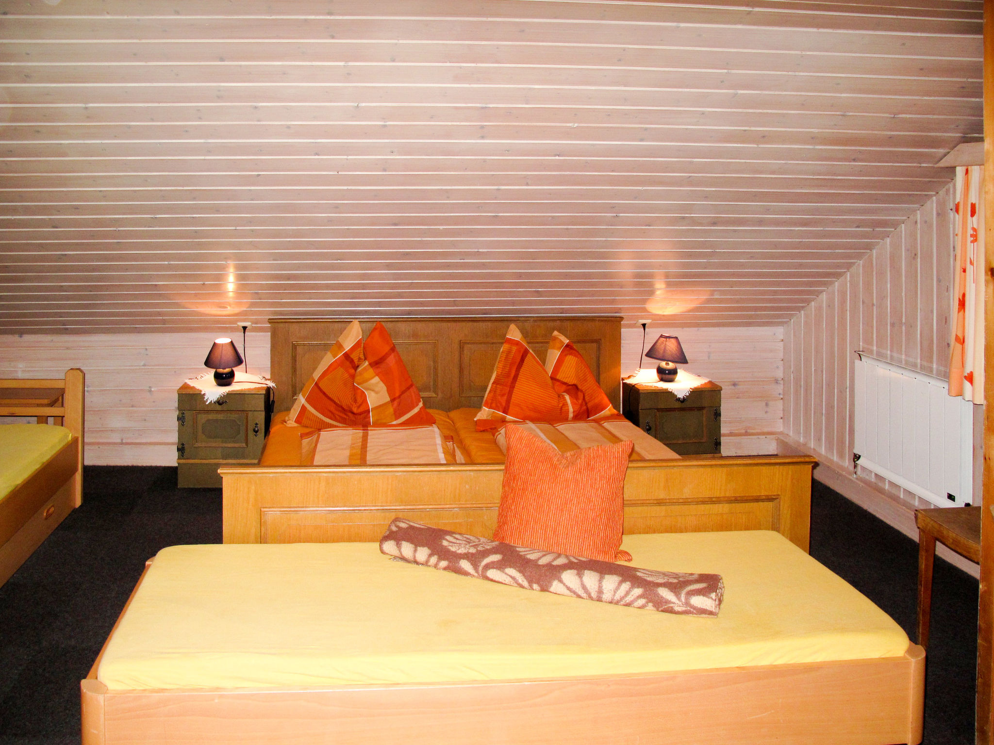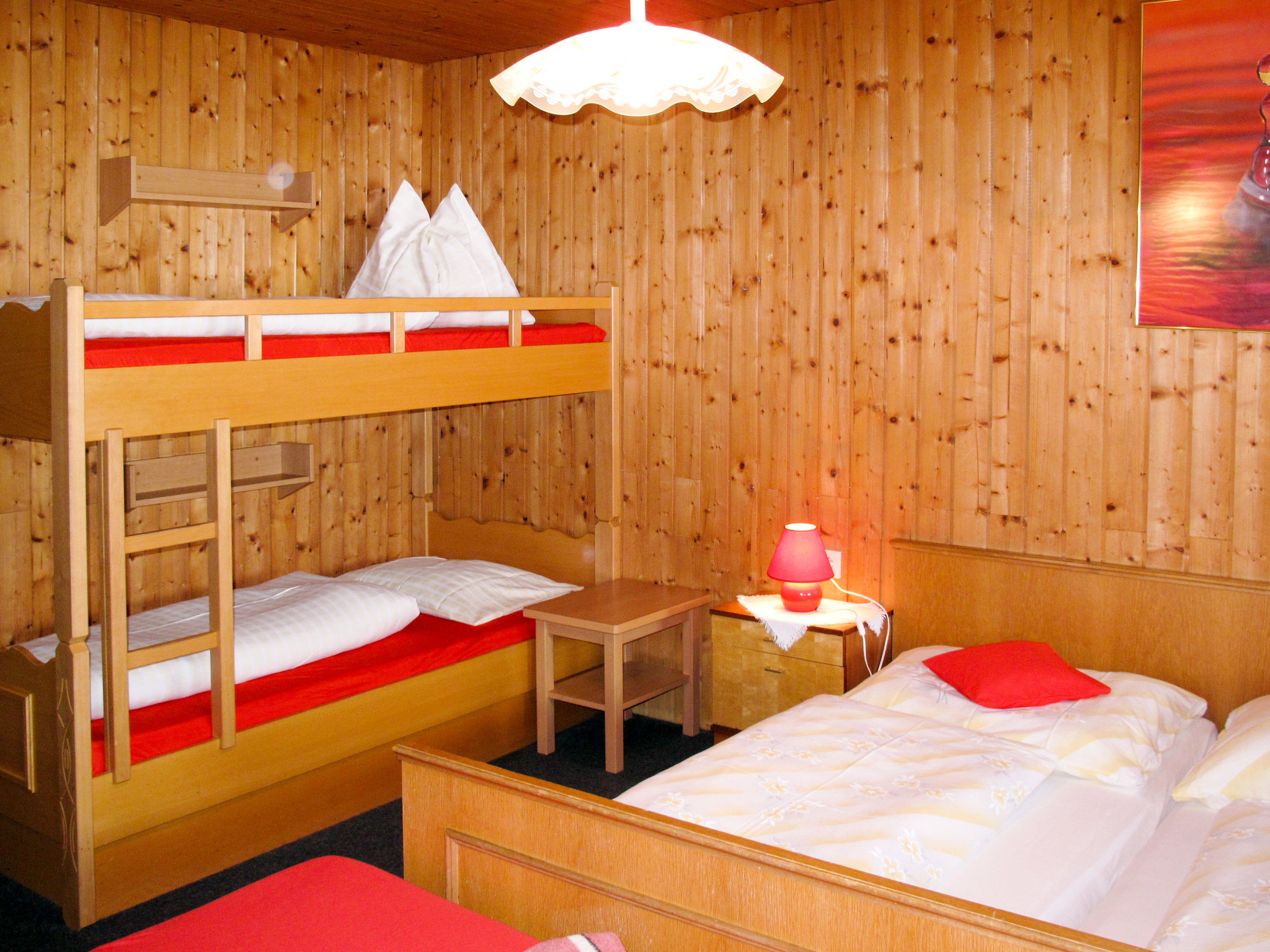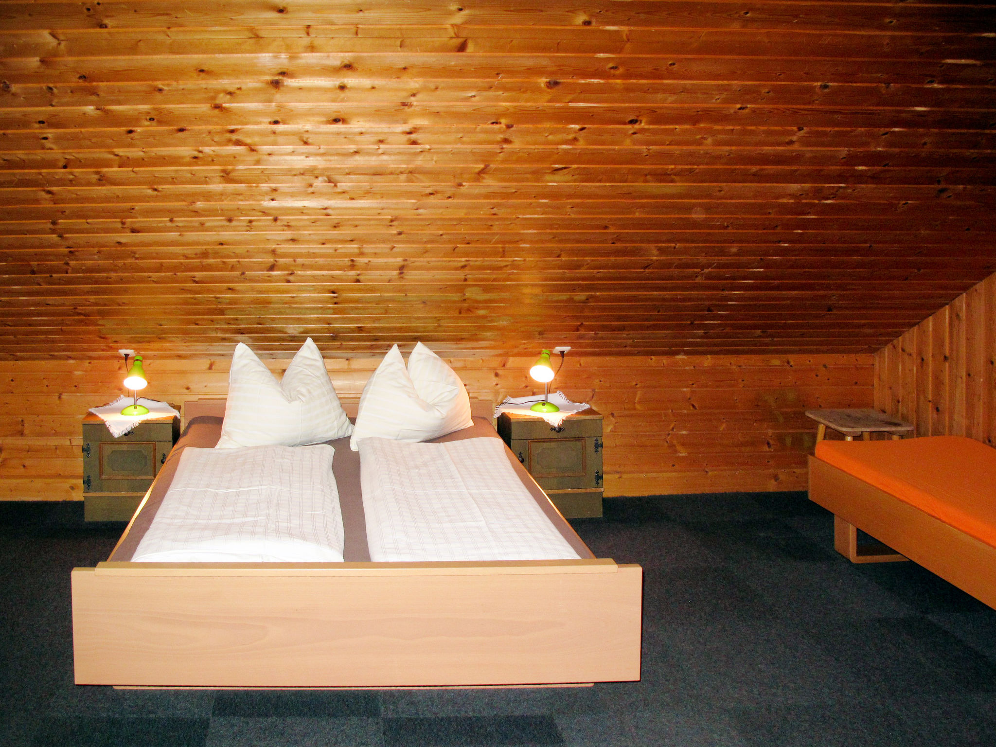 "Moosen (NKI210)", 8-Zimmer-Haus 230 m2 auf 2 Stockwerken. Gemütlich und mit viel Holz eingerichtet: Wohn-/Esszimmer mit Esstisch und Sat-TV. 1 Zimmer mit 1 Doppelbett, Waschbecken und Dusche/WC. Ausgang zum Balkon. Küche (Backofen, Geschirrspüler, 4 Glaskeramikherd Platten, Toaster, Wasserkocher, Mikrowelle, Tiefkühler, elektrische Kaffeemaschine). Ausgang zum Balkon. Sep. WC. Obergeschoss: 2 abgeschrägte Zimmer, jedes Zimmer mit 1 x 2 Etagenbetten, 1 Doppelbett, Waschbecken und Dusche/WC. 2 abgeschrägte Zimmer, jedes Zimmer mit 1 Bett, 1 Doppelbett, Waschbecken und Dusche/WC. 1 abgeschrägtes Zimmer mit 2 Betten, 1 Doppelbett, Waschbecken und Dusche/WC. Ausgang zum Balkon. 1 abgeschrägtes Zimmer mit 1 Bett, 1 Doppelbett, Waschbecken und sep. WC. Dusche. Heizung. Teppichboden. Gartensitzplatz. Gartengrill, Liegestühle. Zur Verfügung: Bügeleisen, Kinderhochstuhl, Babybett. Internet (Wireless LAN, gratis). Bitte beachten: Nichtraucher-Haus. 1 Haustier/Hund erlaubt. 8-Zimmer-Hausteil, 2 Etagen, ca. 230 m². Erdgeschoss: Flur mit Garderobe. Aufenthaltsraum mit Tischen und Bänken für 25 Personen, Kachelofen (nur Dekoration). Küche (4 Ceranfelder, Backofen, Mikrowelle, Geschirrspüler, Kühl-/Gefrierkombination, Kaffeemaschine, Wasserkocher, Toaster), Balkonausgang. Doppelzimmer, Balkonausgang, Dusche/WC. Sep.WC. 1. Etage (teilweise Dachschräge): 2 Schlafzimmer, jeweils mit Doppelbett, Etagenbett, Dusche/WC. 2 Schlafzimmer, jeweils mit Doppelbett, Einzelbett und Dusche/WC. Schlafzimmer mit Doppelbett, 2 Einzelbetten, Balkonausgang, Dusche/WC. Schlafzimmer mit Doppelbett und Einzelbett, sep.WC. Dusche. Bei Belegung mit weniger Personen als der maximalen Personenzahl stehen nicht alle Wohneinheiten zur Verfügung. REG.NR.:506140020282020