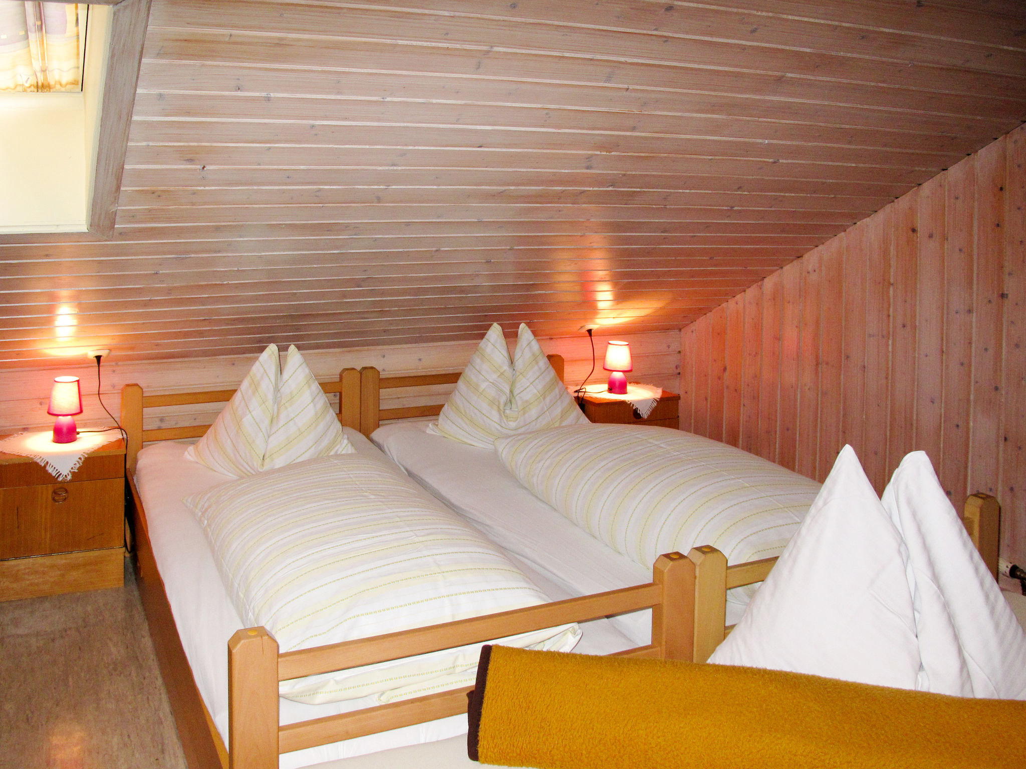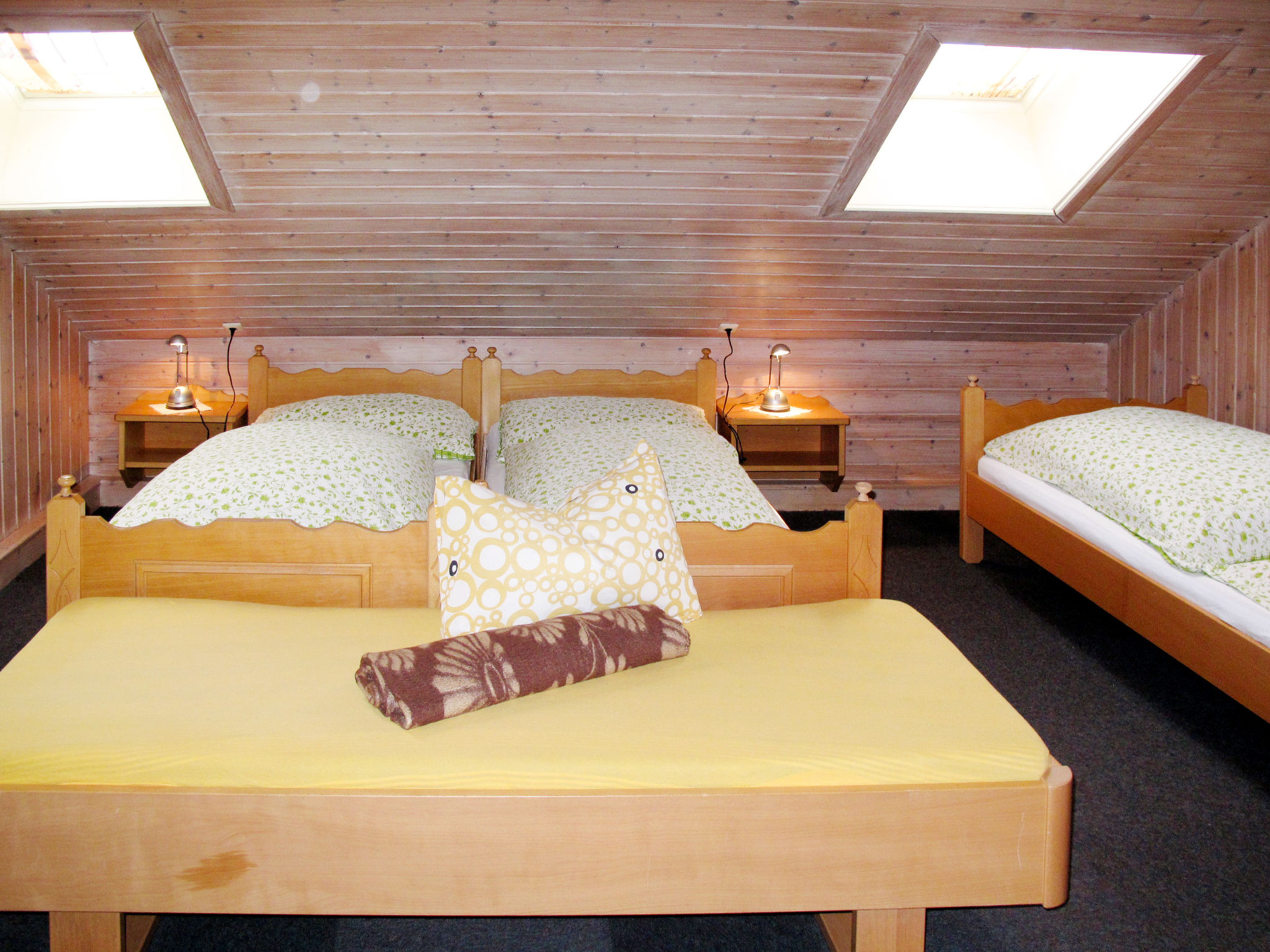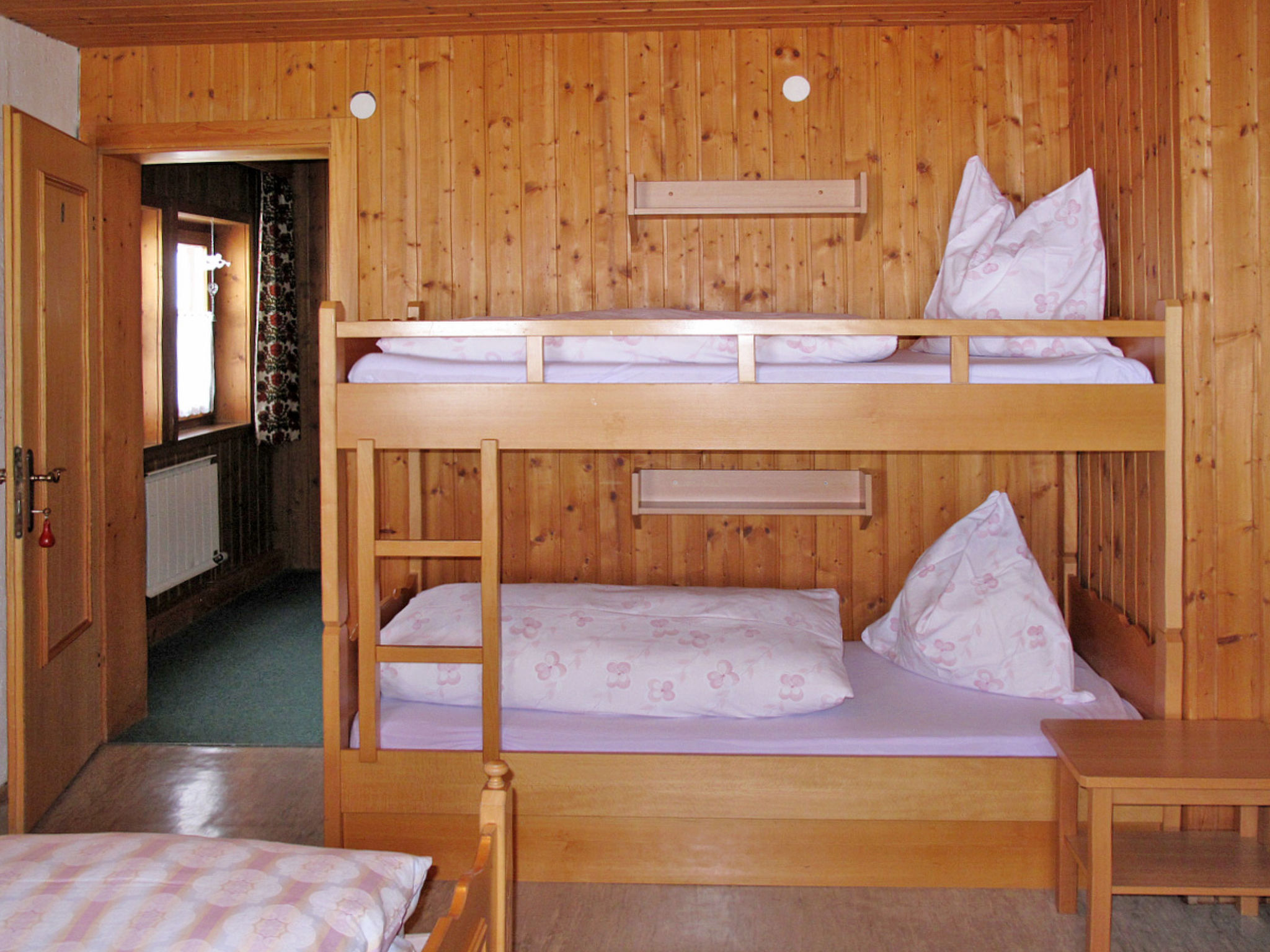 "Moosen (NKI210)", 8-Zimmer-Haus 230 m2 auf 2 Stockwerken. Gemütlich und mit viel Holz eingerichtet: Wohn-/Esszimmer mit Esstisch und Sat-TV. 1 Zimmer mit 1 Doppelbett, Waschbecken und Dusche/WC. Ausgang zum Balkon. Küche (Backofen, Geschirrspüler, 4 Glaskeramikherd Platten, Toaster, Wasserkocher, Mikrowelle, Tiefkühler, elektrische Kaffeemaschine). Ausgang zum Balkon. Sep. WC. Obergeschoss: 2 abgeschrägte Zimmer, jedes Zimmer mit 1 x 2 Etagenbetten, 1 Doppelbett, Waschbecken und Dusche/WC. 2 abgeschrägte Zimmer, jedes Zimmer mit 1 Bett, 1 Doppelbett, Waschbecken und Dusche/WC. 1 abgeschrägtes Zimmer mit 2 Betten, 1 Doppelbett, Waschbecken und Dusche/WC. Ausgang zum Balkon. 1 abgeschrägtes Zimmer mit 1 Bett, 1 Doppelbett, Waschbecken und sep. WC. Dusche. Heizung. Teppichboden. Gartensitzplatz. Gartengrill, Liegestühle. Zur Verfügung: Bügeleisen, Kinderhochstuhl, Babybett. Internet (Wireless LAN, gratis). Bitte beachten: Nichtraucher-Haus. 1 Haustier/Hund erlaubt. 8-Zimmer-Hausteil, 2 Etagen, ca. 230 m². Erdgeschoss: Flur mit Garderobe. Aufenthaltsraum mit Tischen und Bänken für 25 Personen, Kachelofen (nur Dekoration). Küche (4 Ceranfelder, Backofen, Mikrowelle, Geschirrspüler, Kühl-/Gefrierkombination, Kaffeemaschine, Wasserkocher, Toaster), Balkonausgang. Doppelzimmer, Balkonausgang, Dusche/WC. Sep.WC. 1. Etage (teilweise Dachschräge): 2 Schlafzimmer, jeweils mit Doppelbett, Etagenbett, Dusche/WC. 2 Schlafzimmer, jeweils mit Doppelbett, Einzelbett und Dusche/WC. Schlafzimmer mit Doppelbett, 2 Einzelbetten, Balkonausgang, Dusche/WC. Schlafzimmer mit Doppelbett und Einzelbett, sep.WC. Dusche. Bei Belegung mit weniger Personen als der maximalen Personenzahl stehen nicht alle Wohneinheiten zur Verfügung. REG.NR.:506140020282020