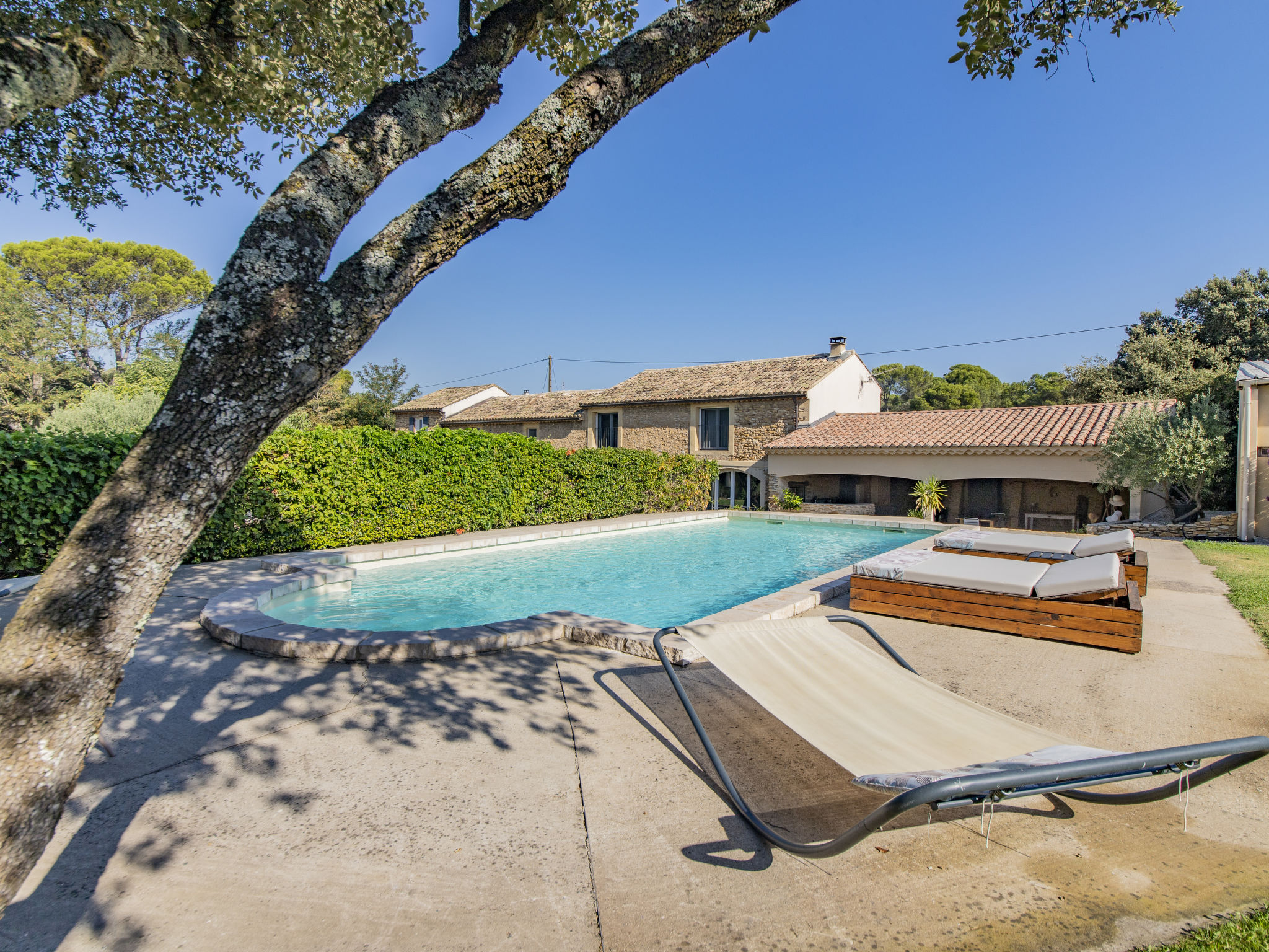 Mas/Landhaus "des Buis", renoviert im Jahre 2016. Im Ort, 1.5 km vom Zentrum von Uchaux. Zur Alleinbenutzung: Grundstück 4'500 m2 (eingezäunt), Schwimmbad (10 x 5 m, 140 - 140 cm tief, 01.06.-30.09.). Parkplatz auf dem Grundstück. Einkaufsgeschäft 1.5 km, Supermarkt 5 km, Restaurant 500 m, Bäckerei 150 m. Nahe gelegene Sehenswürdigkeiten: Orange 8 km, Vaison la Romaine 32 km, Avignon 41 km, Mont Ventoux 62 km. Bitte beachten: Fahrzeug empfohlen. Geeignet für Familien. Pool-Haus von 80m² mit kompletter Sommerküche (Kühlschrank, Kochplatten, Grill) und WC.